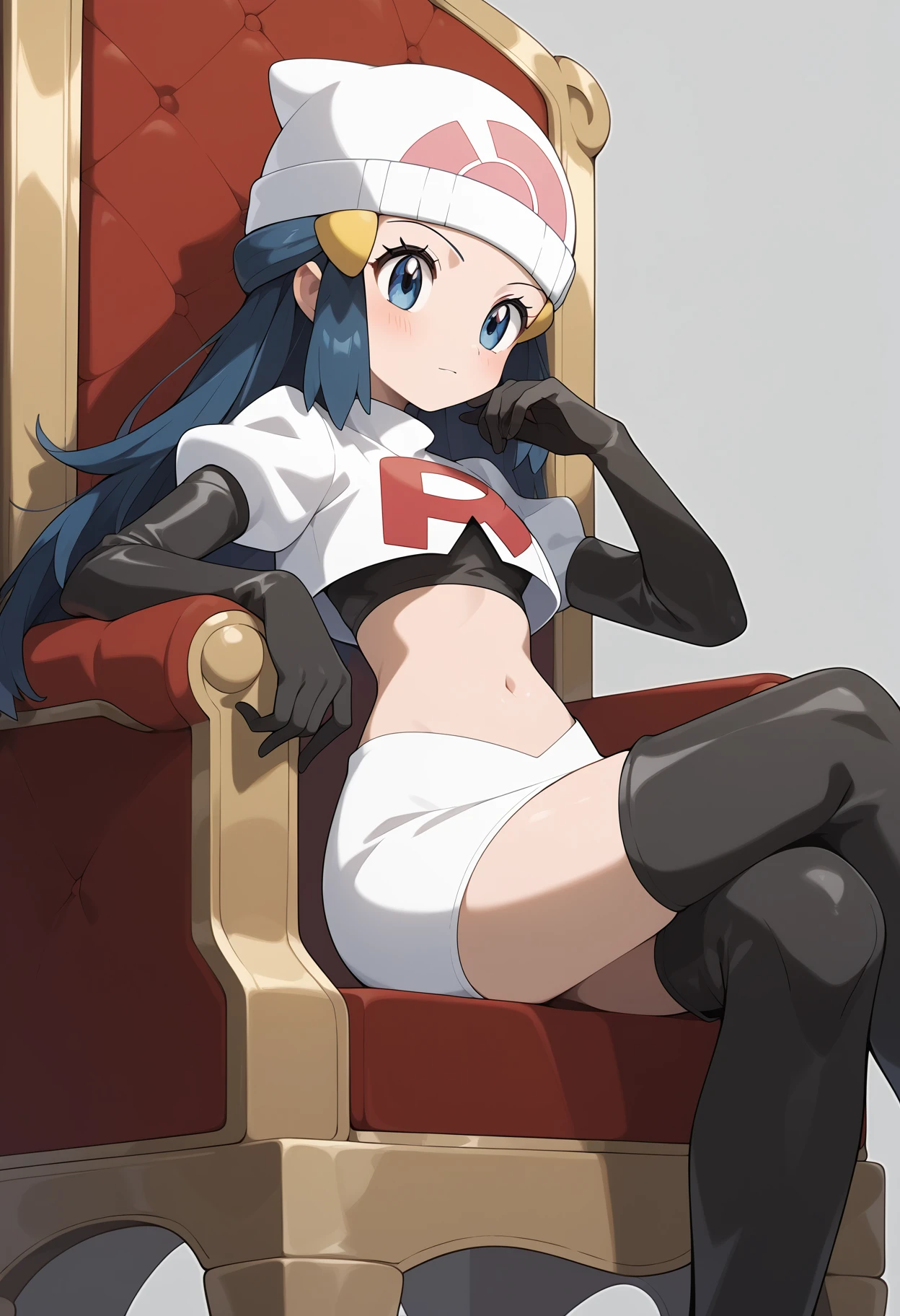 outfit7aadawn, long hair, blue hair, beanie, white headwear, hair ornament, blue eyes, cosplay, team rocket uniform, crop top, white jacket, elbow gloves, black gloves, midriff, miniskirt, white skirt, black thighhighs