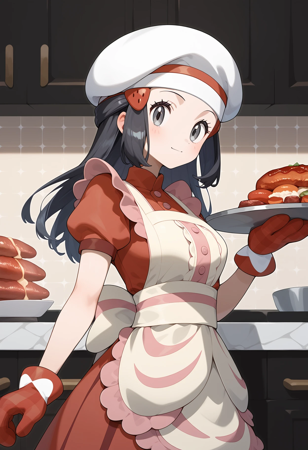 outfit5aadawn, long hair, black hair, hat, white headwear, hair ornament, forehead, grey eyes, breasts, red dress, short sleeves, red mittens, apron, buttons