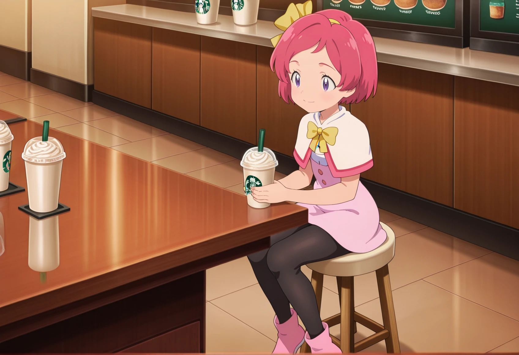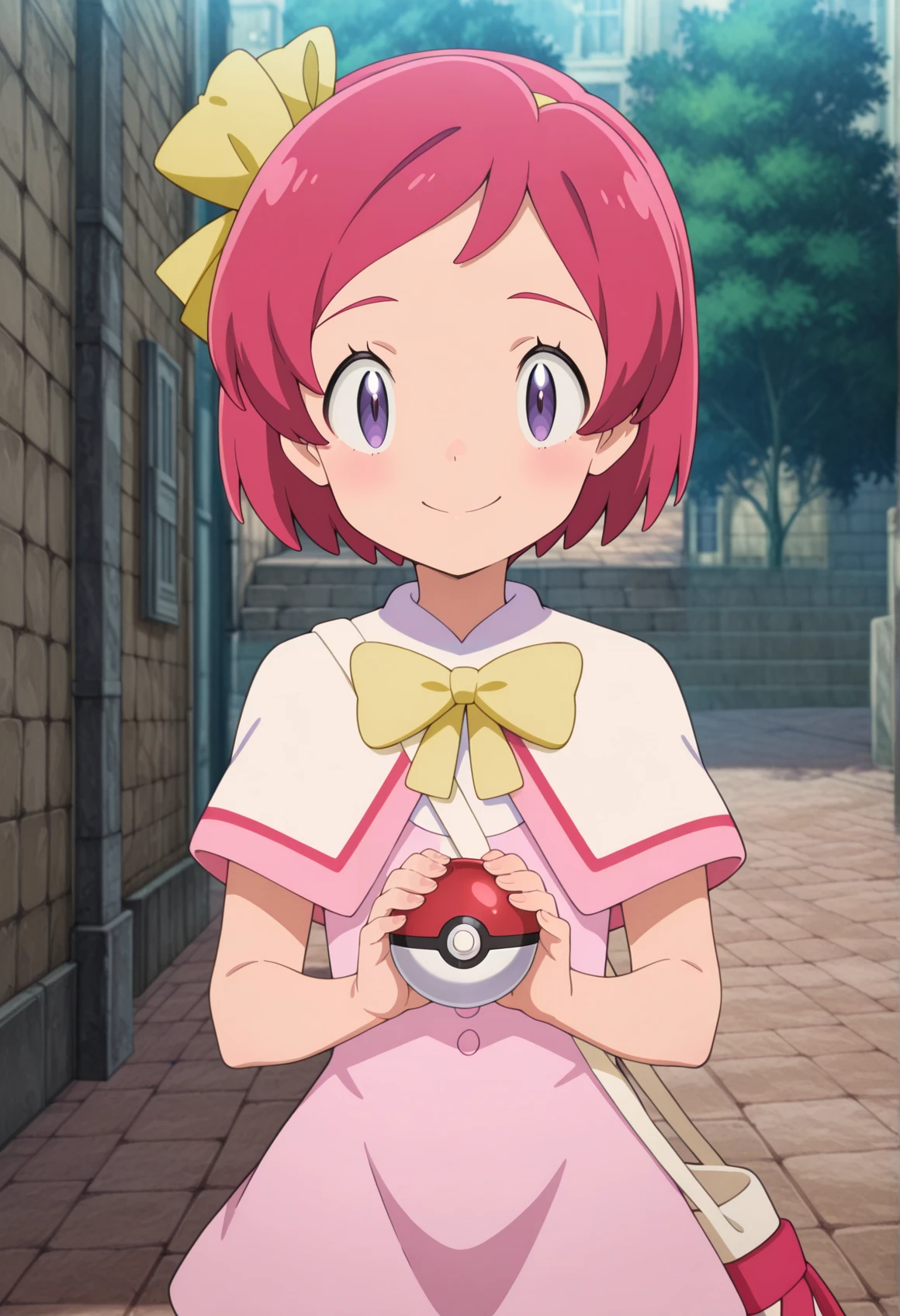 Notable tags: pink hair, short hair, purple eyes, hair ribbon, short dress, capelet, neck ribbon, thighhighs, garter straps,