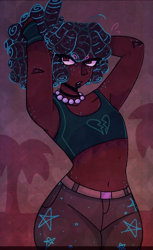 1girl, very dark skin, black hair, cyan hair outline, dreadlocks, tied up hair, ponytail, brown eyes, eyelashes, silver oval eyebrows, teal freckles, teal body freckles, , thin waist, thick thighs