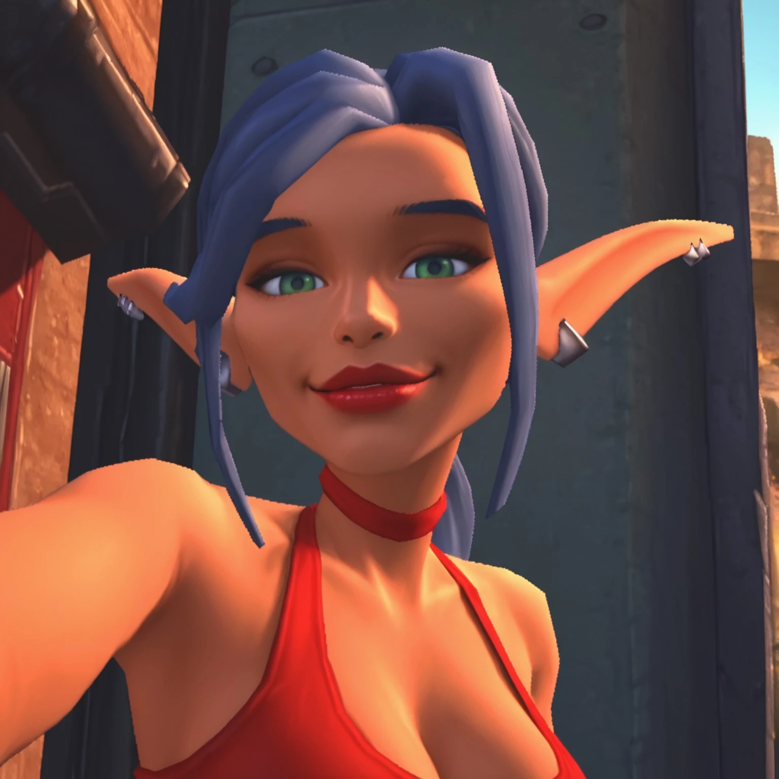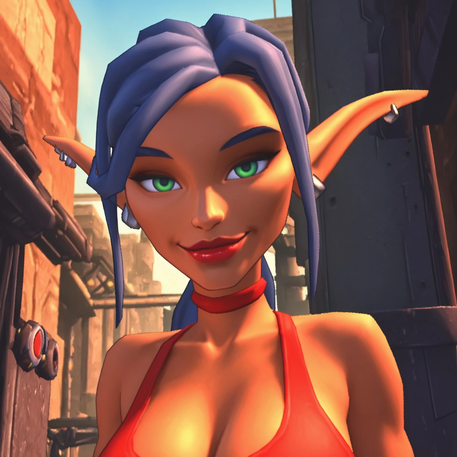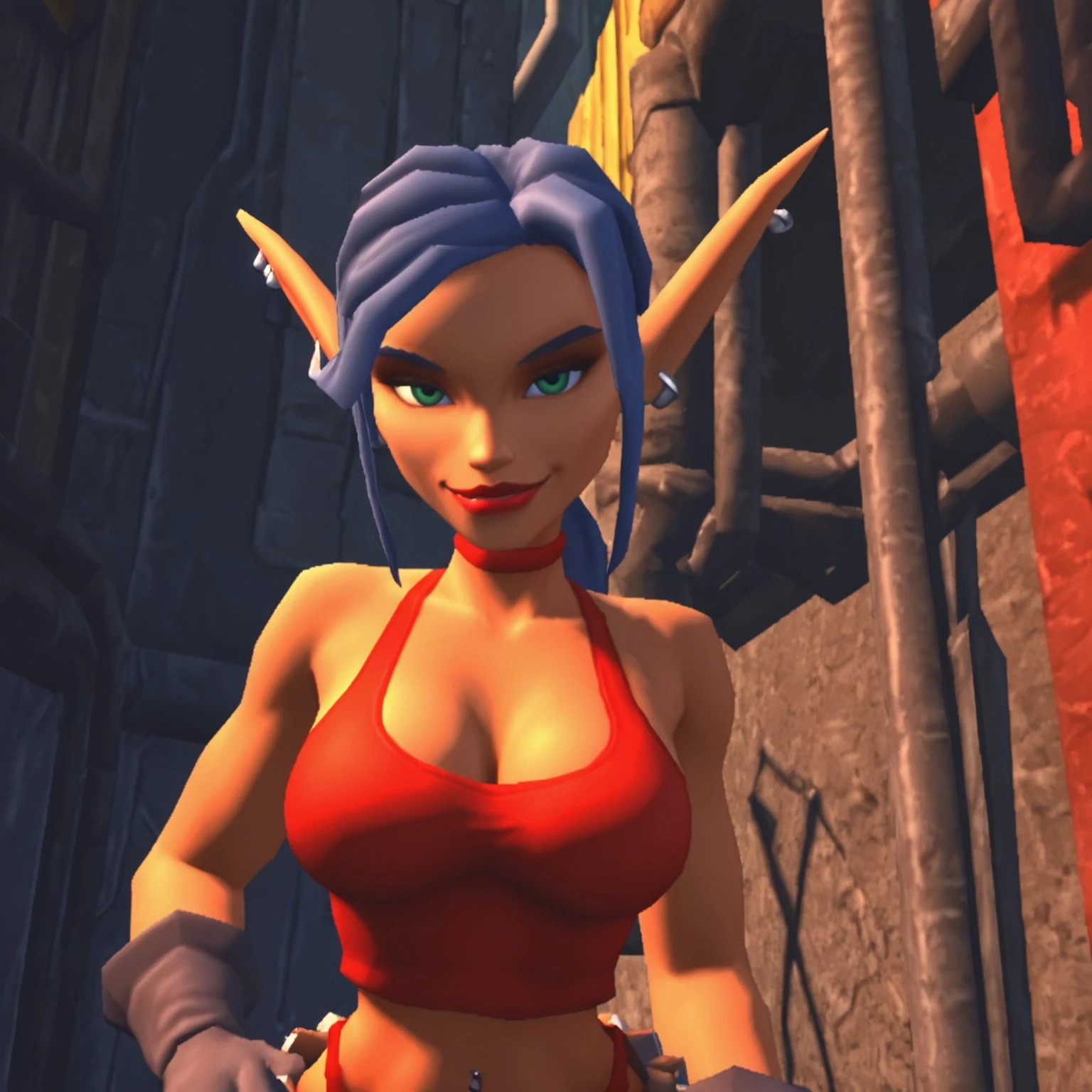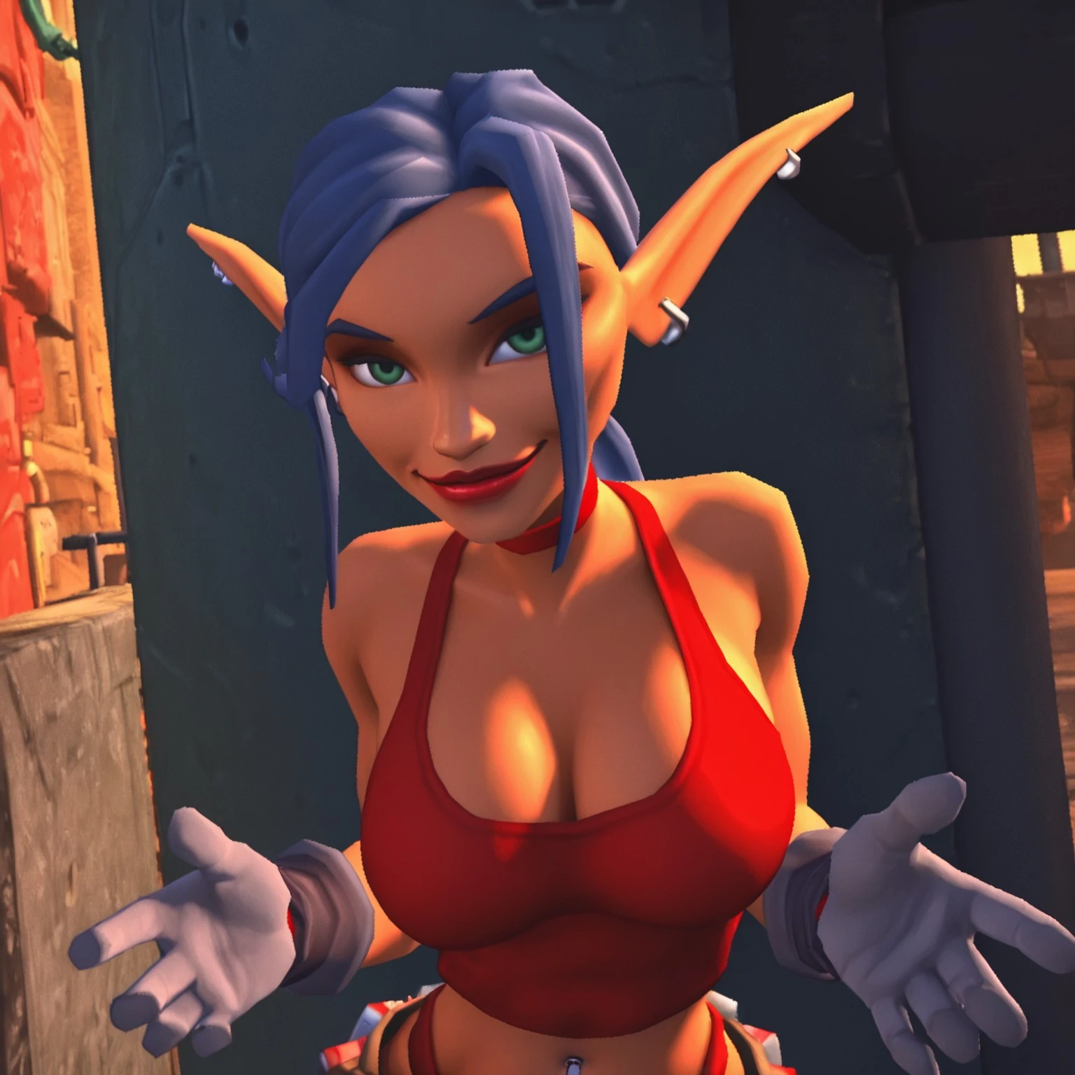 tarynd, mature elf female, green eyes, blue hair with low ponytail, red lips, ear piercings, red choker, short red tanktop, cleavage, grey gloves, pierced bellybutton, red highleg panties, grey pants with brown belt, silver and red kneepads, silver shoes
