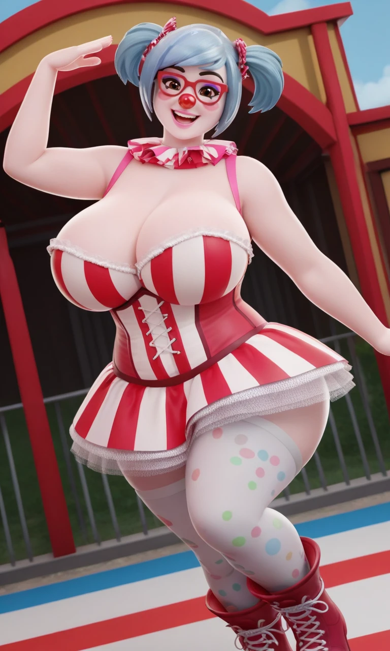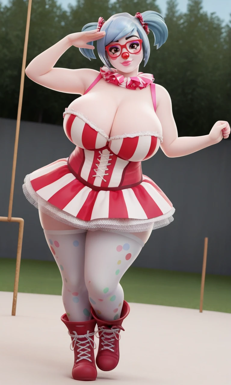 m313f0gcl0w, short hair, twintails, brown eyes, blue hair, makeup, short twintails, lipstick, eyeshadow, red-framed eyewear, facepaint, clown, red clown nose, plump, curvy,