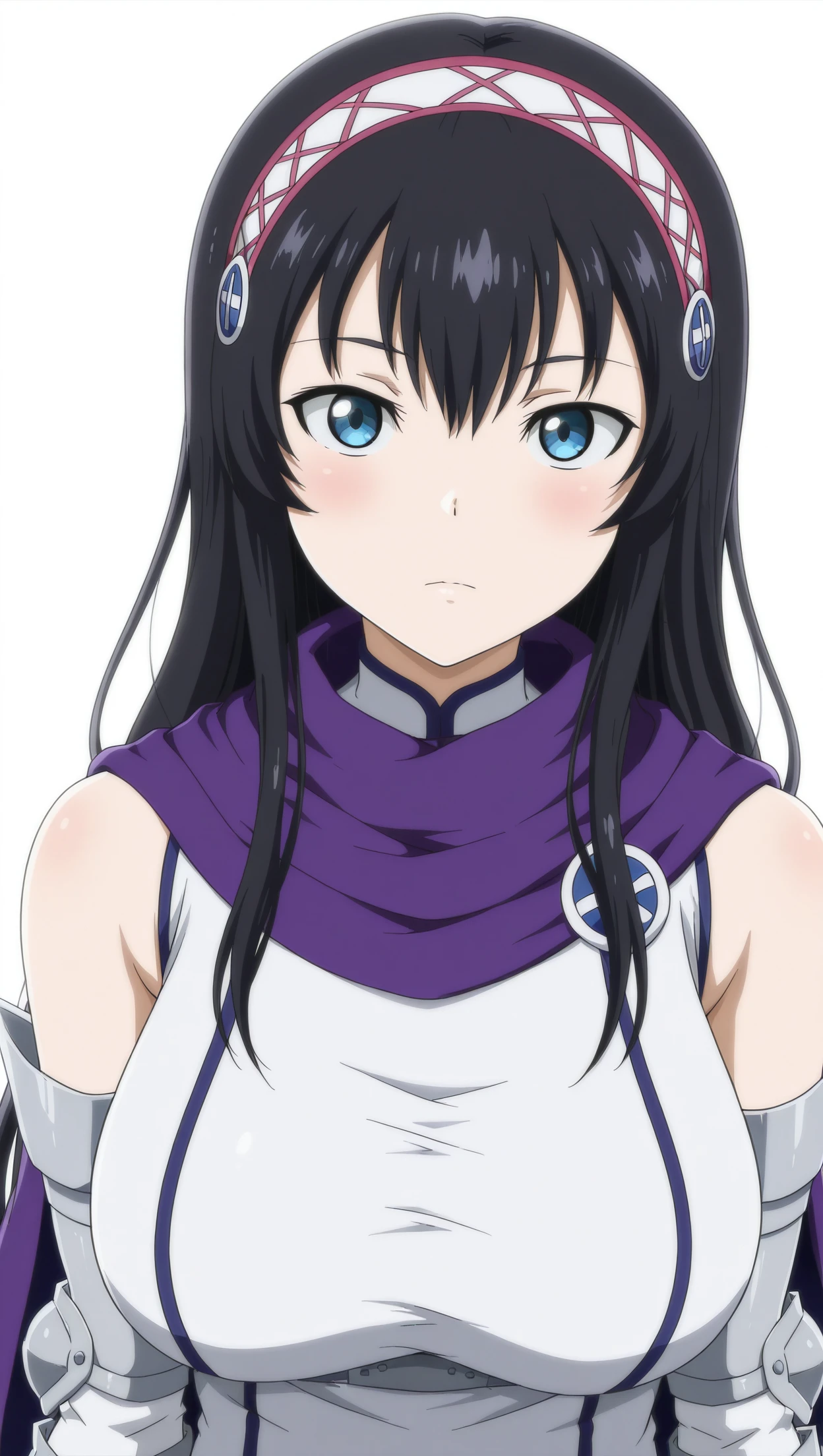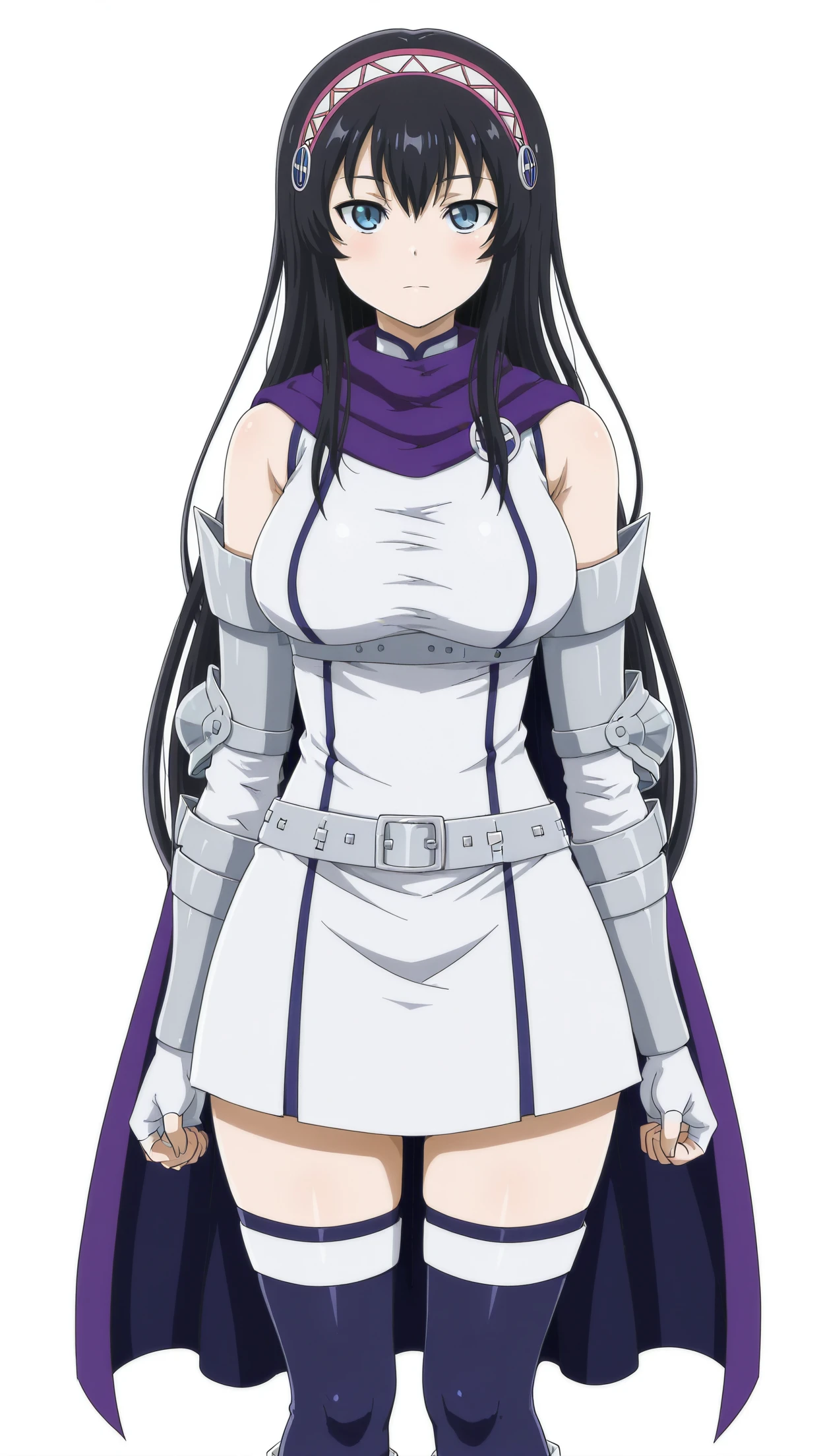 anime coloring, masterpiece, best quality, amazing quality, luv3l14, 1girl, long hair, black hair, blue eyes, ?????????????, headdress, cape, purple cape, dress, white dress, sleeveless dress, clothes pin, armored gloves, elbow gloves, fingerless gloves, belt, thighhighs, blue thighhighs, boots, white footwear, solo, pose, standing, looking at viewer, from front, ((((white background, simple background))))⚙️ Generation Settings