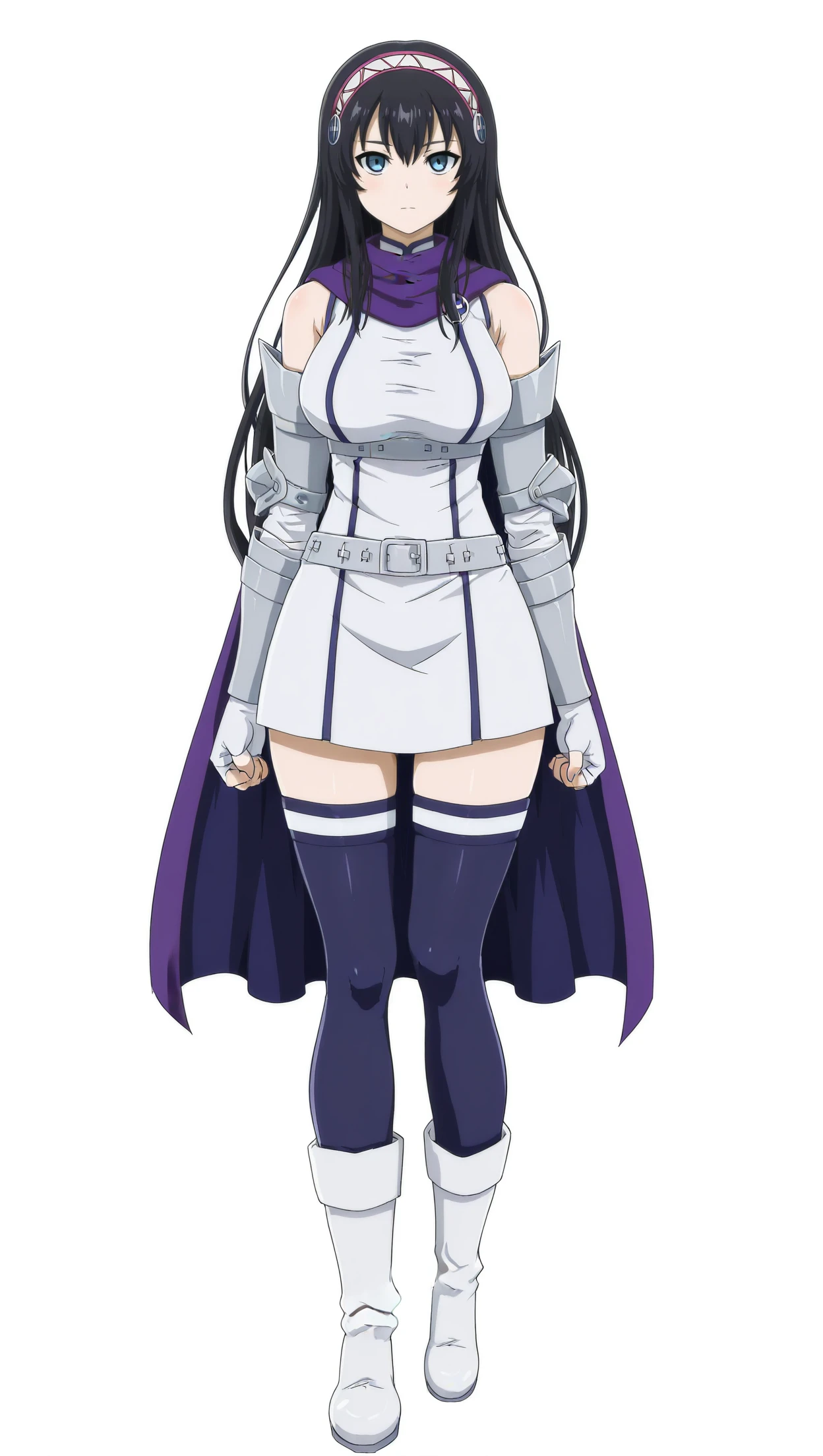 luv3l14, 1girl, long hair, black hair, blue eyes, large breasts, headdress, cape, purple cape, dress, white dress, sleeveless dress, clothes pin, armored gloves, elbow gloves, fingerless gloves, belt, thighhighs, blue thighhighs, boots, white footwear