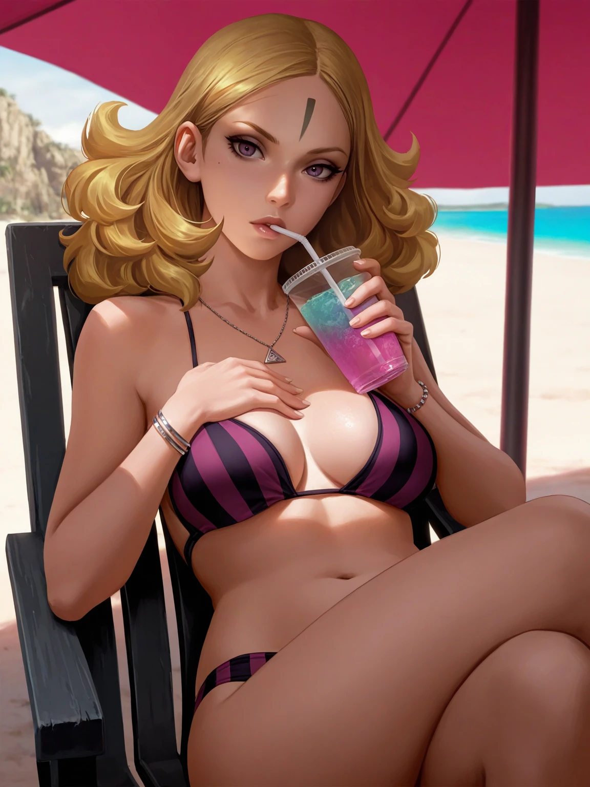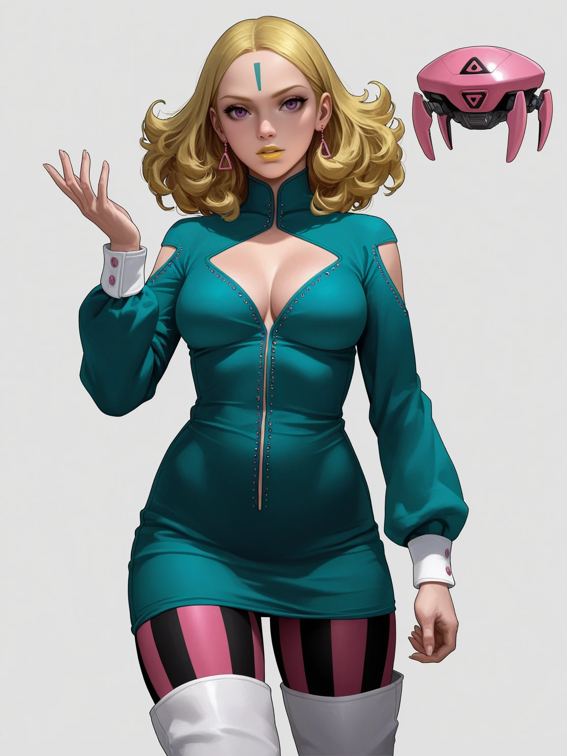 tbvdelta, 1girl, blonde hair, medium hair, wavy hair, earrings, purple eyes, yellow eyeshadow, yellow lips