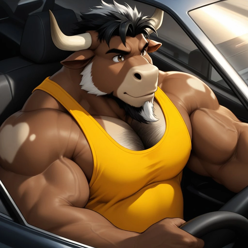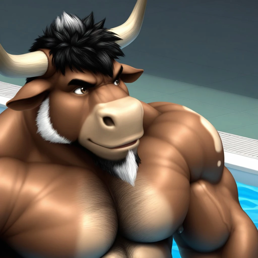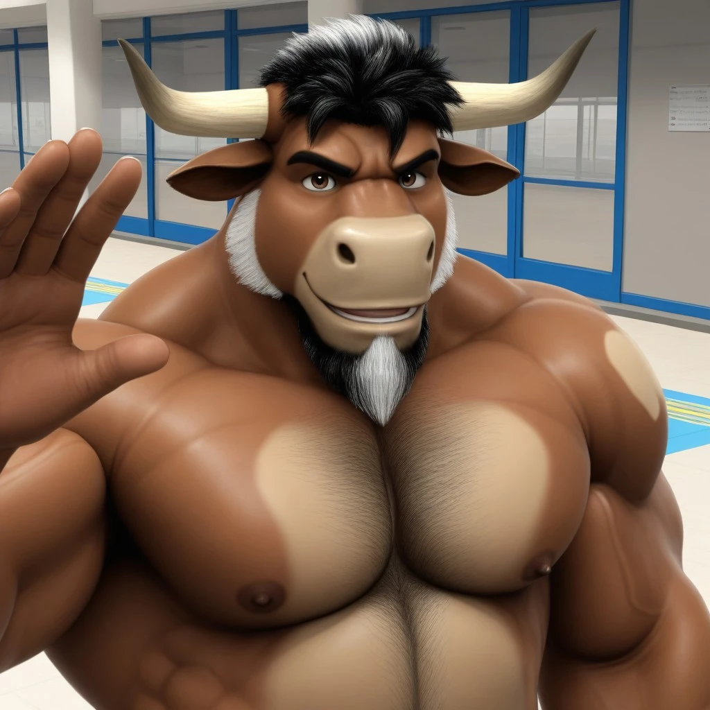 Key words: Sam, bull, solo, brown skin, muscular, huge arms, huge thighs, muscle gut, horns, salt and pepper goatee, mix of white and black hair, tan mark down stomach (please take this specific detail with a grain of salt), hair, tail, brown eyes, very tall, , muscular pectorals.
