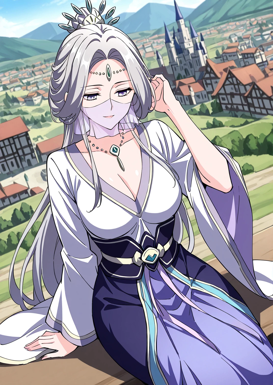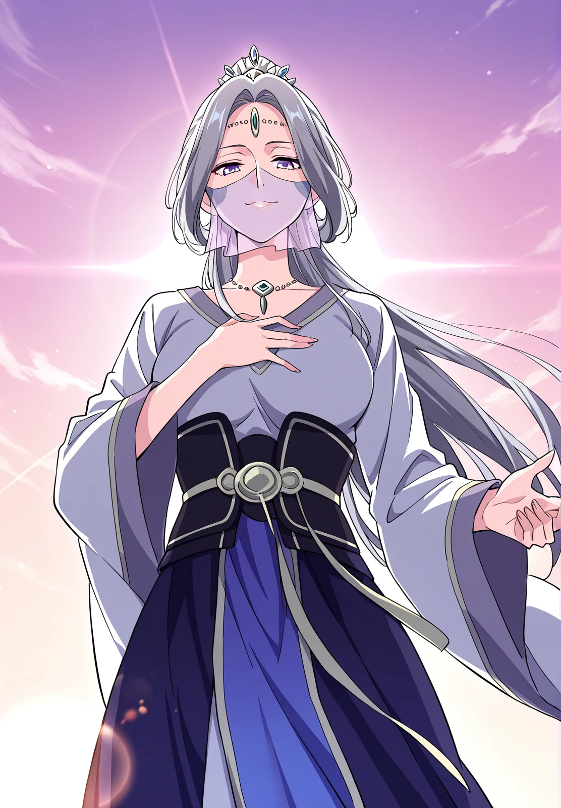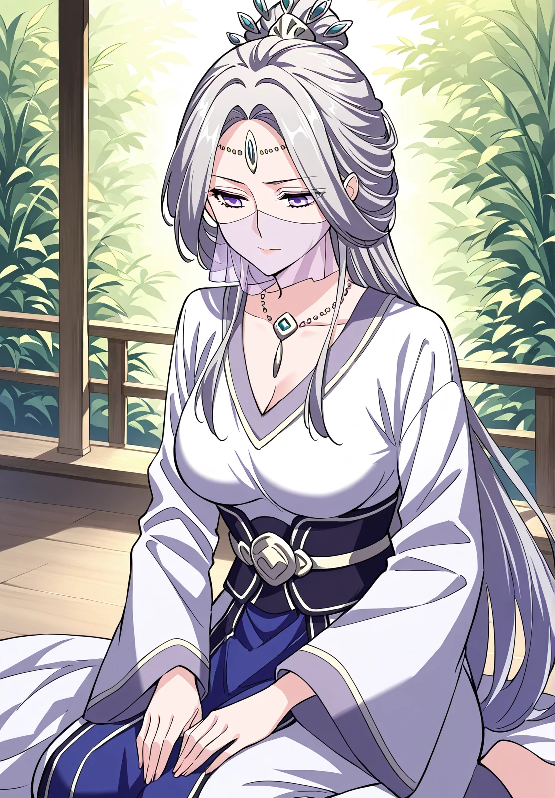 1 girl, solo, mature woman, silver hair, long hair, straight hair, hair ornament, hair crown, forehead jewel, mask, purple eyes, face veil,