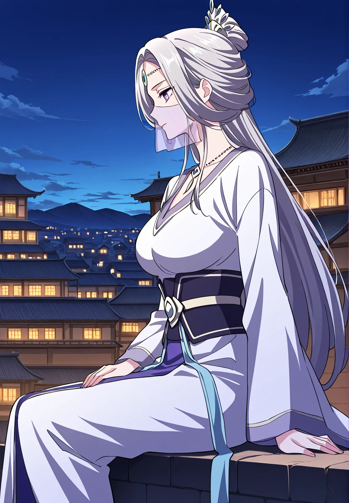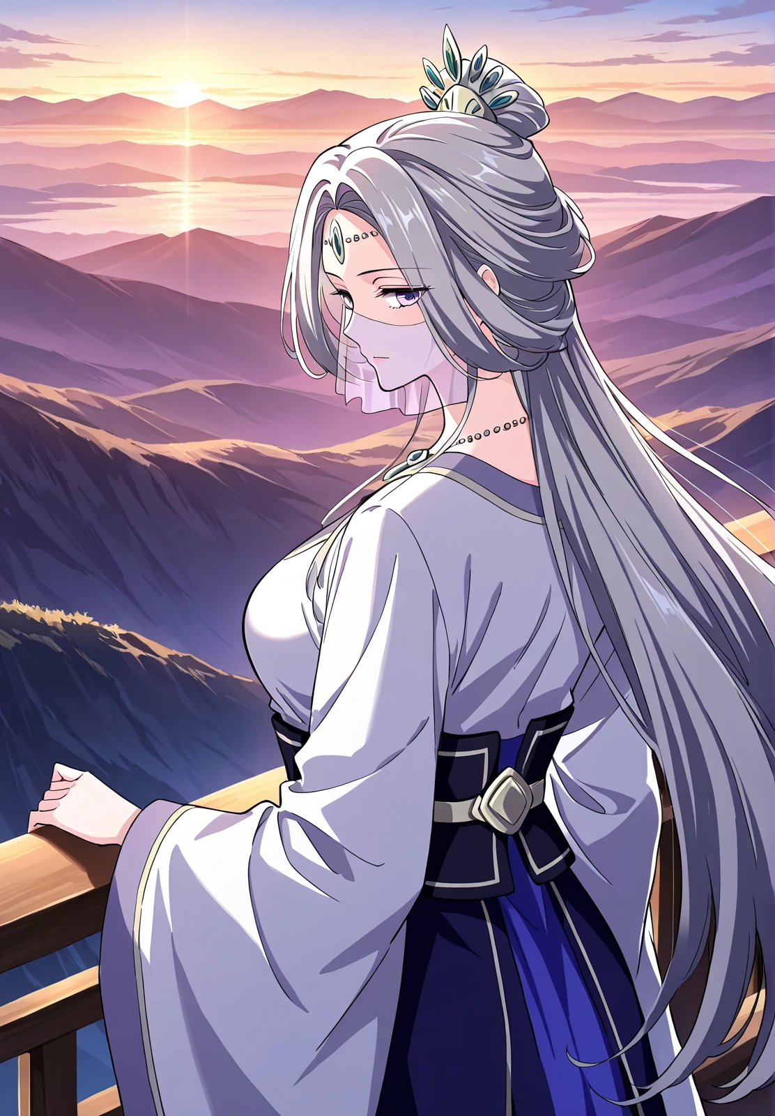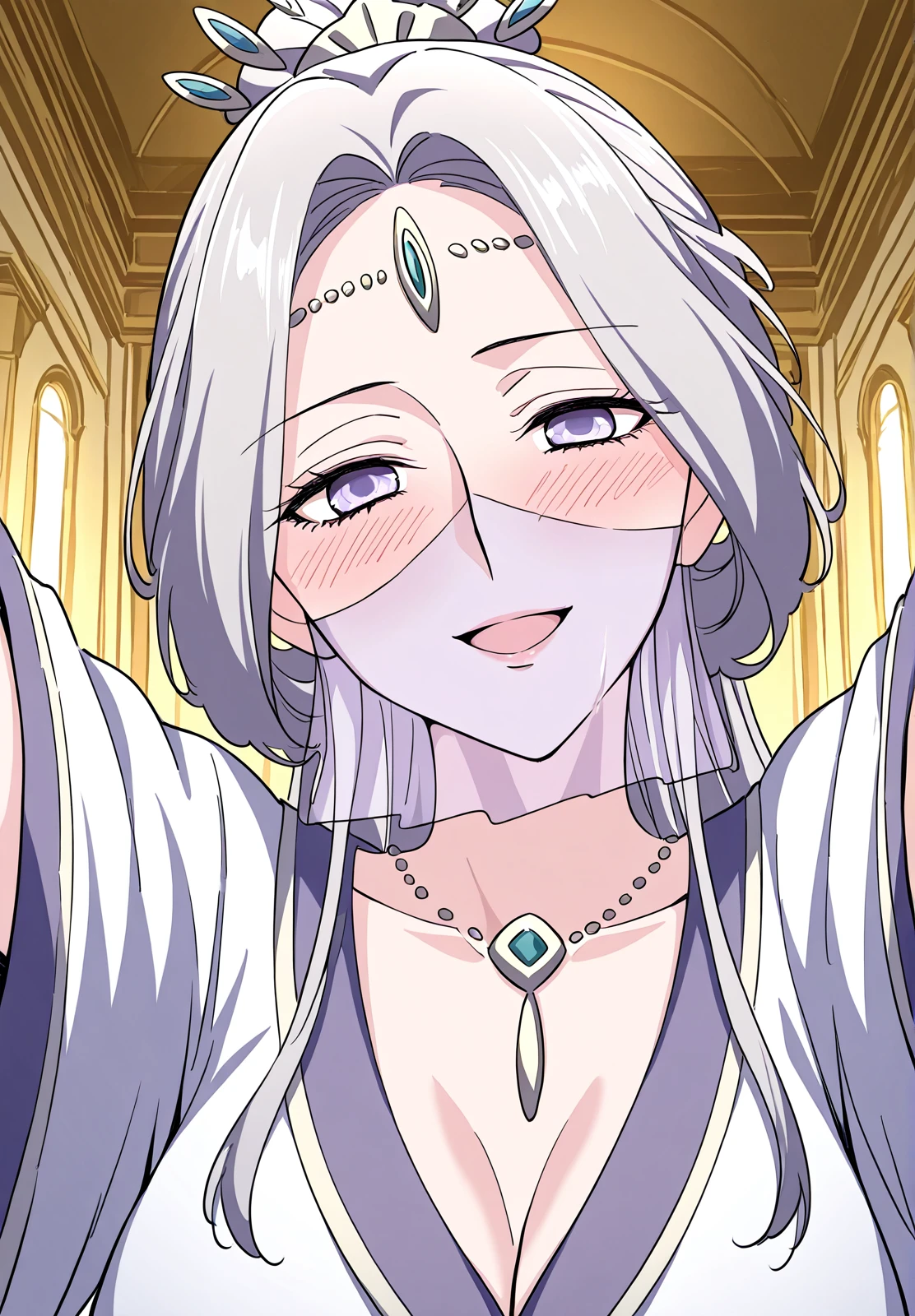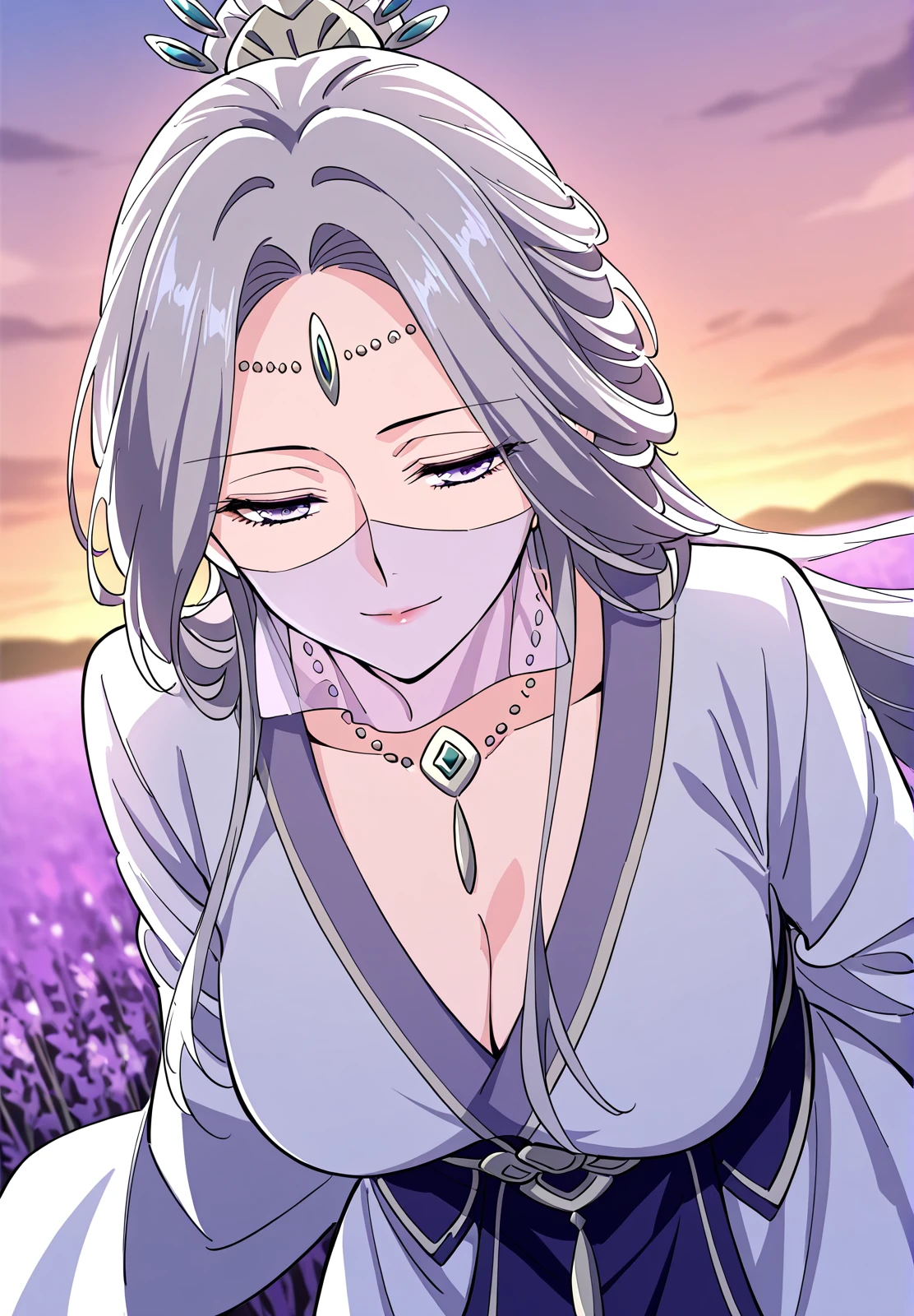 1 girl, solo, mature woman, silver hair, long hair, straight hair, hair ornament, hair crown, forehead jewel, mask, purple eyes, face veil,
