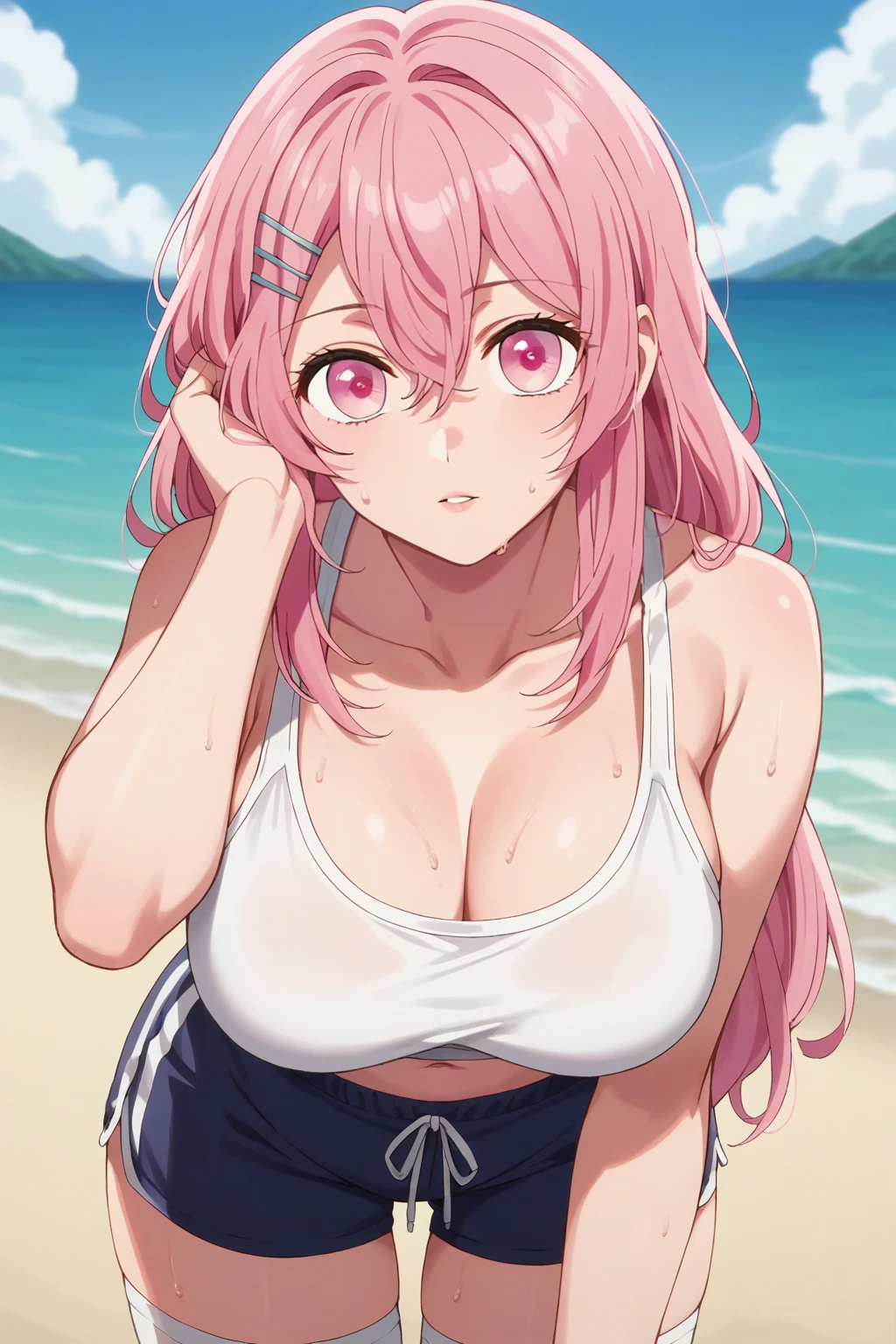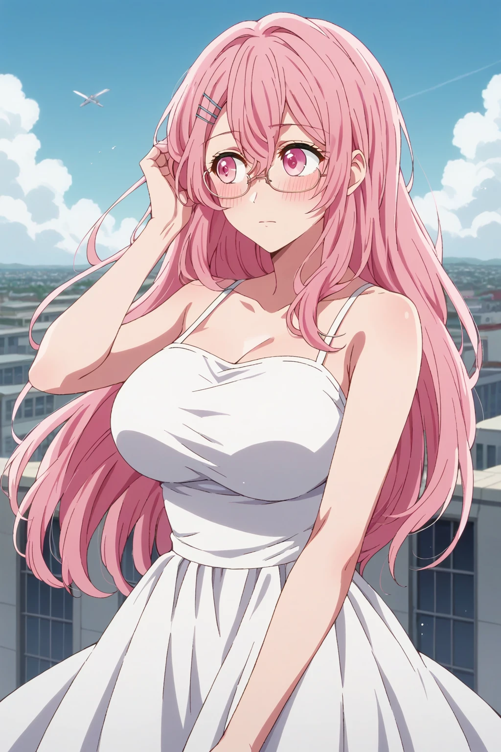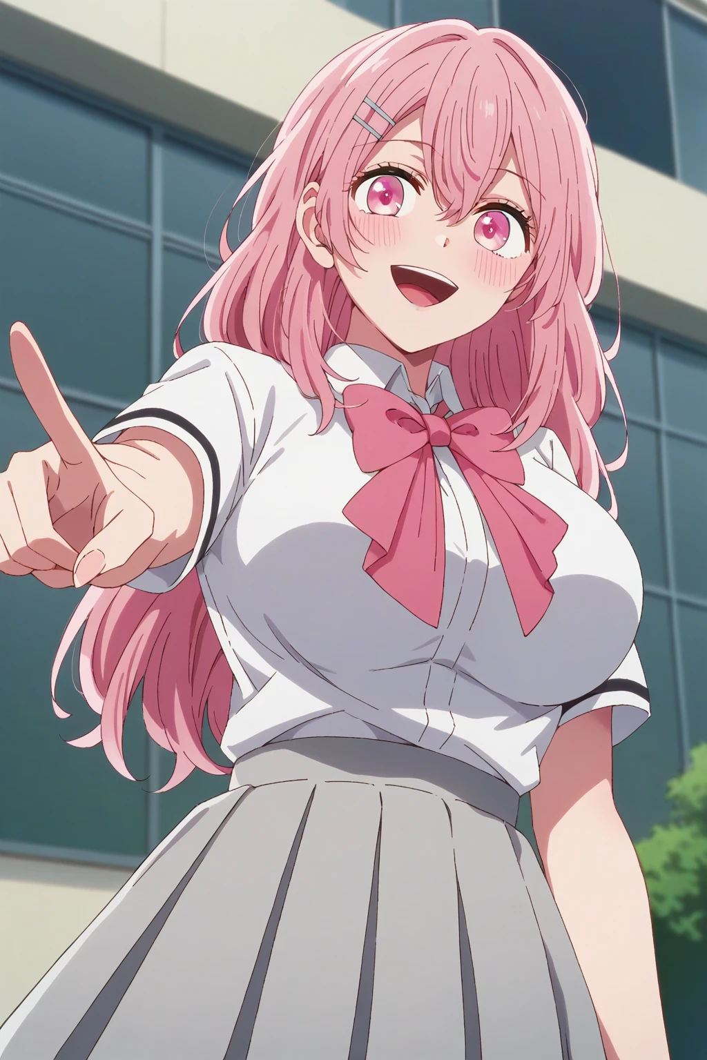 KJOminami, long hair, pink hair, pink eyes, hair between eyes, hair pin,