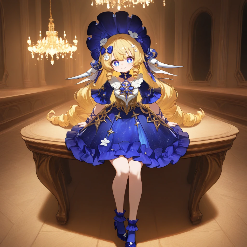 TruflFilbrtDNA, Tfl_Drs, petite, blue eyes, symbol-shaped pupils, white pupils, blonde hair, low-tied long hair, frilled dress, frilled shirt, white shirt, blue dress, glitter dress, frilled sleeves, blue sleeves, medium skirt, short sleeves, criss-cross straps, dark blue wristbands, frilled wristbands, arm straps, pearl (gemstone), criss-cross halter, frilled choker, dark blue choker, star (symbol), gold corset, blue bow, hair bow, bonnet, blue headwear, hair flower, low horns, embelm, white horns, horns, long ribbon, blue ribbon, hair ribbon, twin drills, drill hair, frilled socks, blue socks, blue footwear, high heels,Filbert: