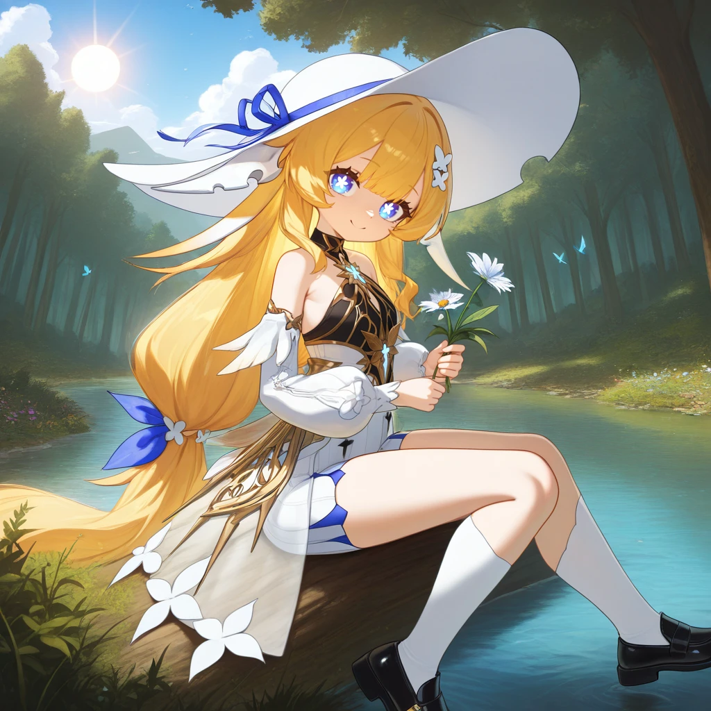 TruflFilbrtDNA, Tfl_Def, petite, blue eyes, symbol-shaped pupils, white pupils, blonde hair, low twintails, low-tied long hair, hair ornament, white headwear, sun hat, blue ribbon, hair ribbon, hat ribbon, horns, low horns, white horns, high-waist shorts, white shorts, silver trim, striped shorts, fringe trim, butterfly (symbol), black shirt, sleeveless shirt, halter shirt, striped shirt, black collar, bare shoulders, puffy detached sleeves, white sleeves, open skirt, feather-trimmed sleeves, see-through skirt, white skirt, armored corset, white kneehighs, kneehighs, black footwear, loafers,Dress Outfit: