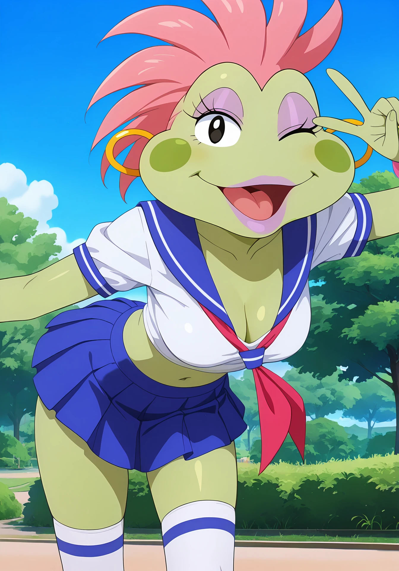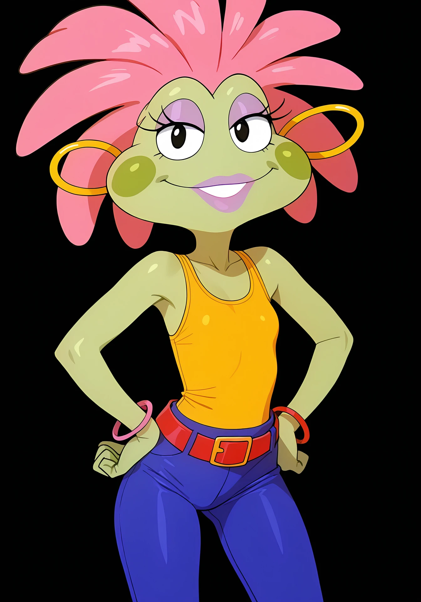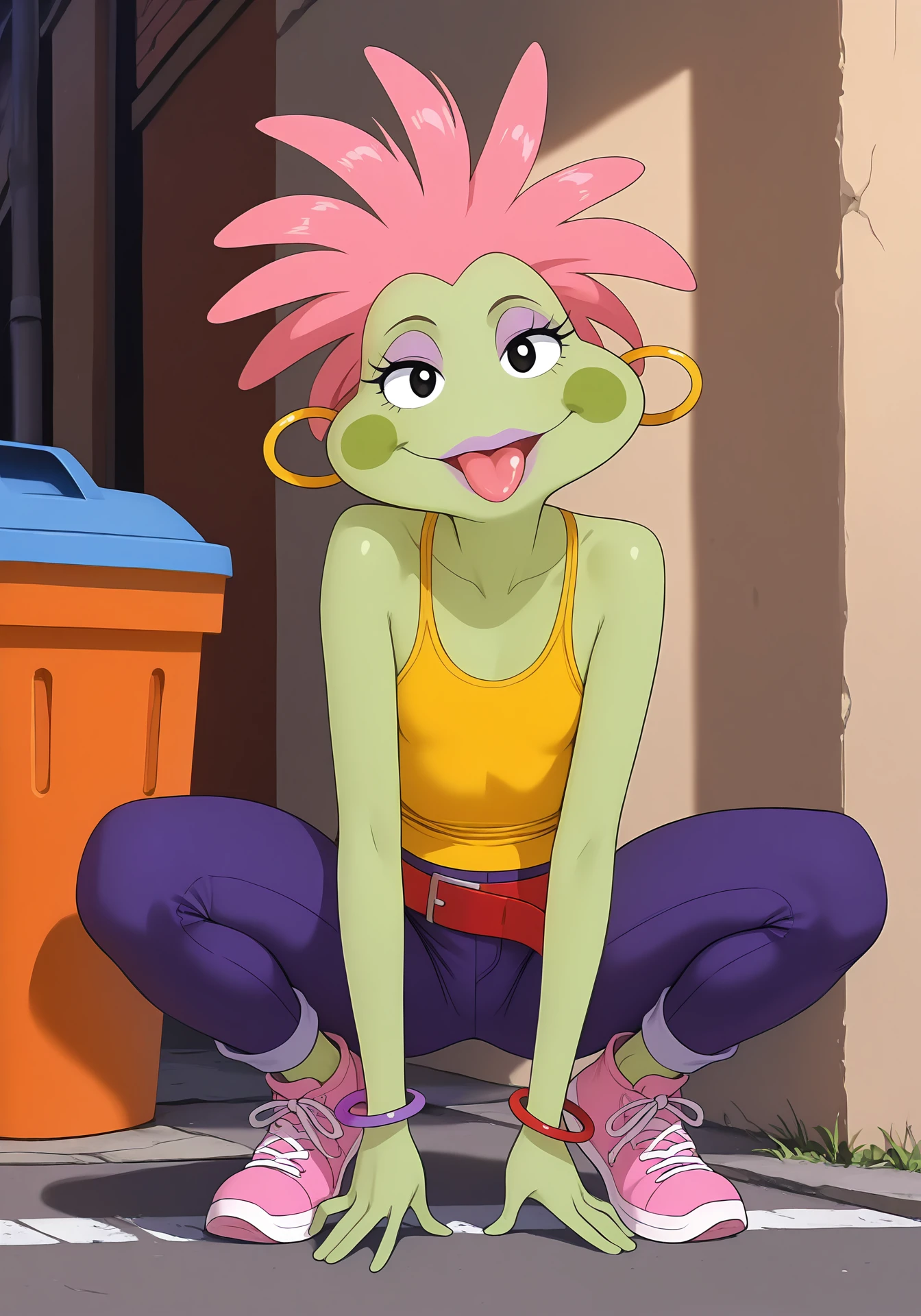streetfrogsloretta, furry, frog girl, green skin, pink hair, black eyes, purple eyeshadow, purple lips, lipstick, green blush stickers, hoop earrings