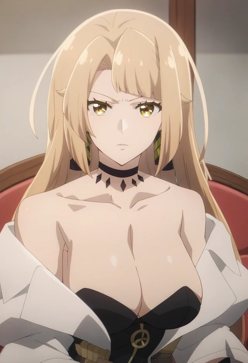 lorraine vivie, 1girl, blonde_hair, long_hair, solo, yellow_eyes, bangs, earrings, black_choker, large_breasts, breasts