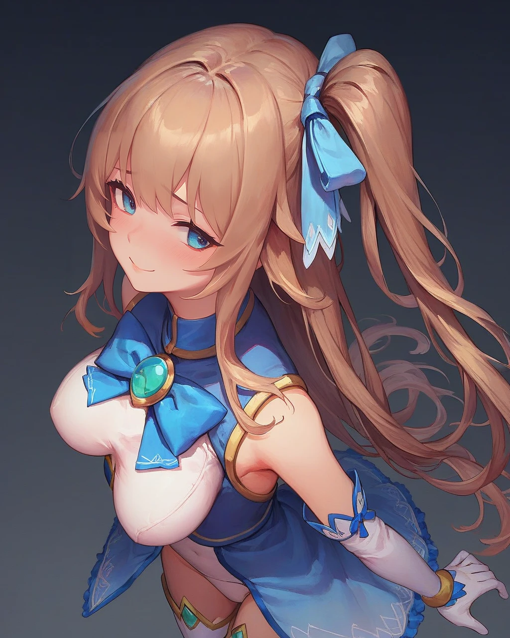 breast, long hair, bangs, side ponytail, light brown hair, hair ribbon, blue ribbon,