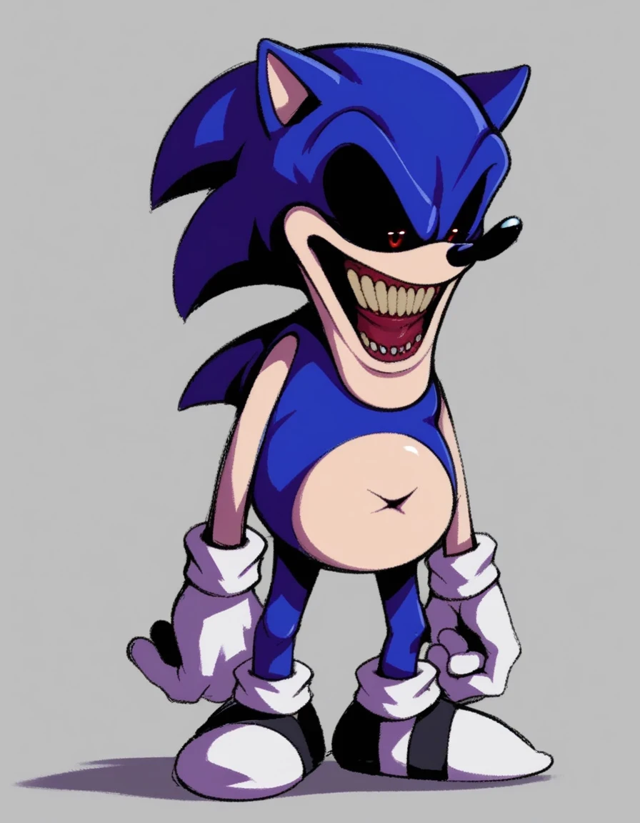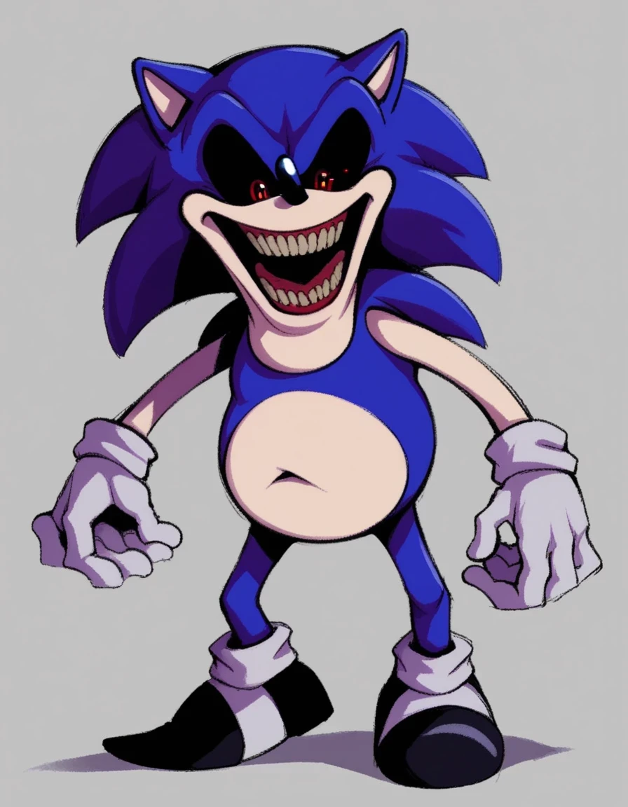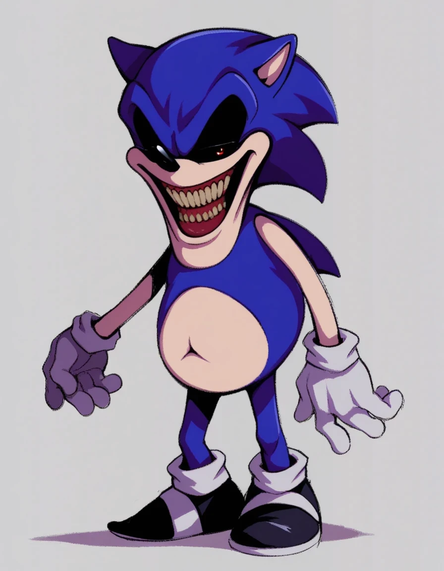 OgaEXE, 1boy, slightly fat hedgehog, giant open smile, small dark mixed teeth, pear-shaped proportions, two tone fur, dark purple fur, white fur, red eyes, black sclera, colored sclera, stretchable left arm, black shoes, white socks, horror, fat, chubby
