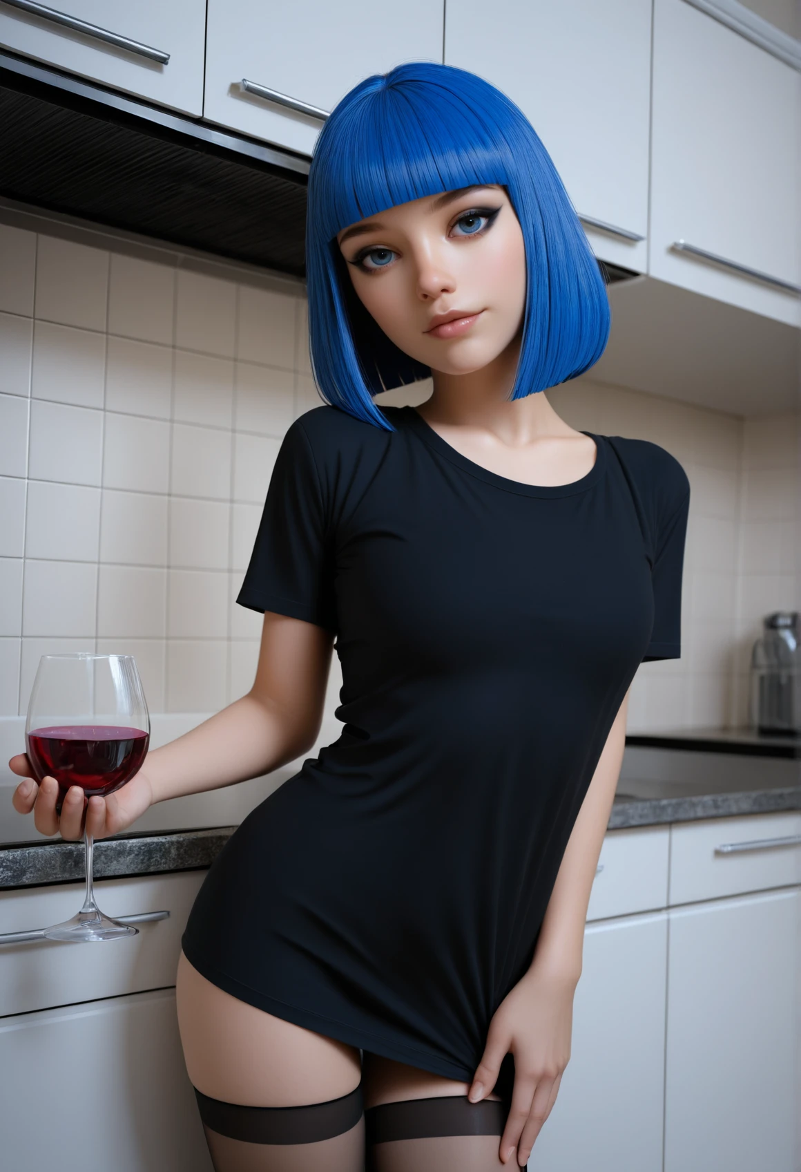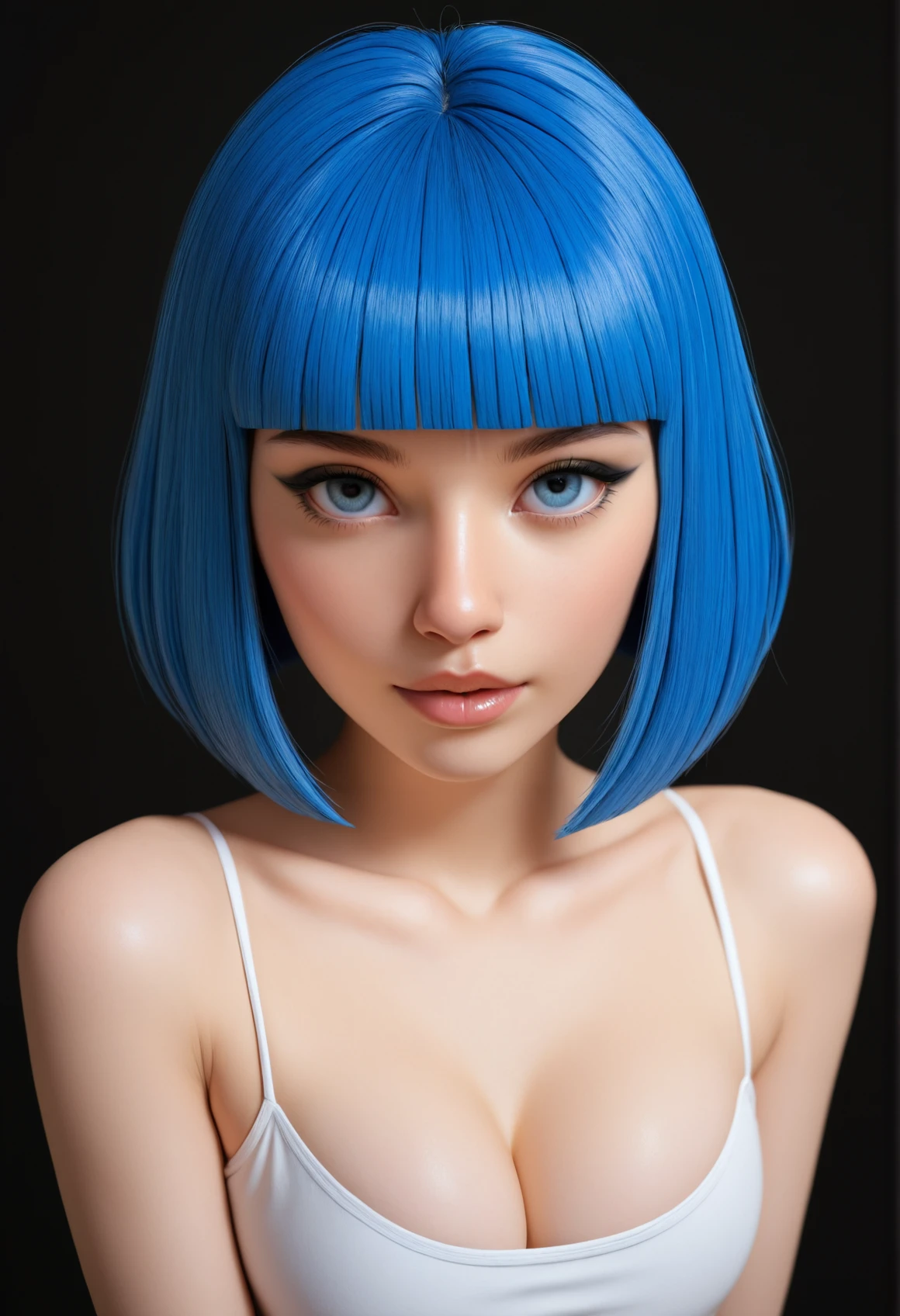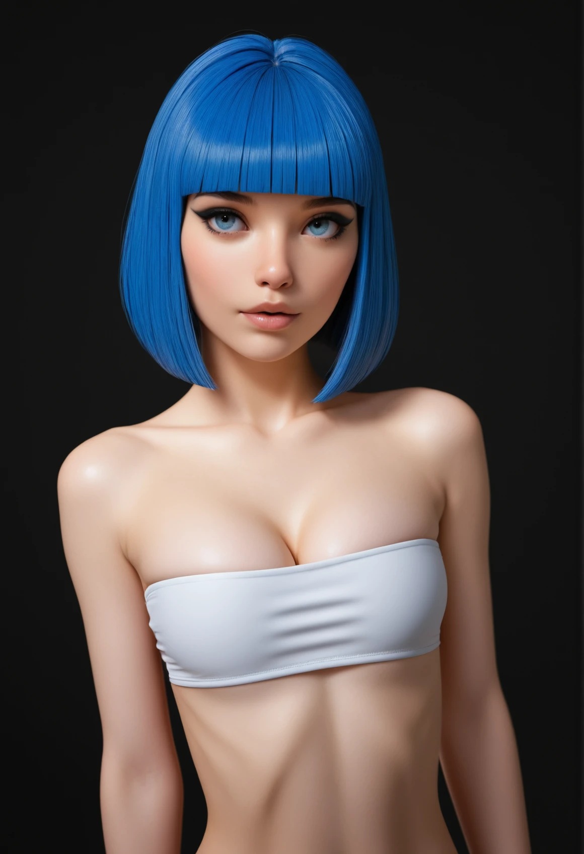 AvaCute, blue hair, short hair, blunt bangs, blue eyes, skinny