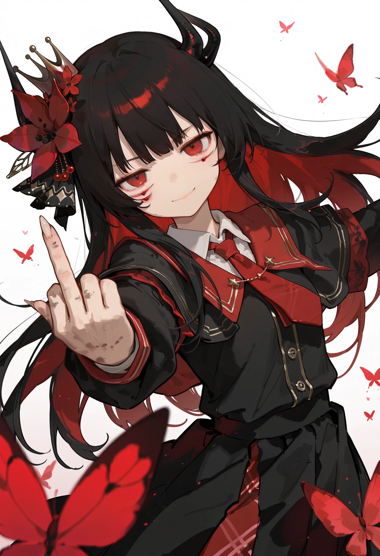 hiro112, 1girl, solo, long hair, hair ornament, hair flower, colored inner hair, black hair, red hair, black horns, red eyes, long sleeves, black sleeves, red necktie, collared shirt, black dress, crown, facial mark, white shirt, black capelet, black pantyhose, long fingernails, (dirty hands:1.1)