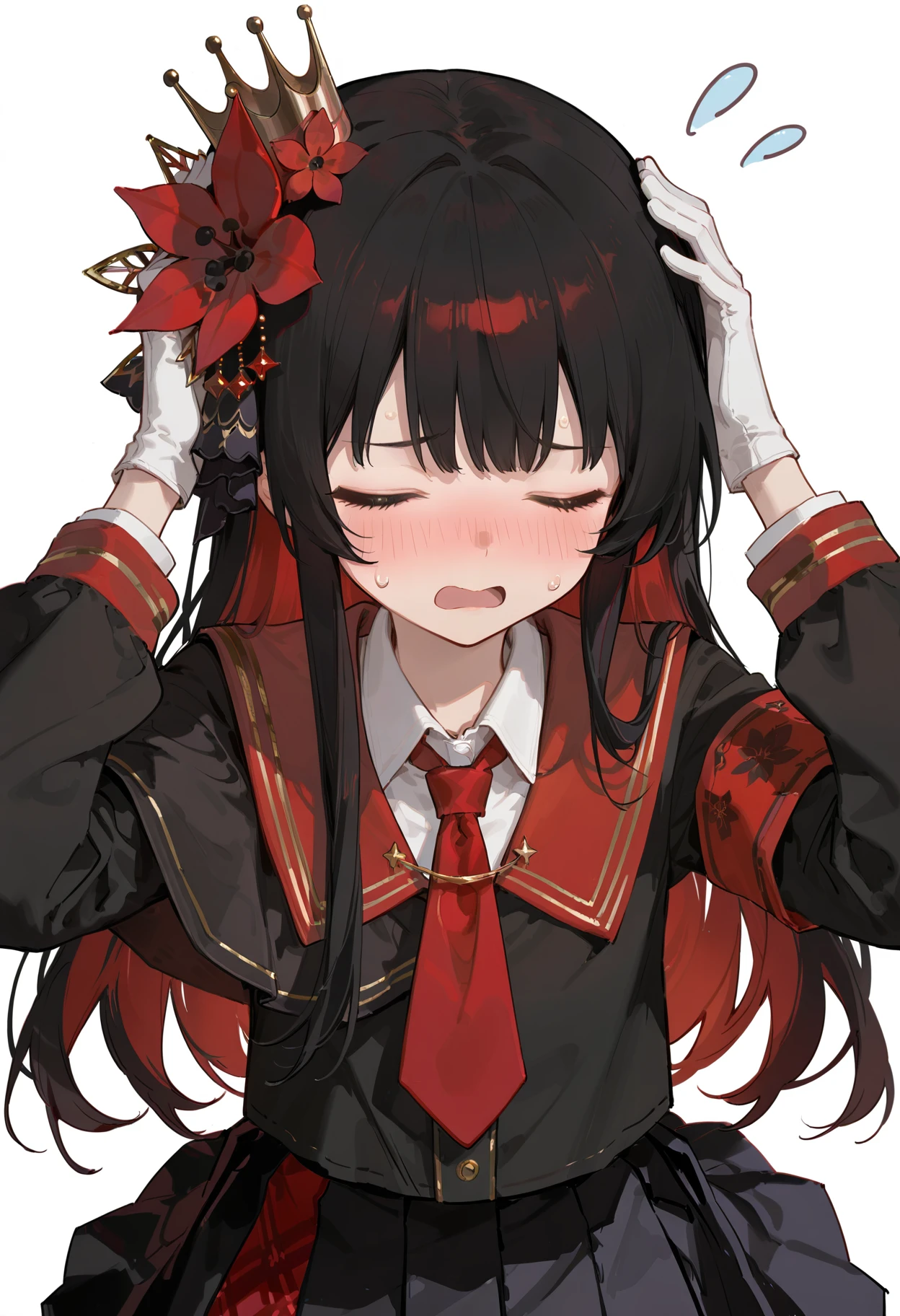 hiro111, 1girl, solo, long hair, black hair, red hair, colored inner hair, crown, hair ornament, hair flower, red eyes, collared shirt, black capelet, red necktie, long sleeves, red sailor collar, red armband, black skirt, school uniform, small_breasts, black pantyhose, white gloves