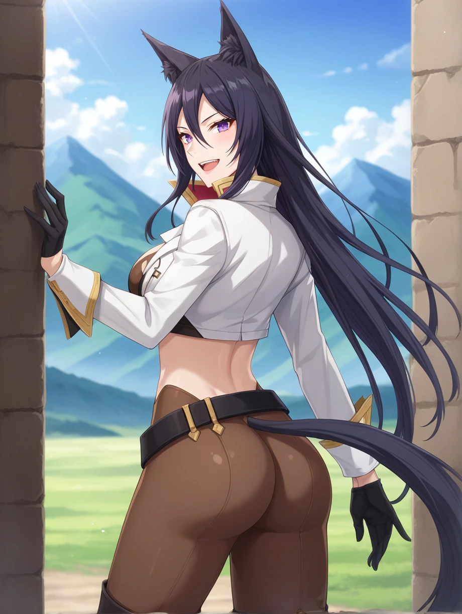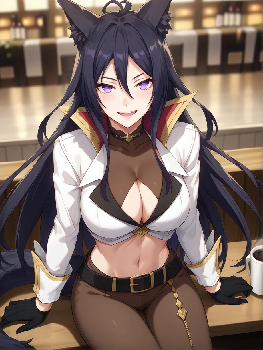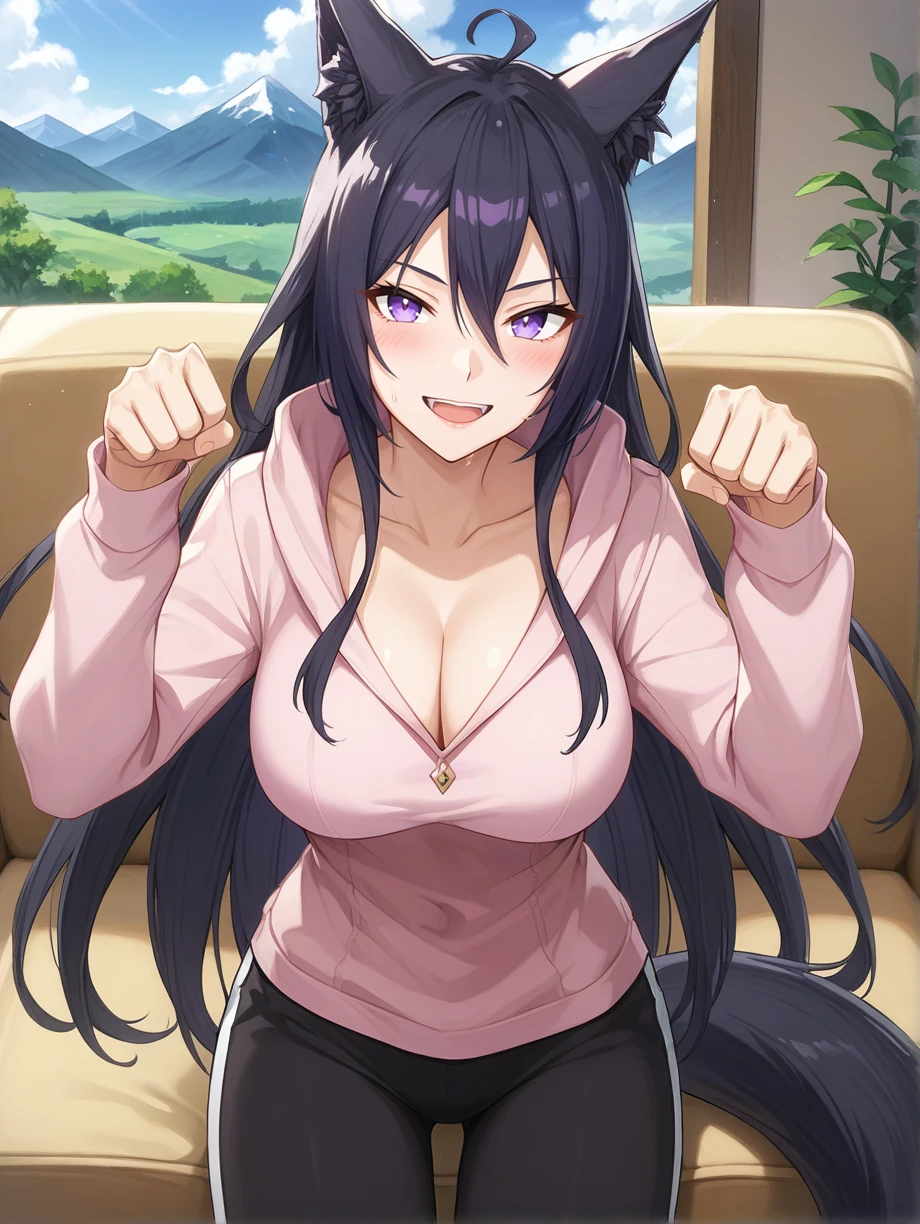 Appearance: animal ears, animal ear fluff, black hair, long hair, purple eyes, tail