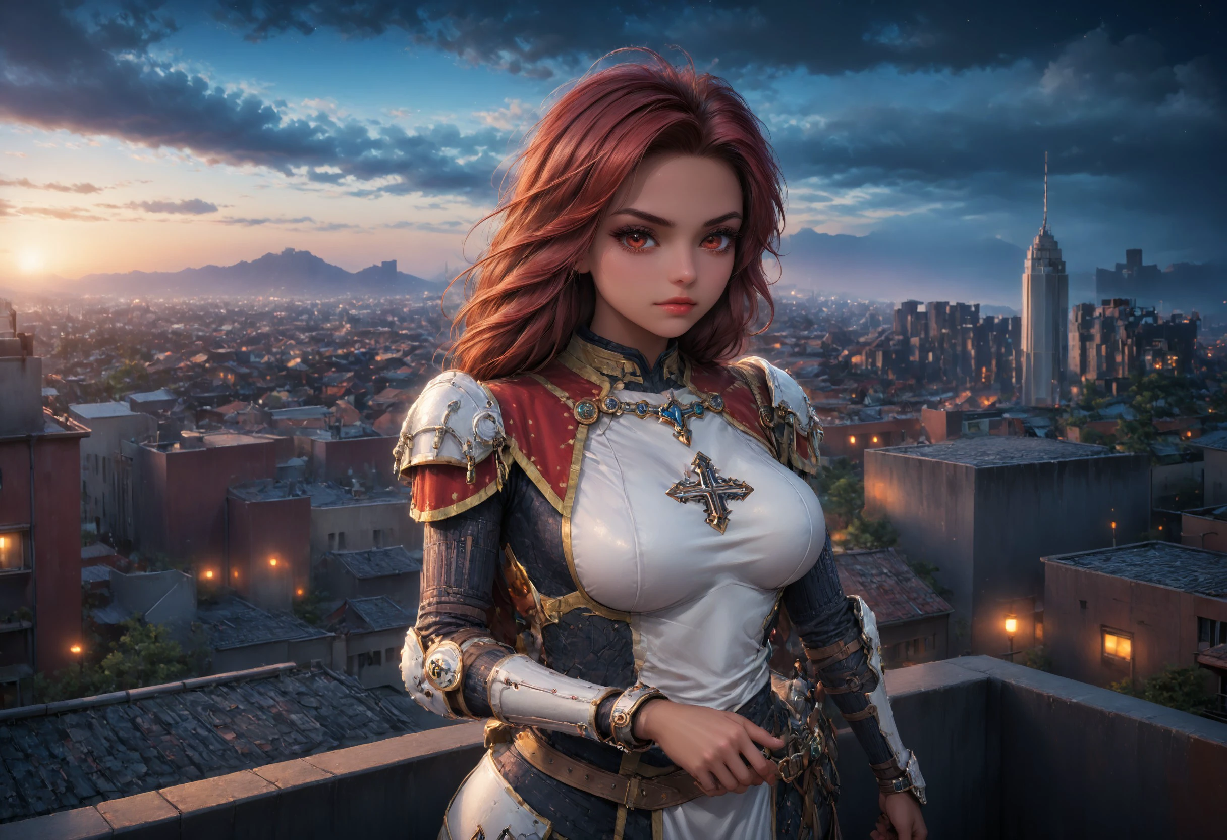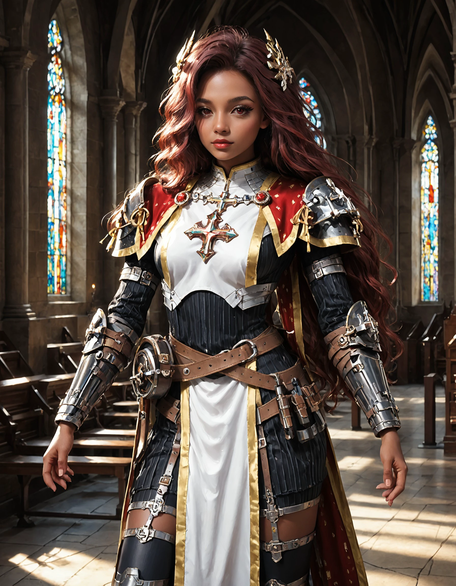 J0hanna, armor, dark skin, red eyes, red hair, legs