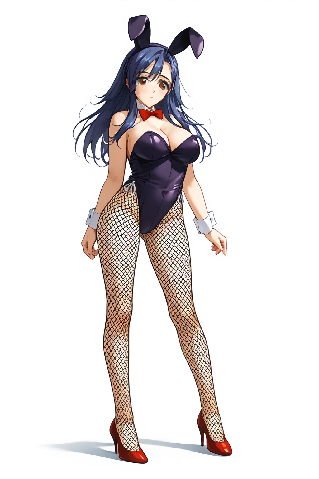 Bunny girl: fake animal ears, cleavage, bowtie, fake rabbit ears, high heels, wrist cuffs, playboy bunny, fishnet pantyhose