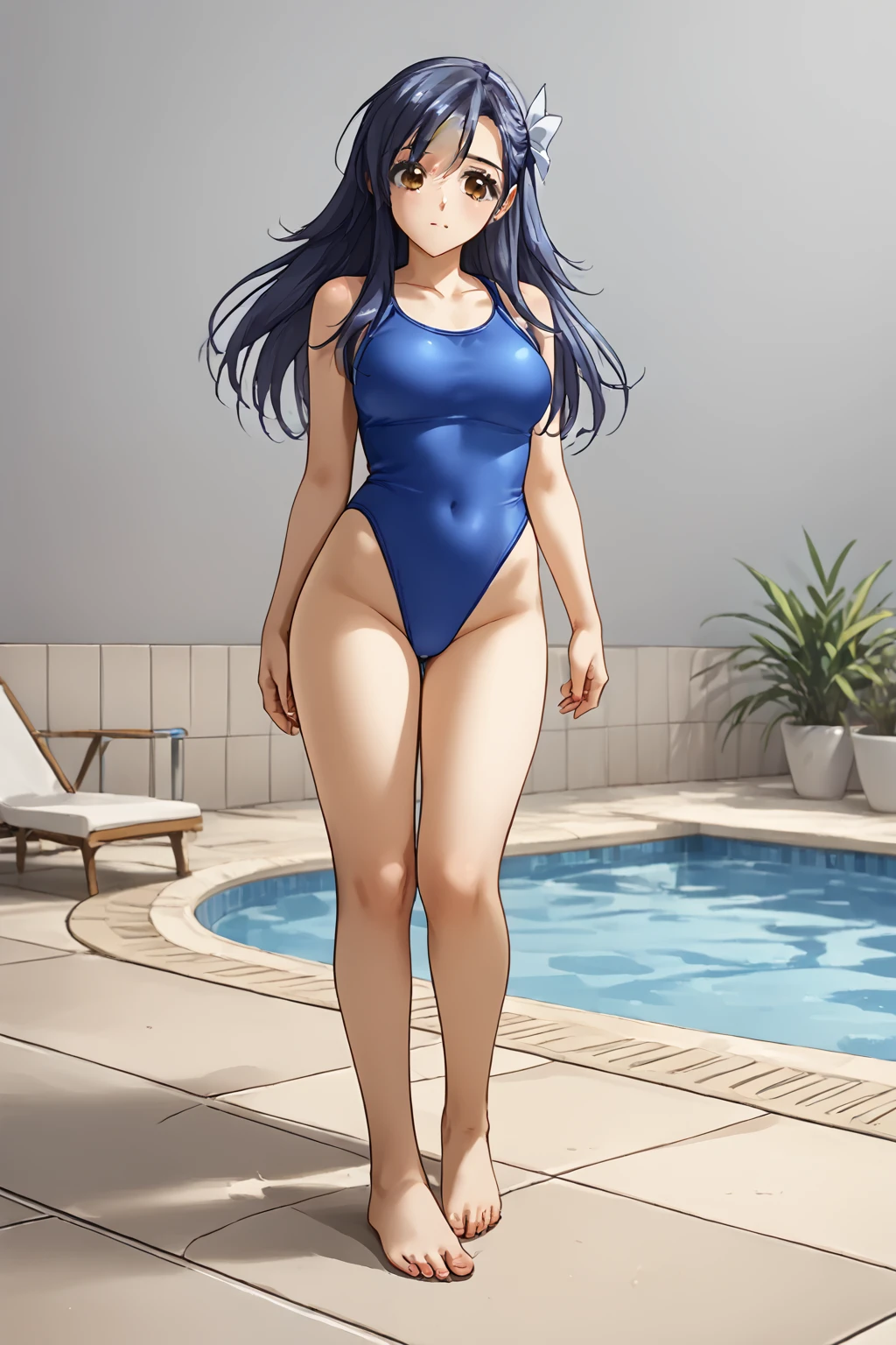 Swimwuit: swimsuit, barefoot, blue one-piece swimsuit,