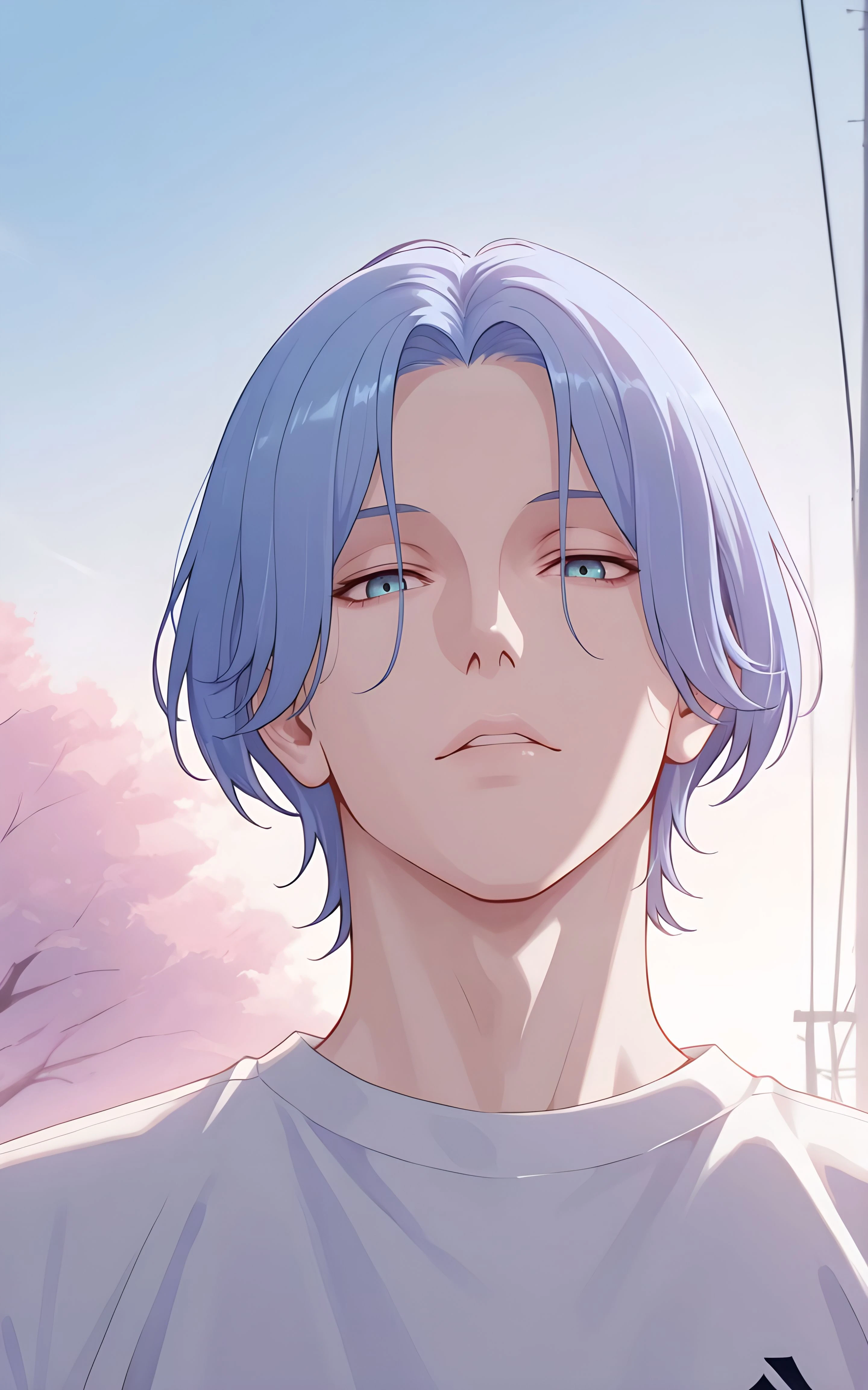 Additional tags: blue hair, blue eyes, parted bangs, sidelocks,
