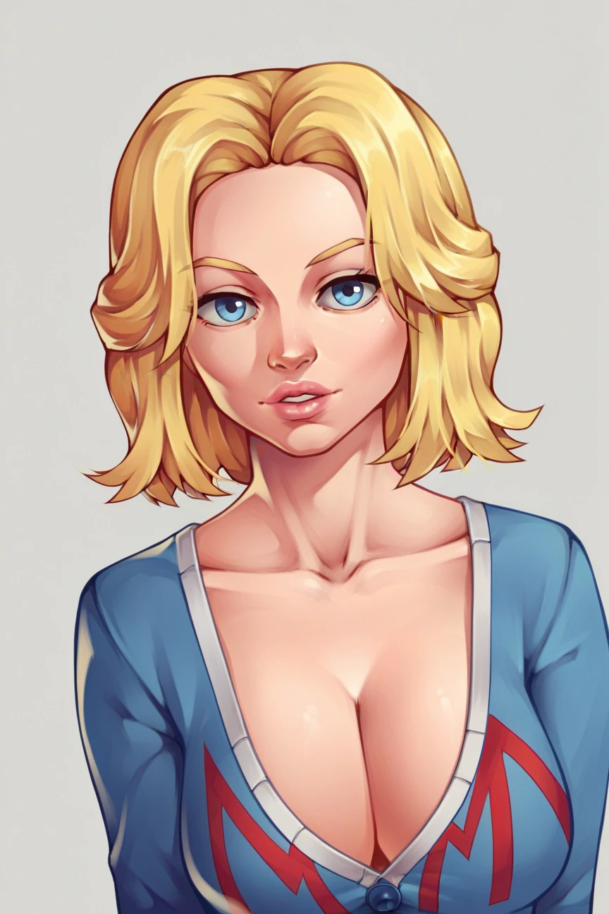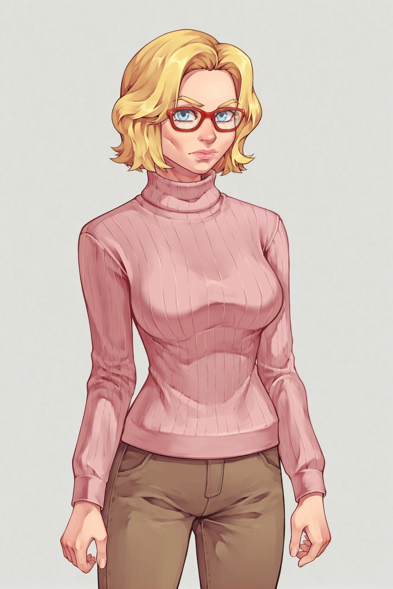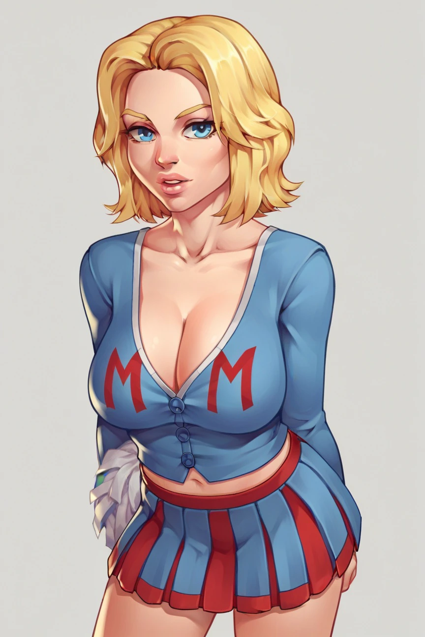 wendy sanders \(mnf\), short hair, blonde hair, red-framed eyewear, glasses, cheerleader, knee socks, blue shirt, blue skirt, buttons, pleated skirt, blue eyes, mature female, pink lips