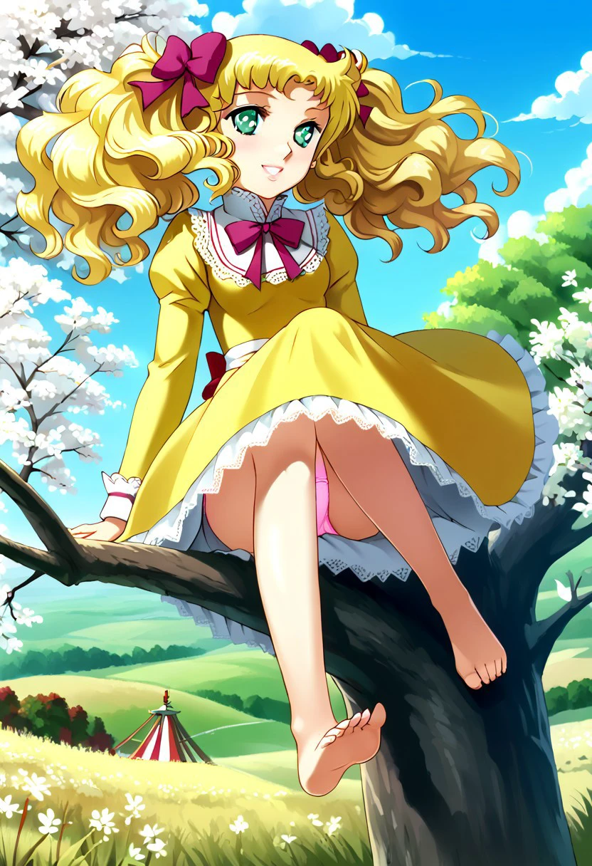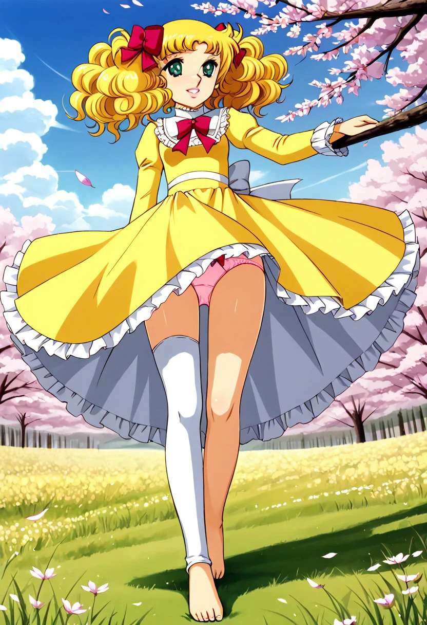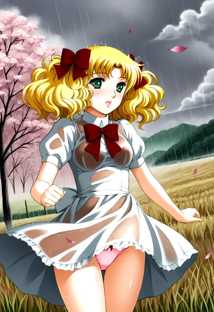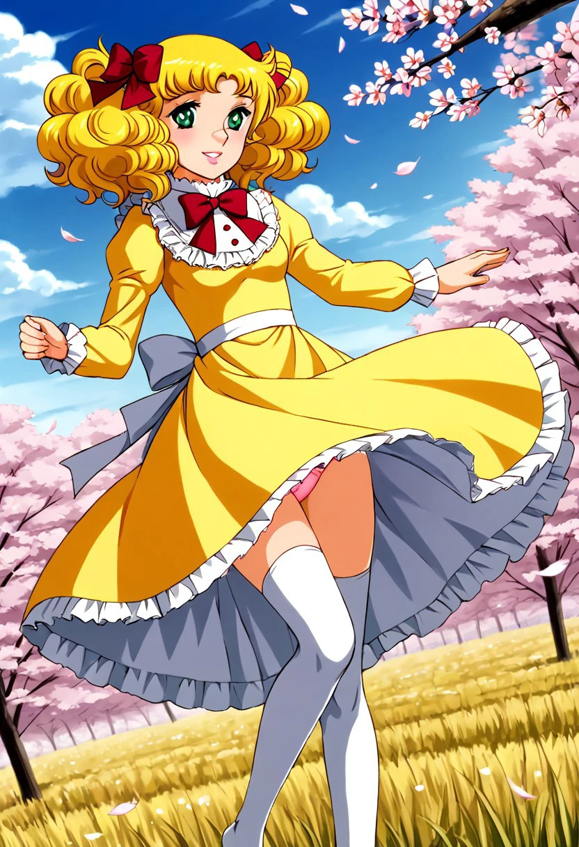 1 girl, alone, cute face, green eyes, detailed pupils, pink lips, smiling, blonde hair, curly hair, long hair, pigtails, bun, hair bow, ribbon, medium breasts