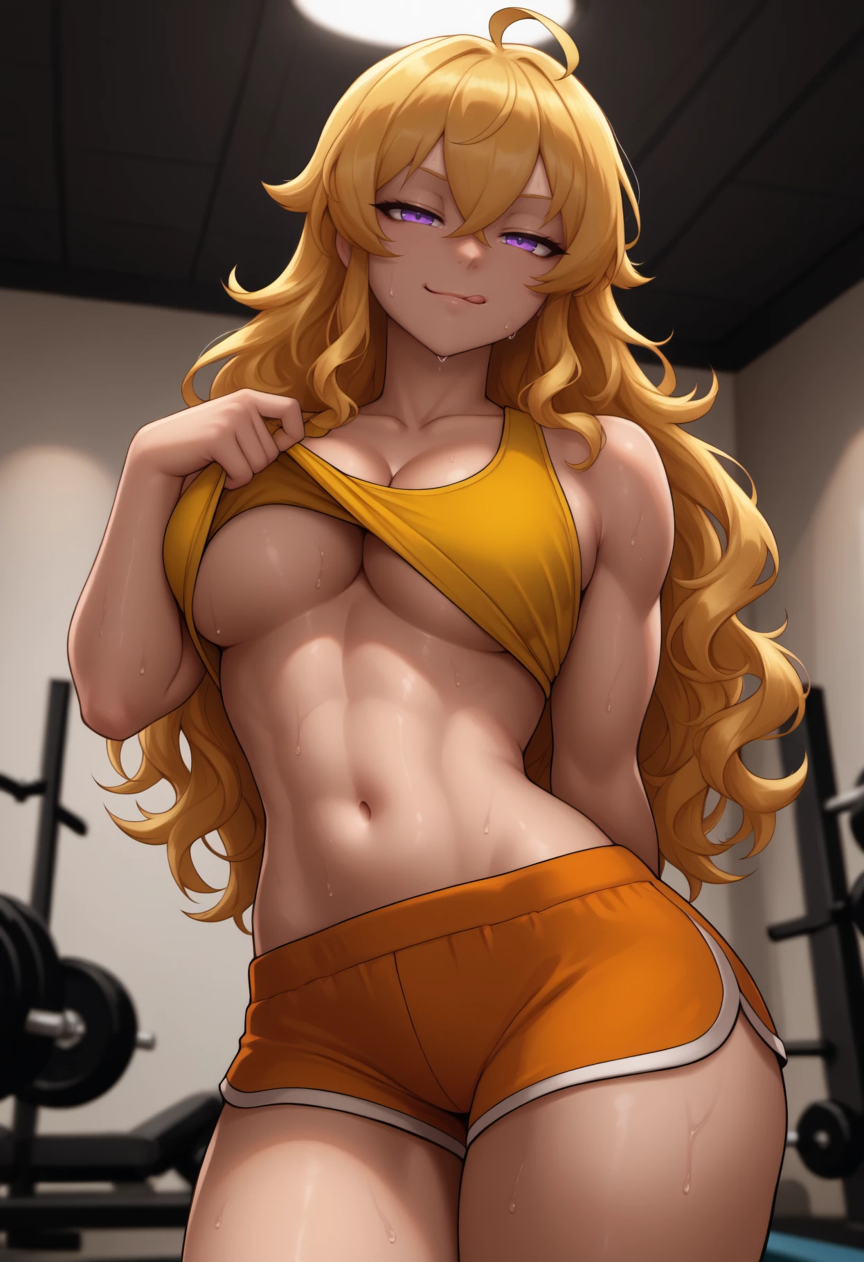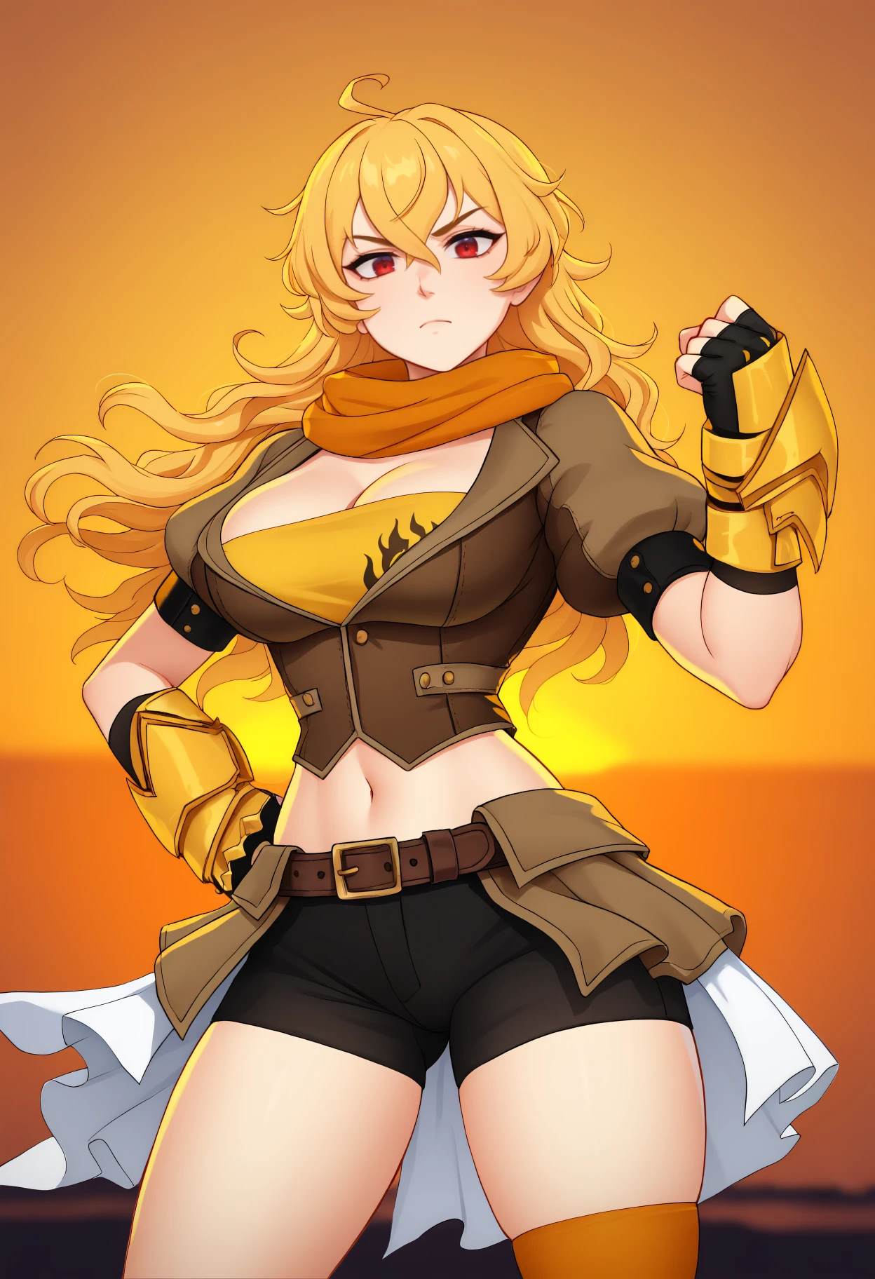 Vale: long hair, blonde hair, ahoge, wavy hair, hair between eyes, purple eyes, orange scarf, brown jacket, puffy short sleeves, yellow tube top, black gloves, fingerless gloves, gauntlets, waist cape, brown belt, black shorts, orange thighhighs, single thighhigh, knee boots, midriff, navel, cleavage, large breasts