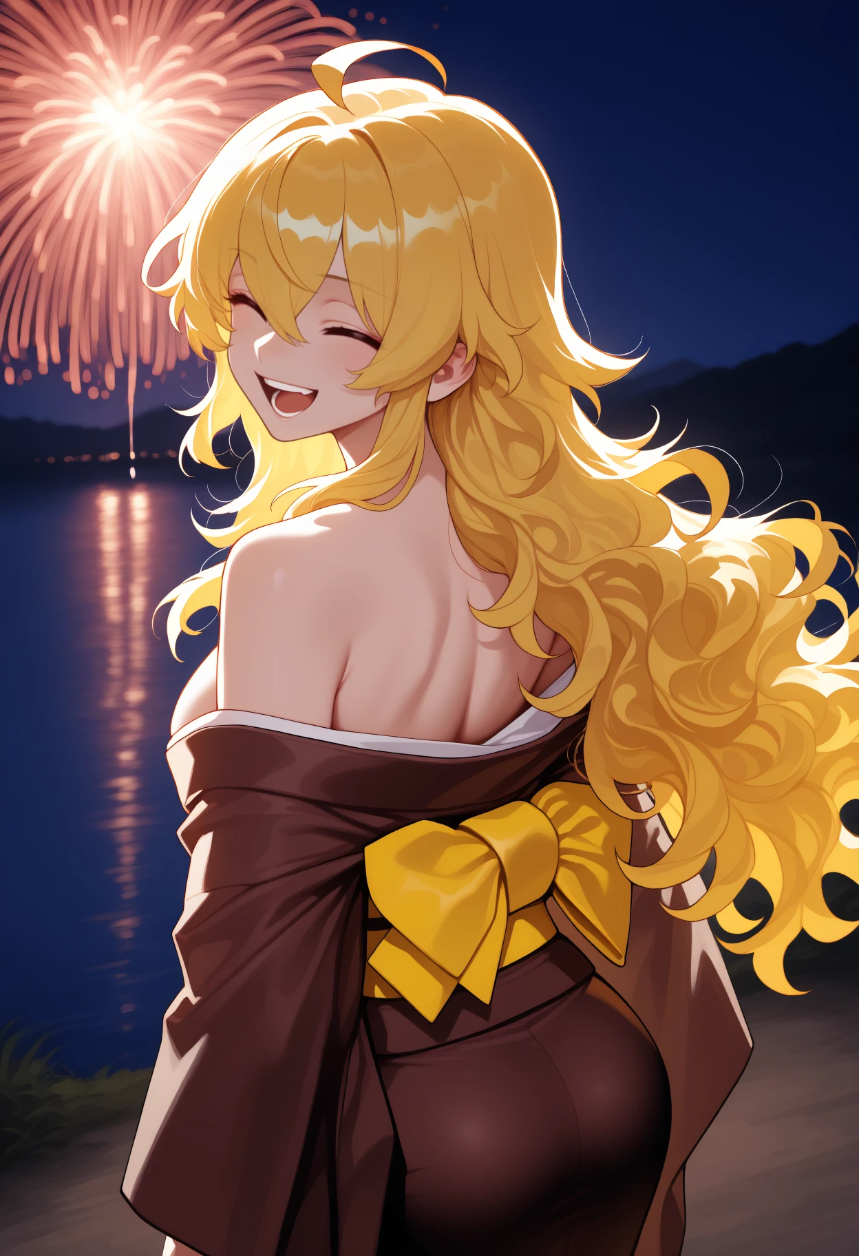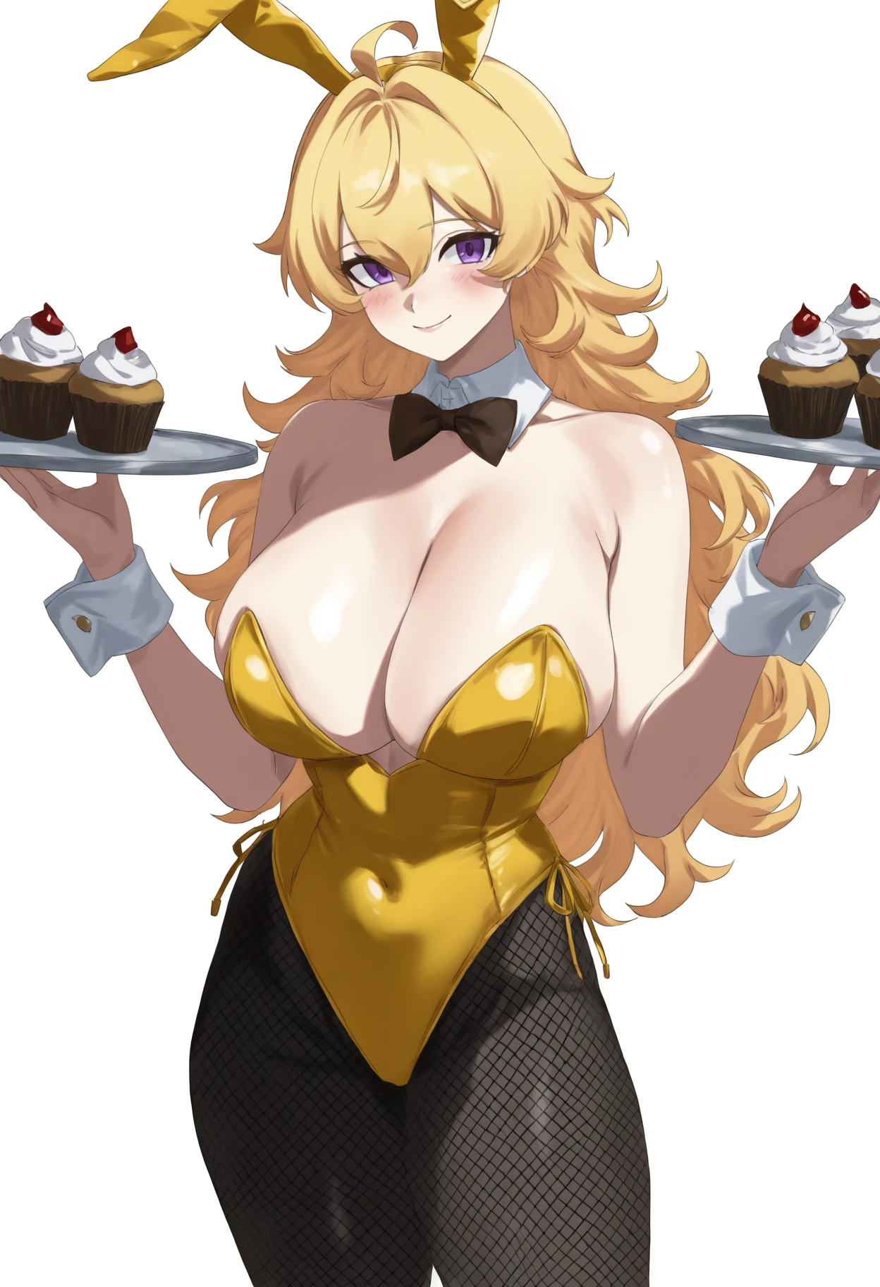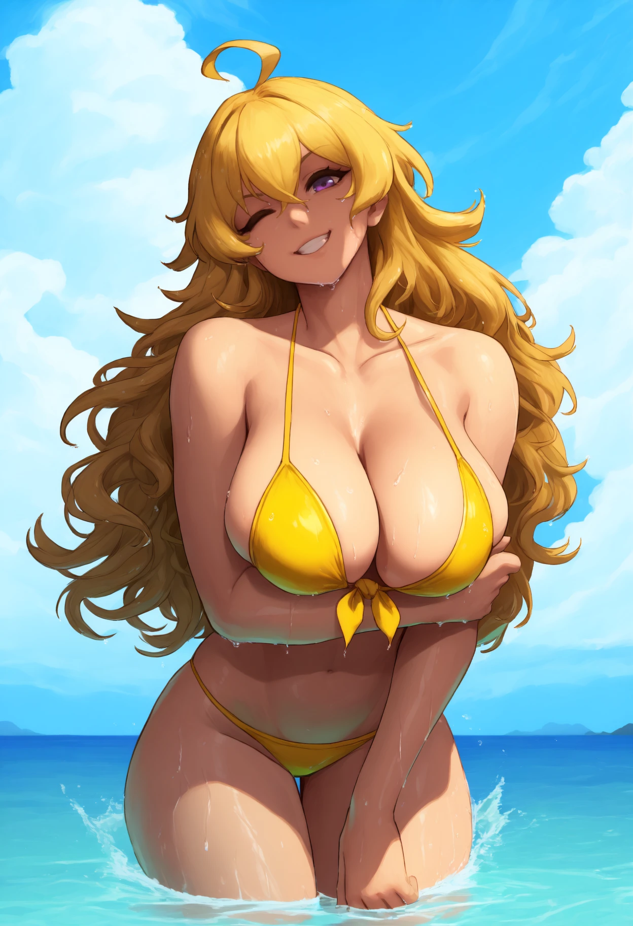 long hair, blonde hair, ahoge, wavy hair, hair between eyes, purple eyes, large breasts