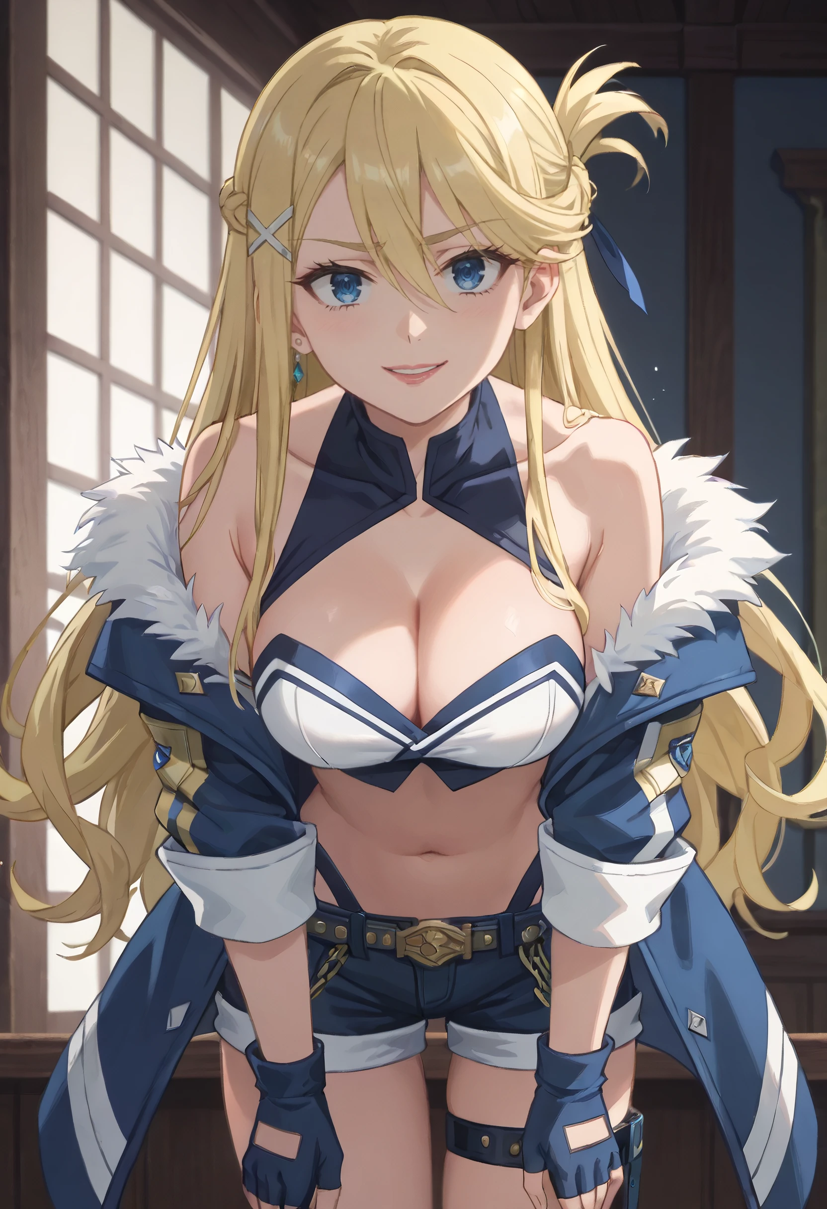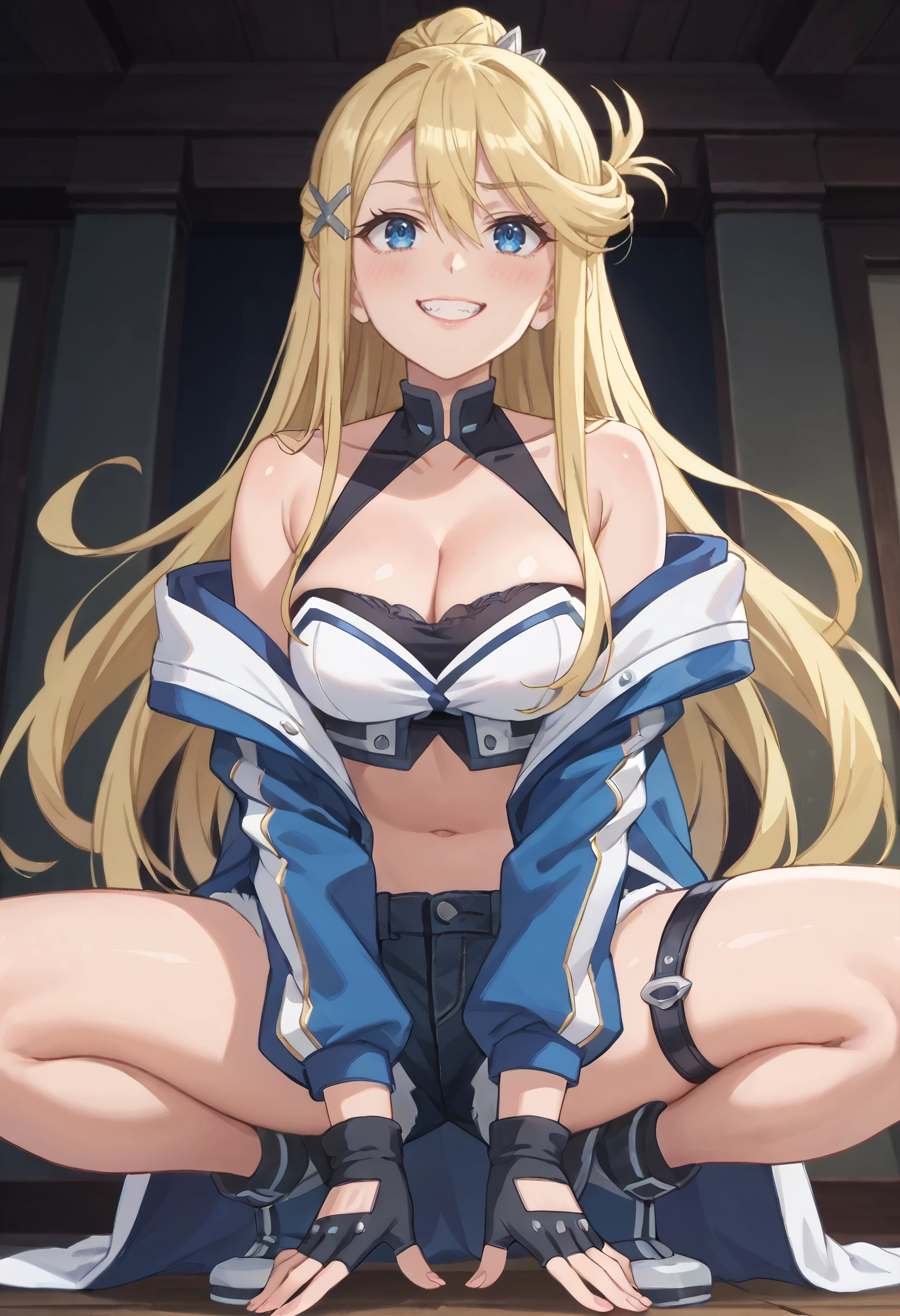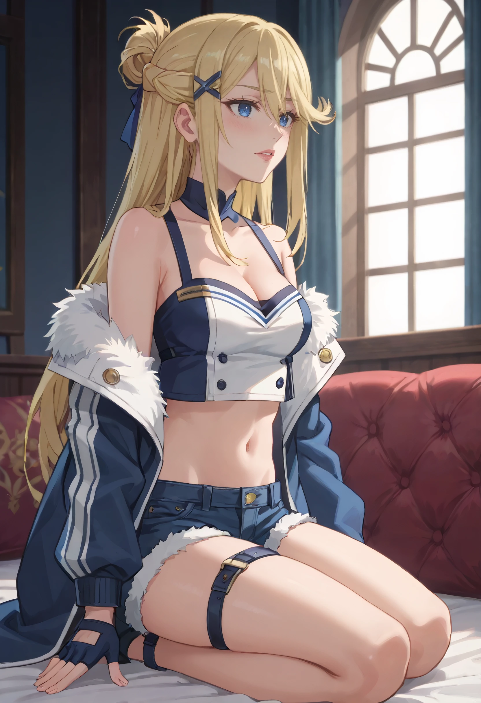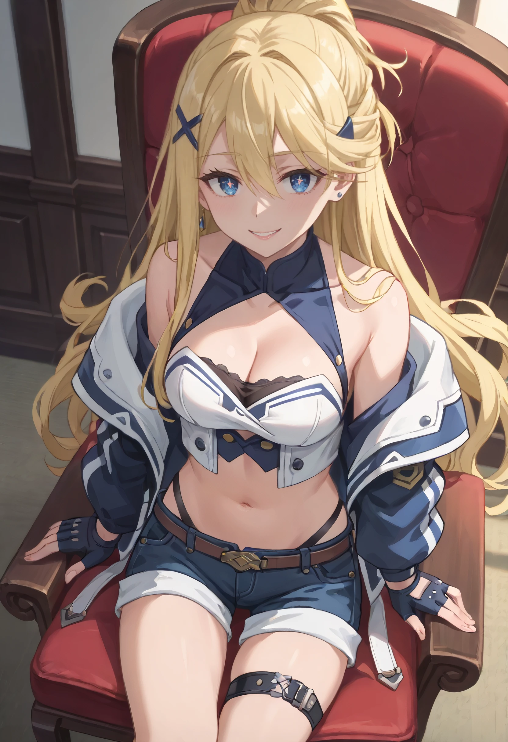bare shoulders, off shoulder, black gloves, fingerless gloves, collarbone, jacket, shirt, hair ornament, cleavage, navel, shorts, midriff, short shorts, thigh strap,