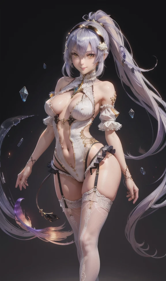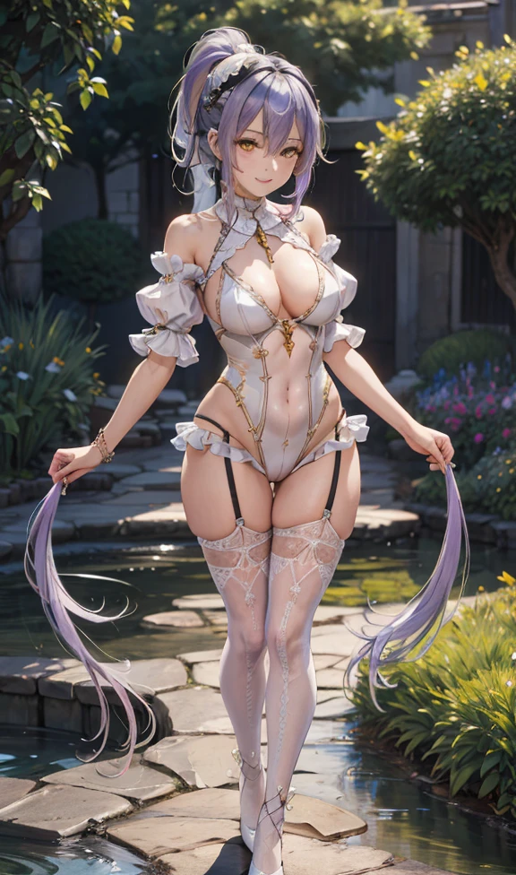 long hair, breasts, bangs, hair ornament, thighhighs, hair between eyes, bare shoulders, medium breasts, very long hair, ponytail, short sleeves, sidelocks, frills, detached sleeves, puffy sleeves, shiny hair, white thighhighs, leotard, groin, sideboob, covered navel, headgear, highleg, garter straps, low ponytail, highleg leotard, o-ring, cross-laced clothes, frilled thighhighs, frilled leotard, cross-laced legwear, yellow eyes, purple hair
