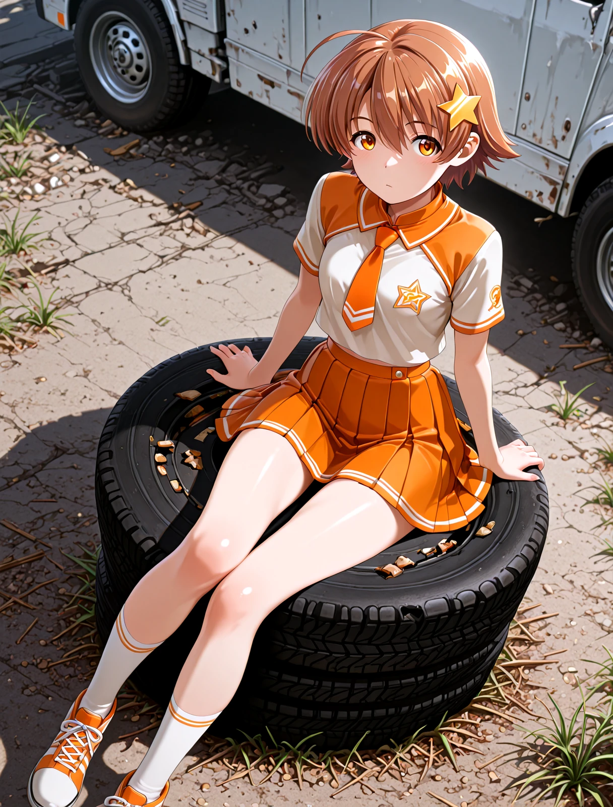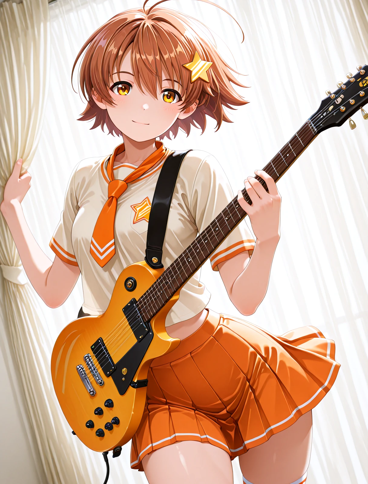 制服 : Standard_Costume ,orange tie, Orange pleated skirt, stripes White socks,Striped shoes, Light orange short-sleeved shirt, orange color
