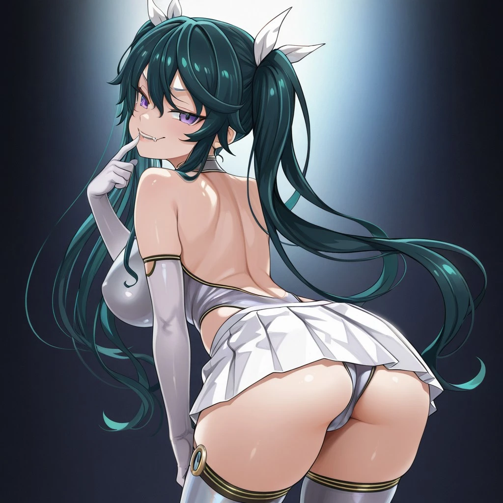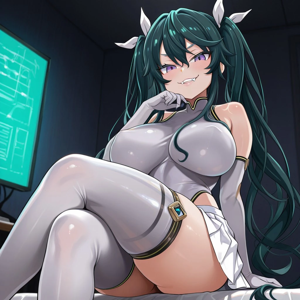 Character: 1girl, long hair, twintails, dark green hair, white hair ribbons, purple eyes, fangs, large breasts,