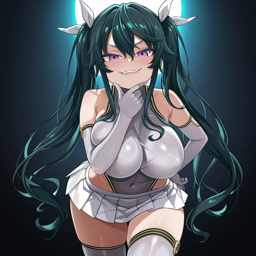 1girl, long hair, twintails, dark green hair, white hair ribbons, purple eyes, fangs, large breasts,