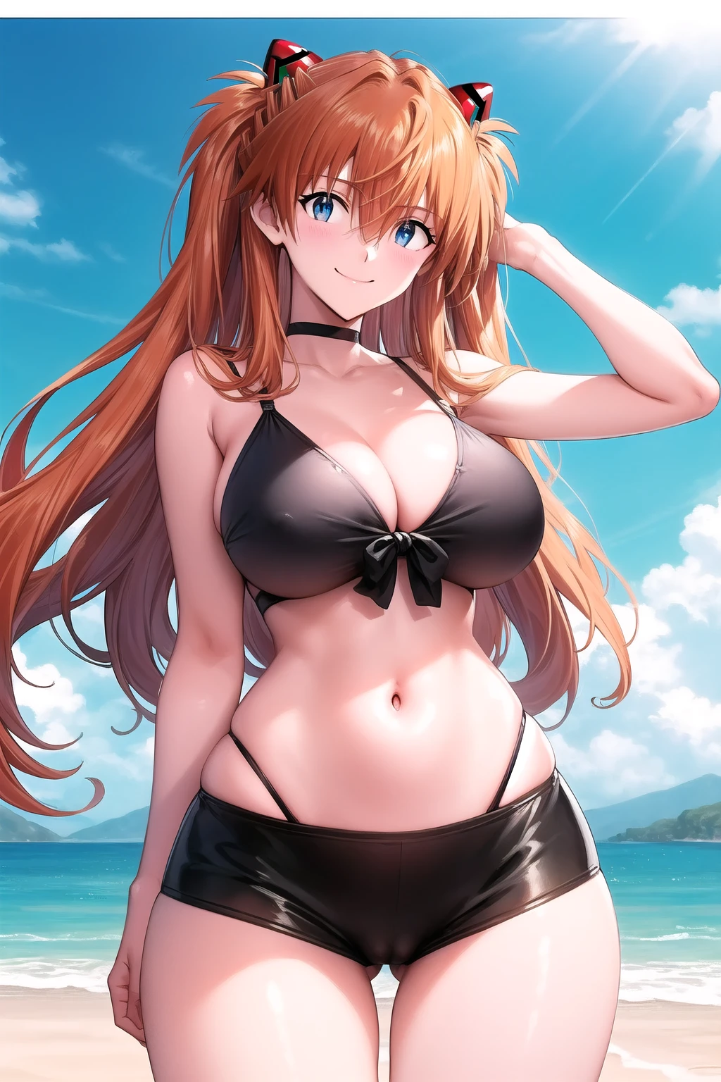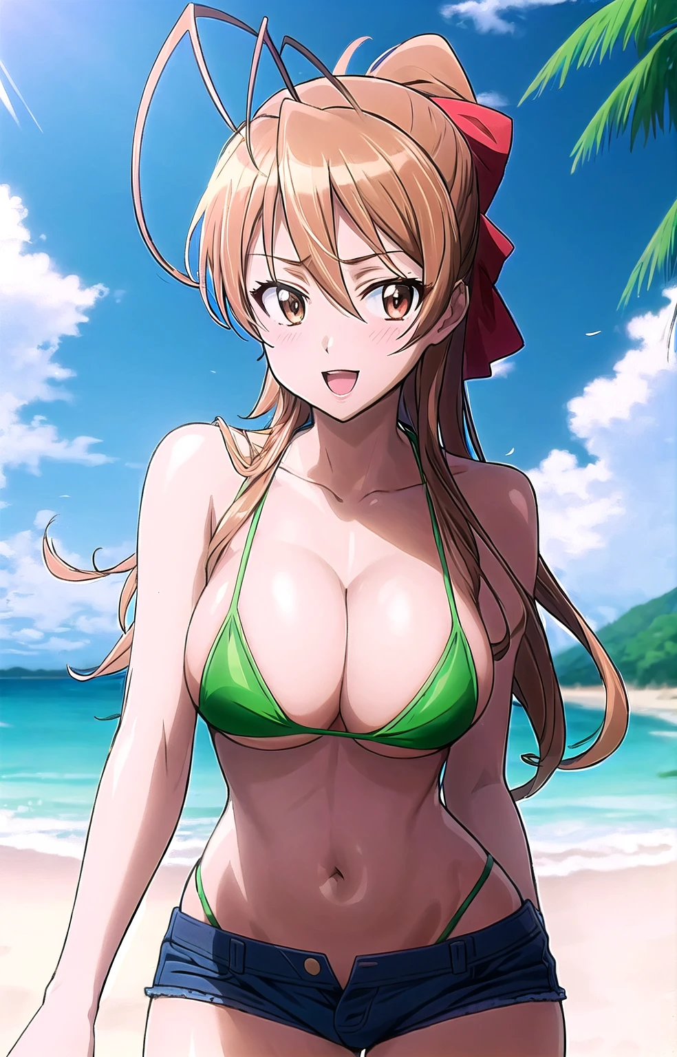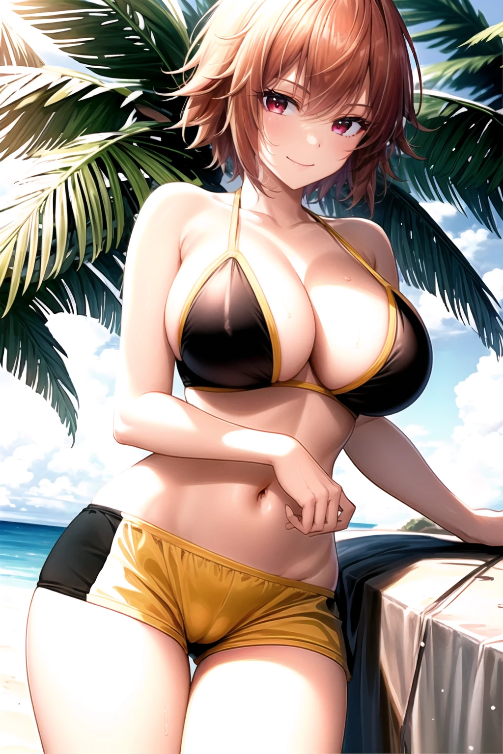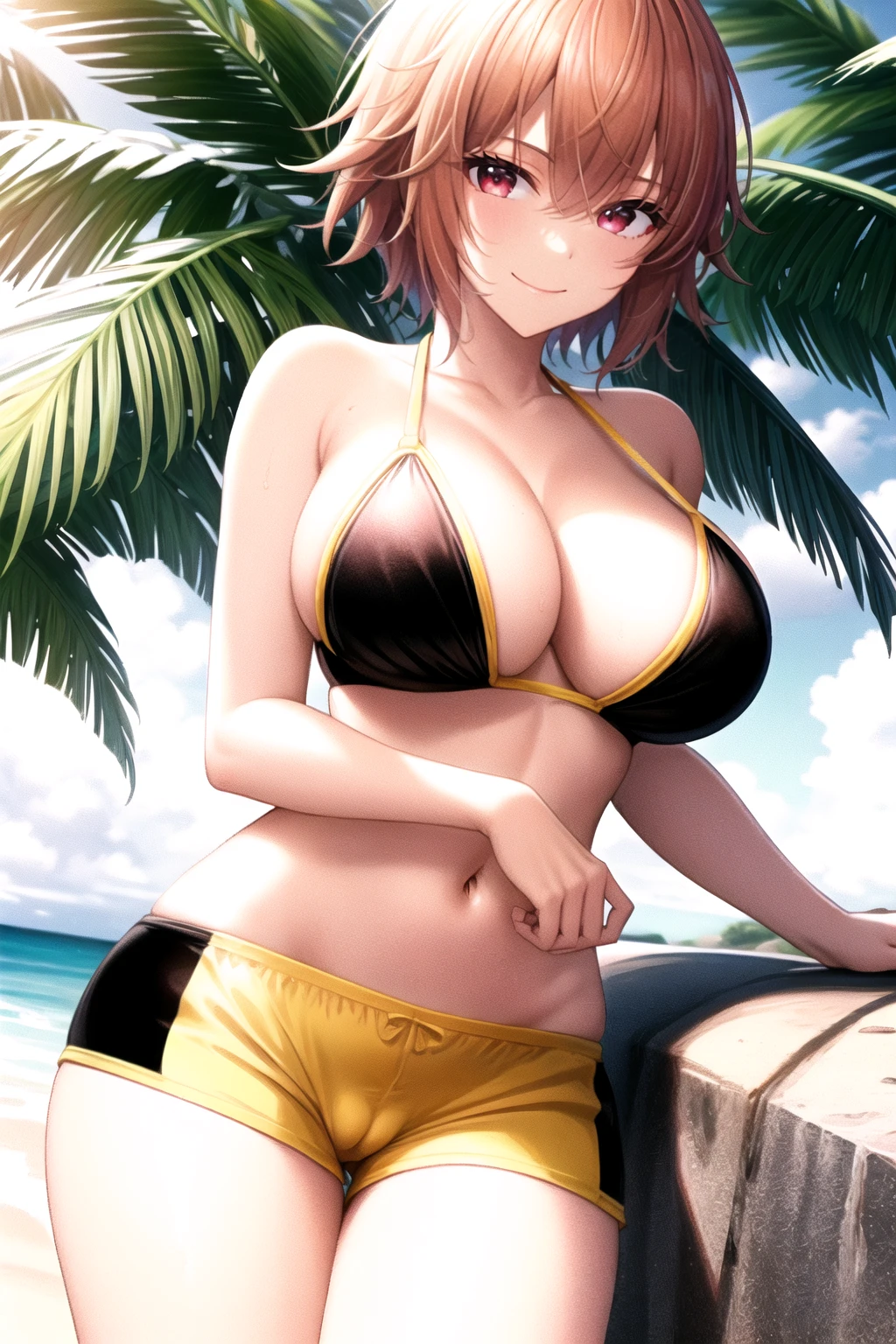 Activation tag: easy_boyshorts; along the type of shorts you desire (whether being bike shorts, bikini shorts, dolphin shorts, lace-trimmed shorts, etc.), and with (panties under shorts:1.2), (front-tie top:1.2), denim shorts, side slit shorts, open fly, and open shorts in the negative prompt box.