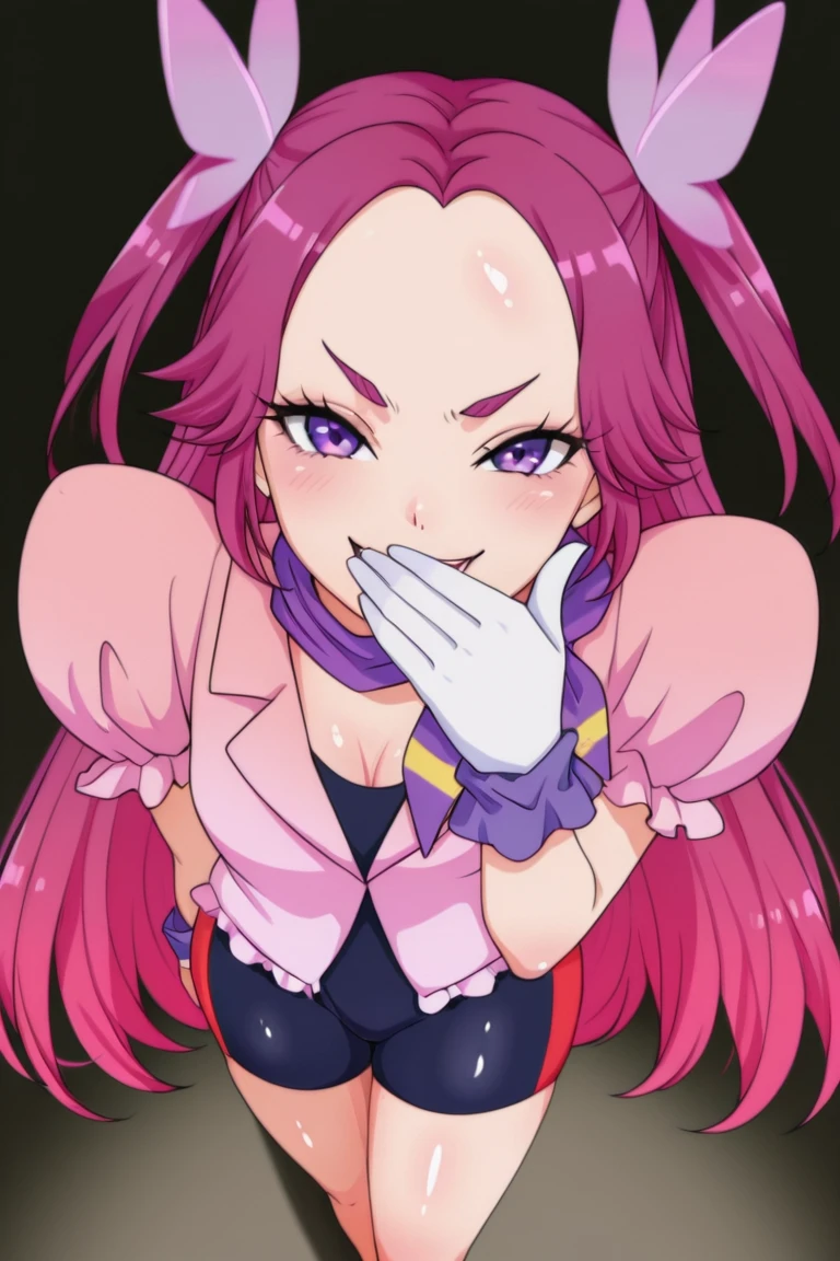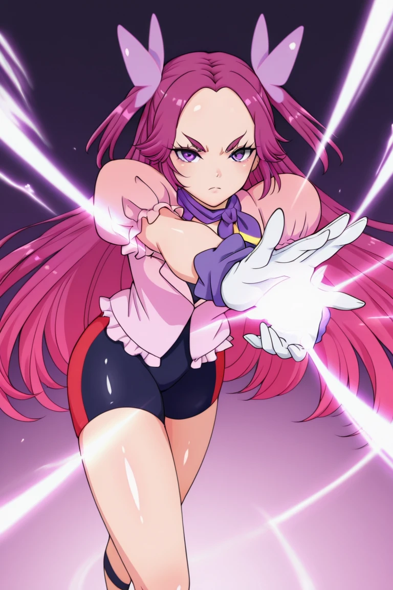 gloves, bike shorts, puffy sleeves, pink shirt, butterfly hair ornament,
