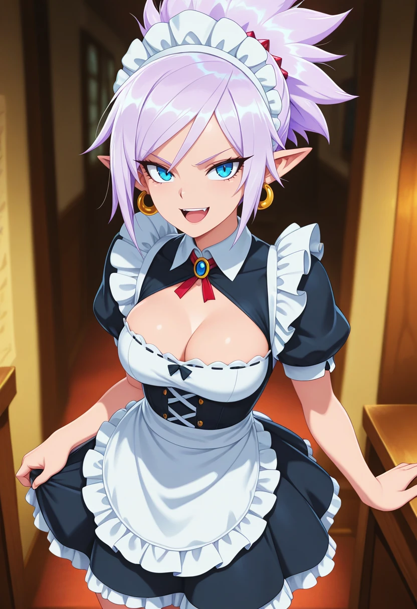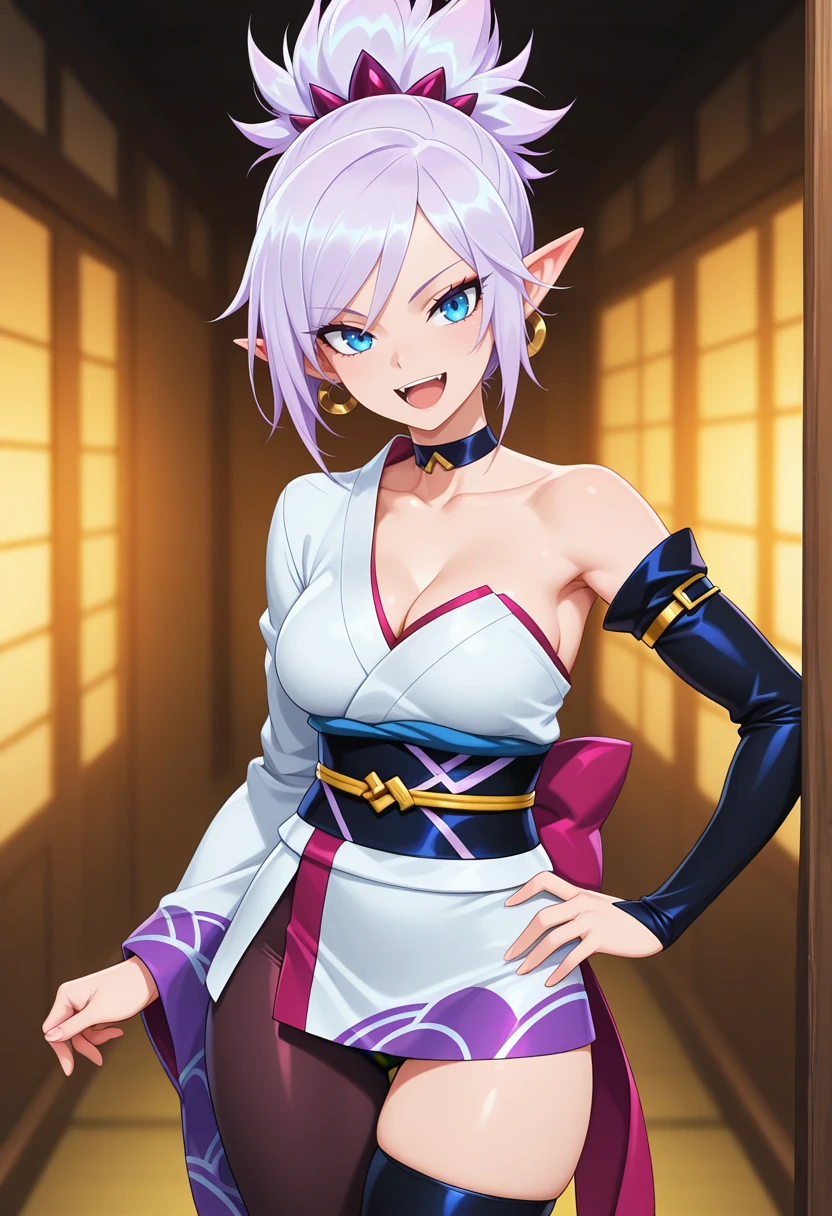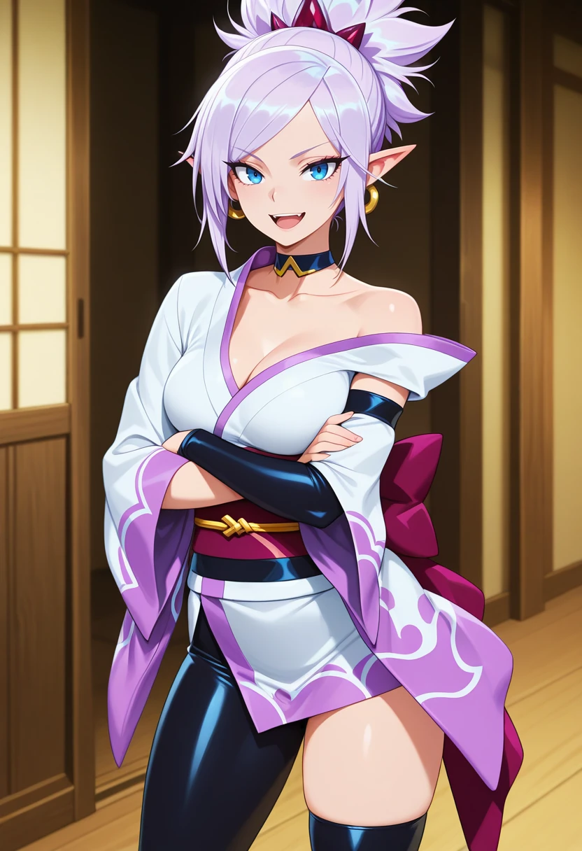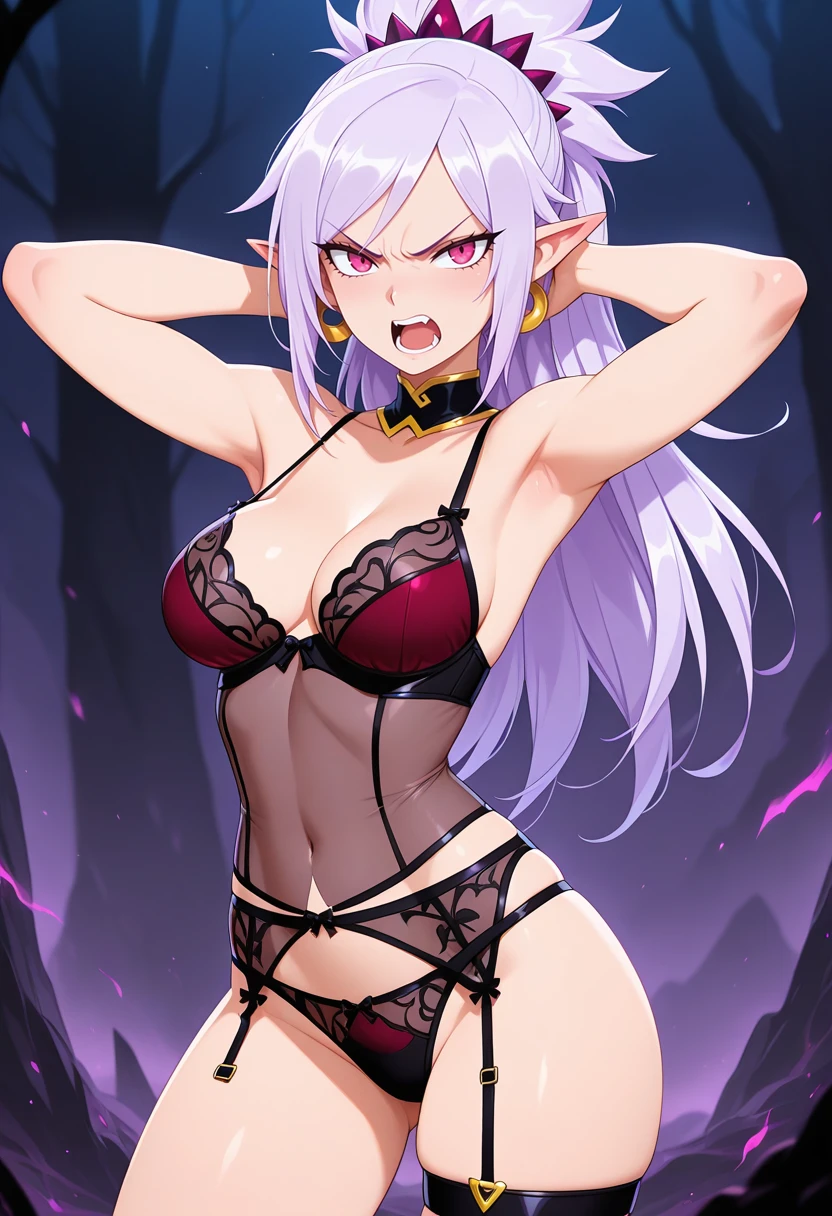 rivensb_nekoforge,1girl,blue eyes,tsurime,light purple hair,ponytail,pointy ears,aged up,medium breasts,