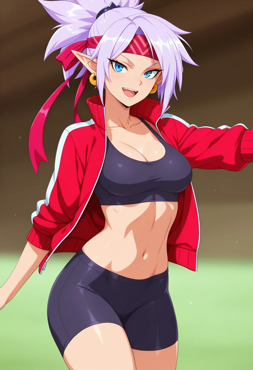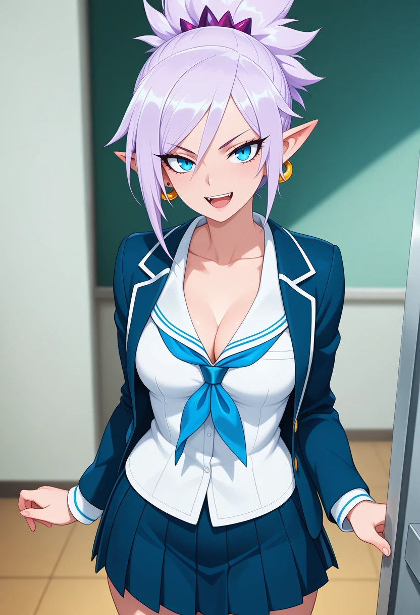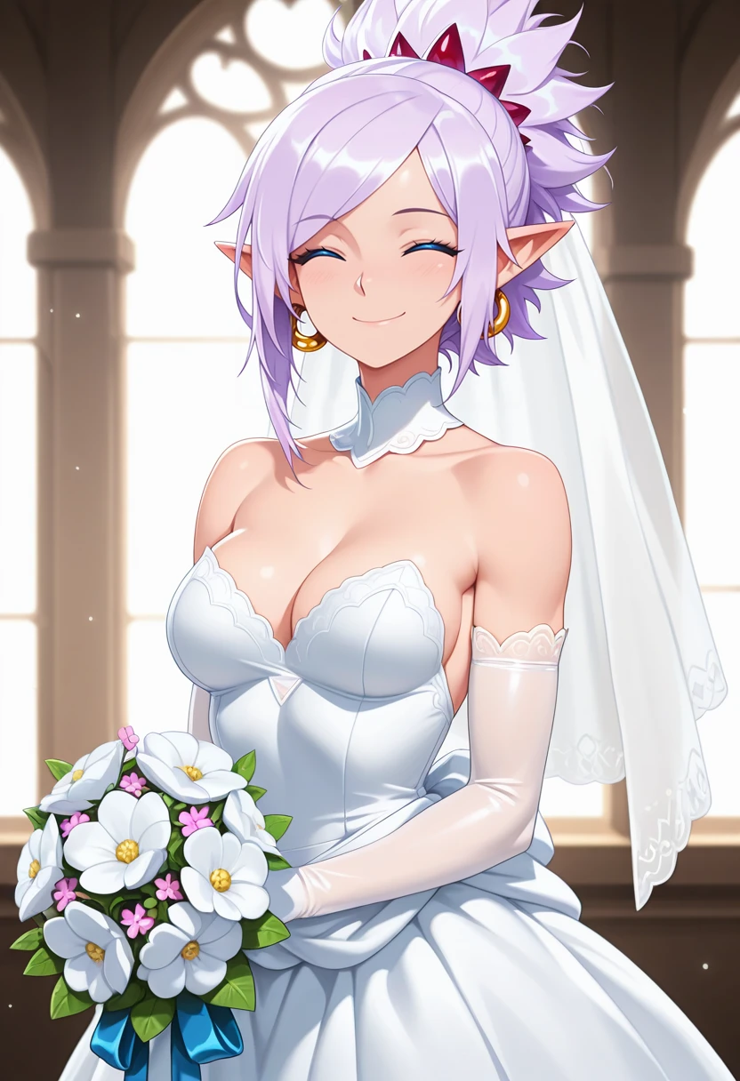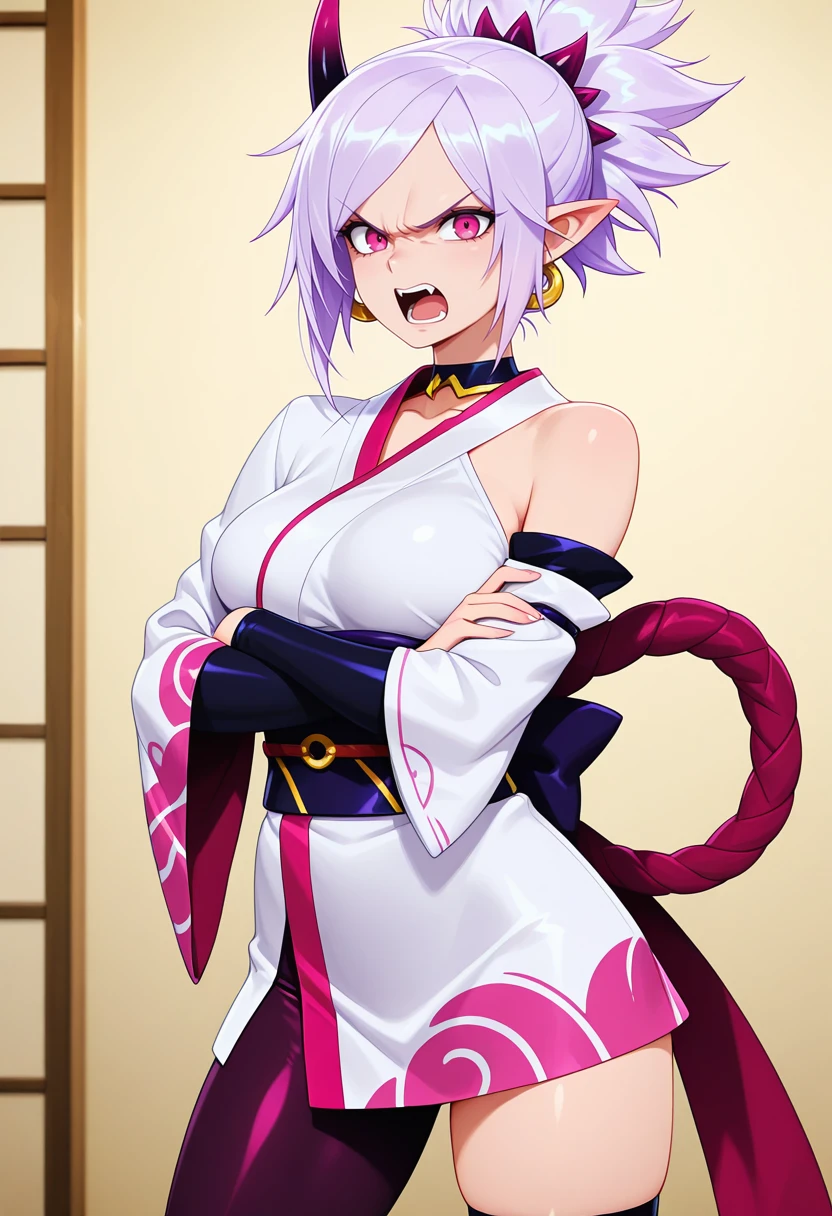 rivensb_nekoforge,1girl,blue eyes,tsurime,light purple hair,ponytail,pointy ears,aged up,medium breasts,