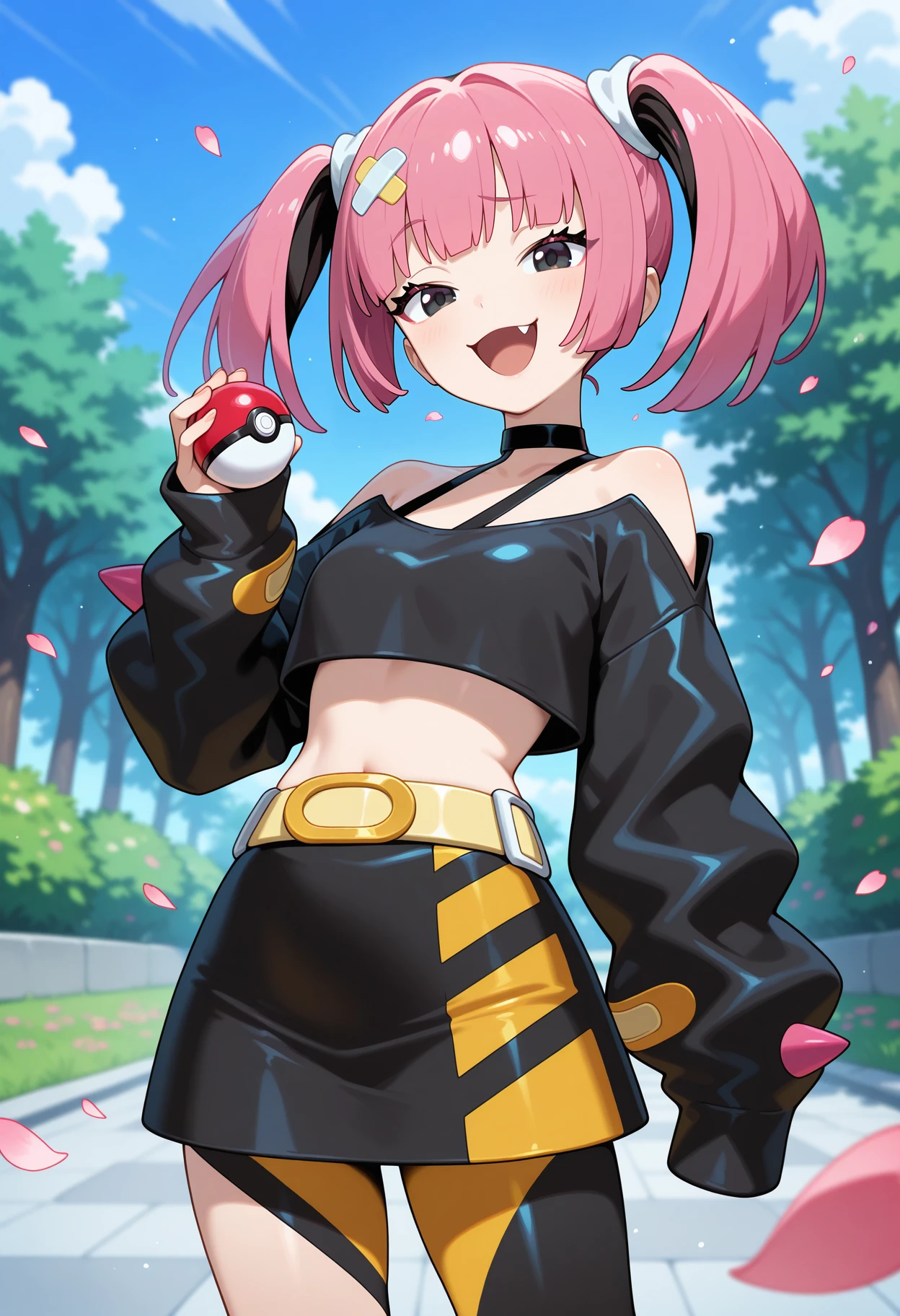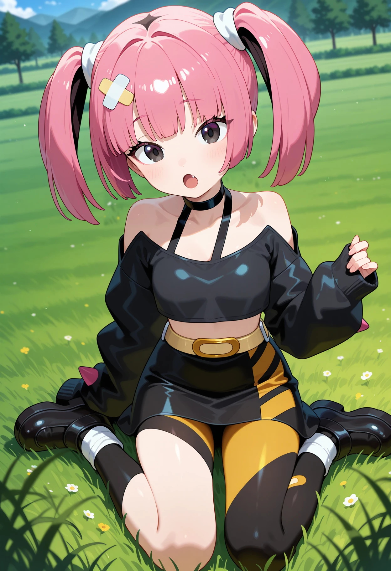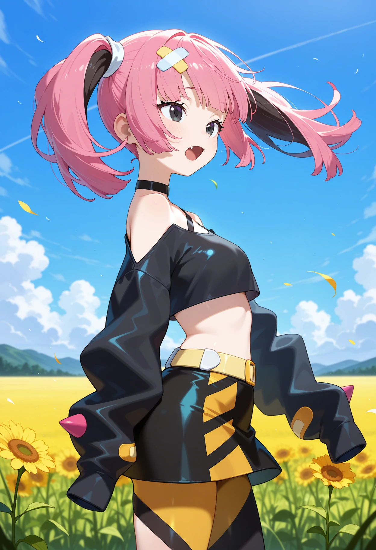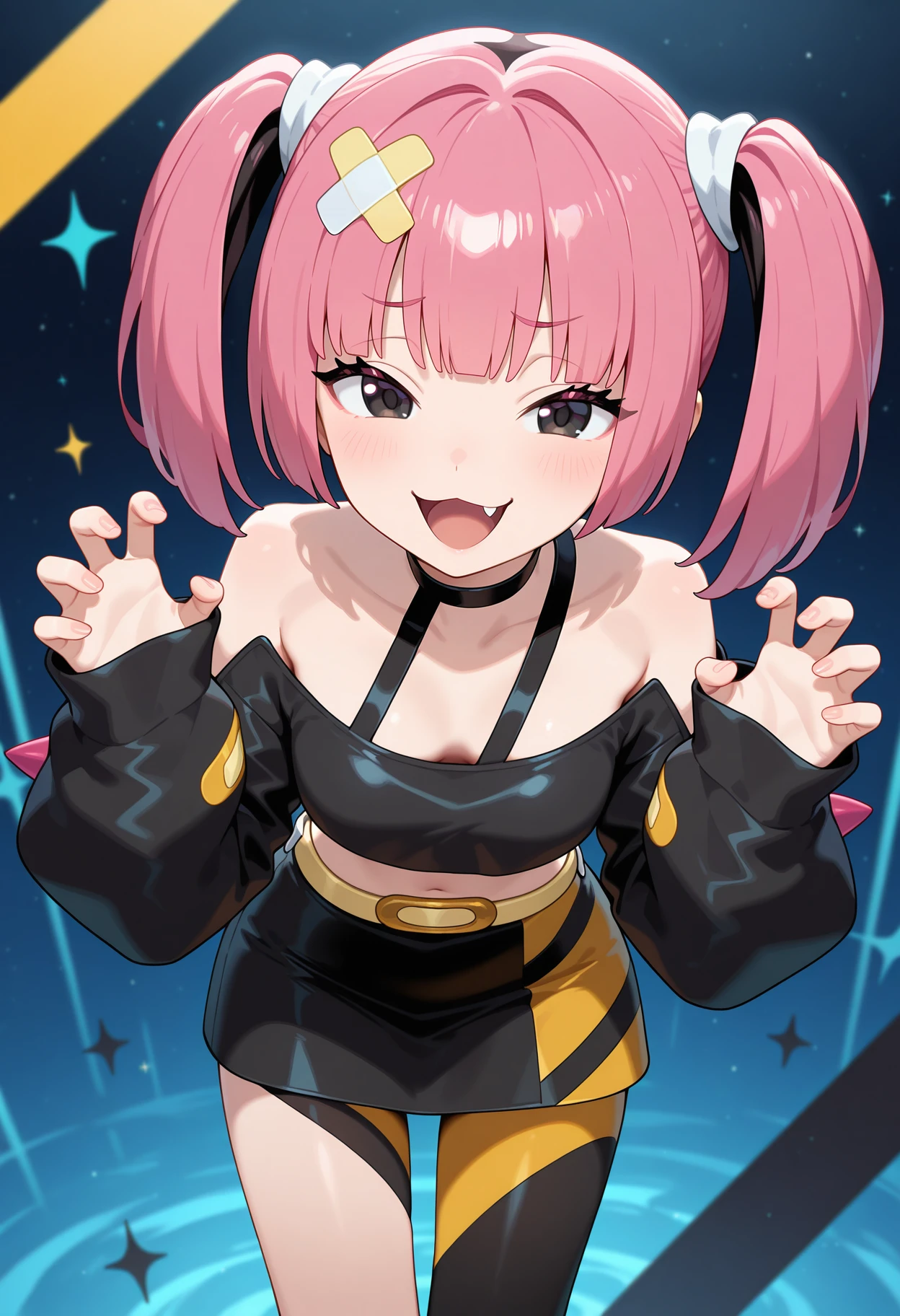 outfit1aacoral, pink hair, twintails, hair ornament, black eyes, fang, black choker, off shoulder, crop top, black shirt, long sleeves, sleeves past wrists, belt, black skirt, asymmetrical legwear, single leg pantyhose