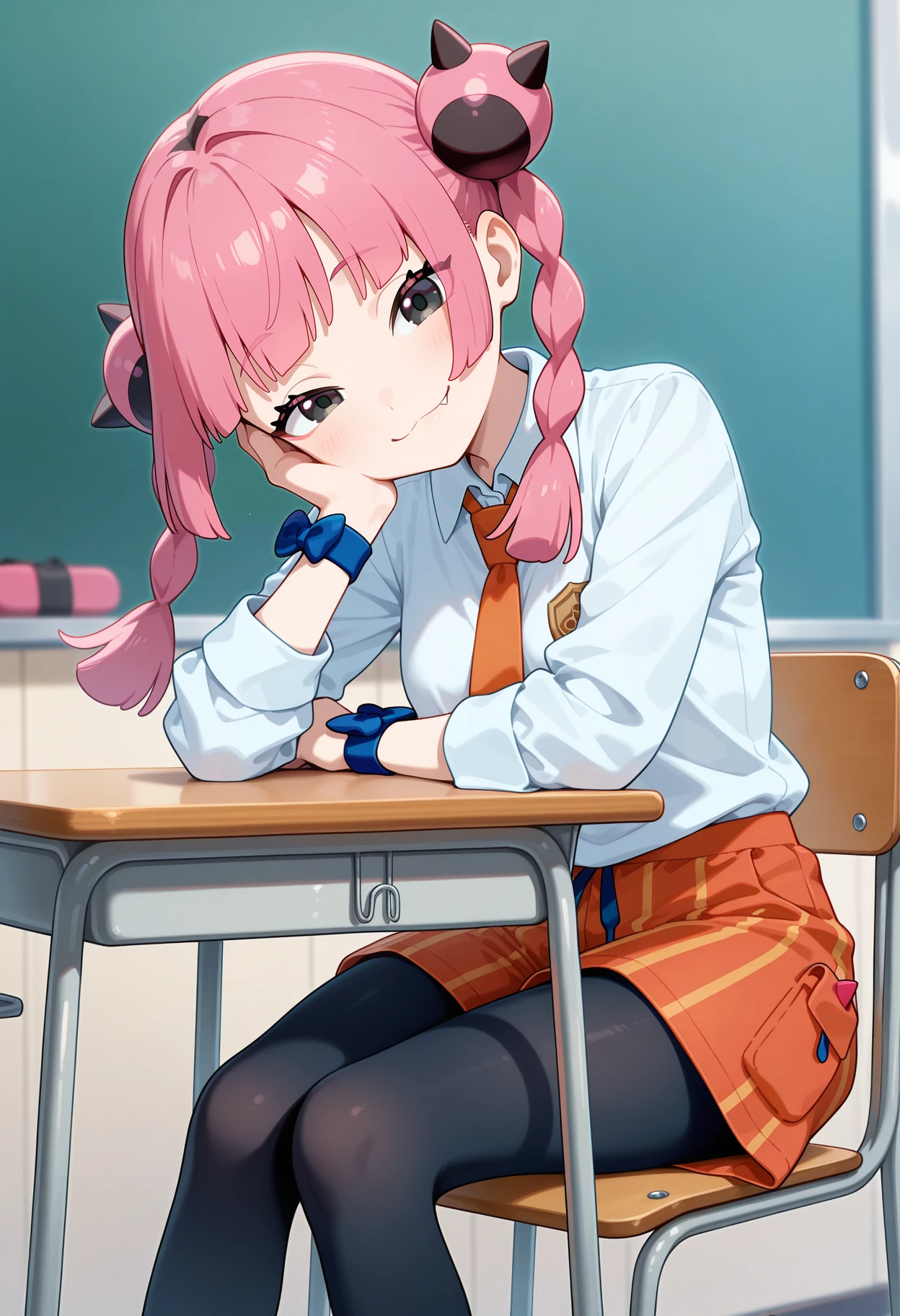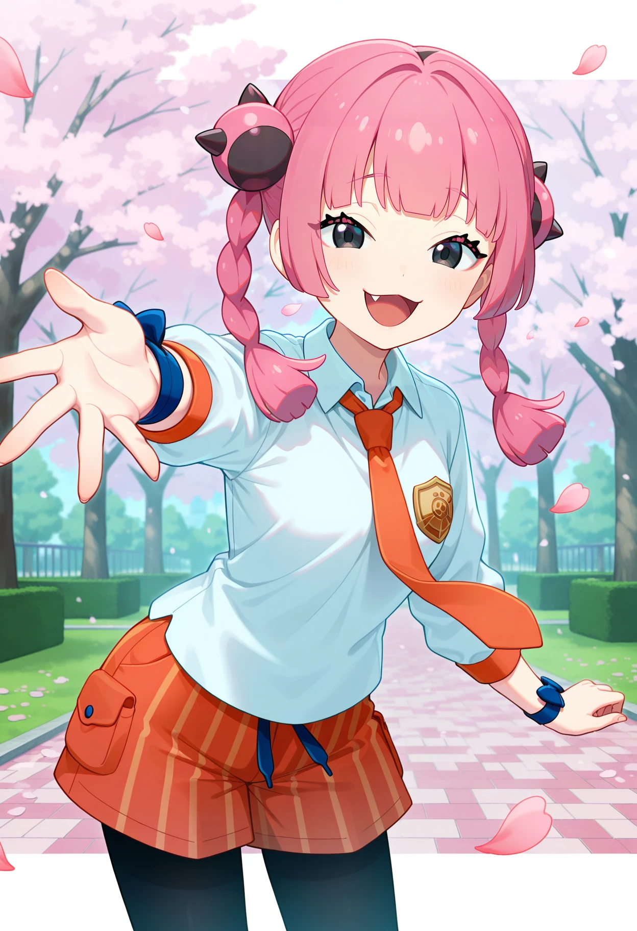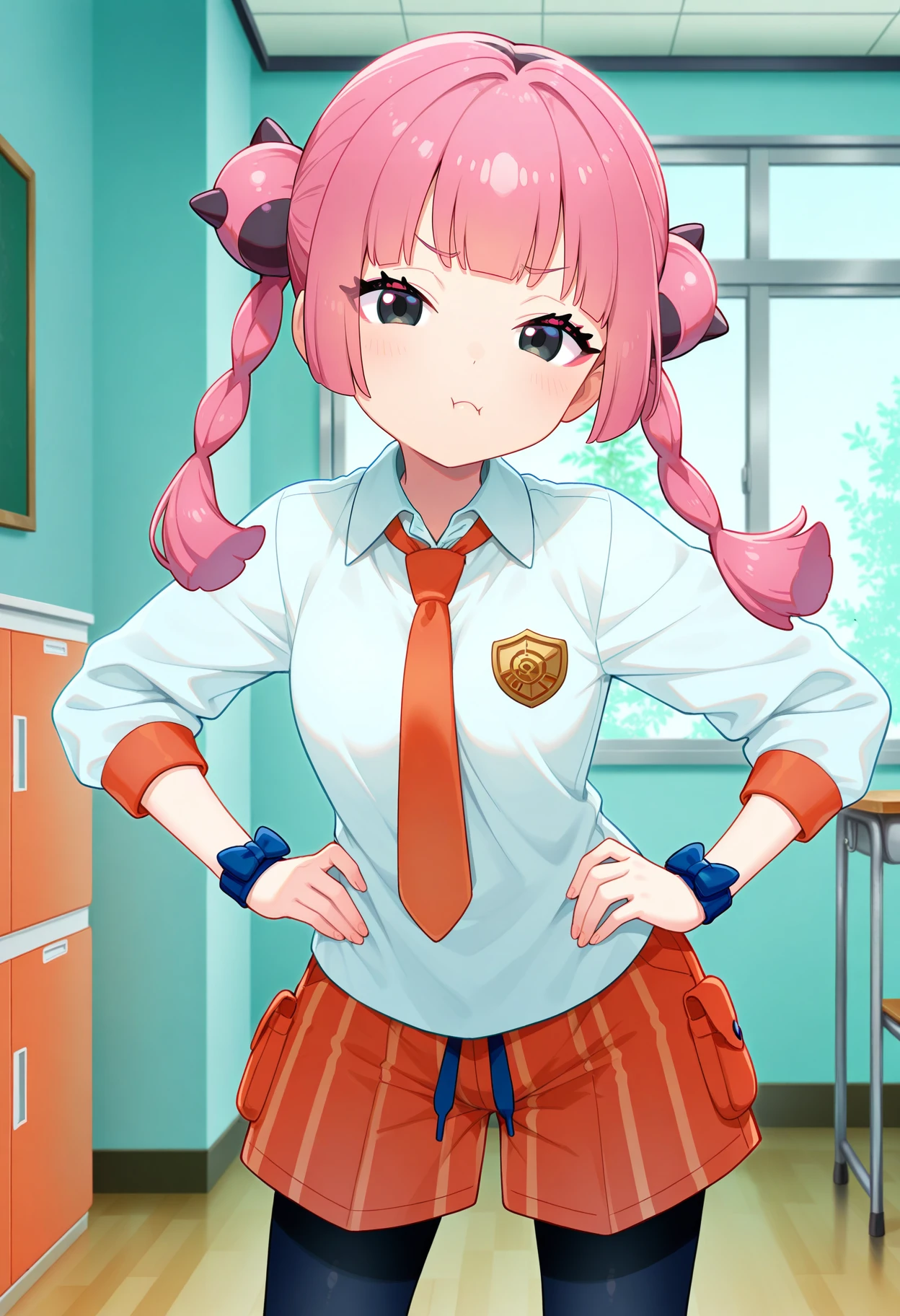 outfit2bbcoral, pink hair, twin braids, black eyes, fang, school uniform, orange necktie, collared shirt, white shirt, long sleeves, wristband, wrist bow, vertical-striped shorts, orange shorts, black pantyhose