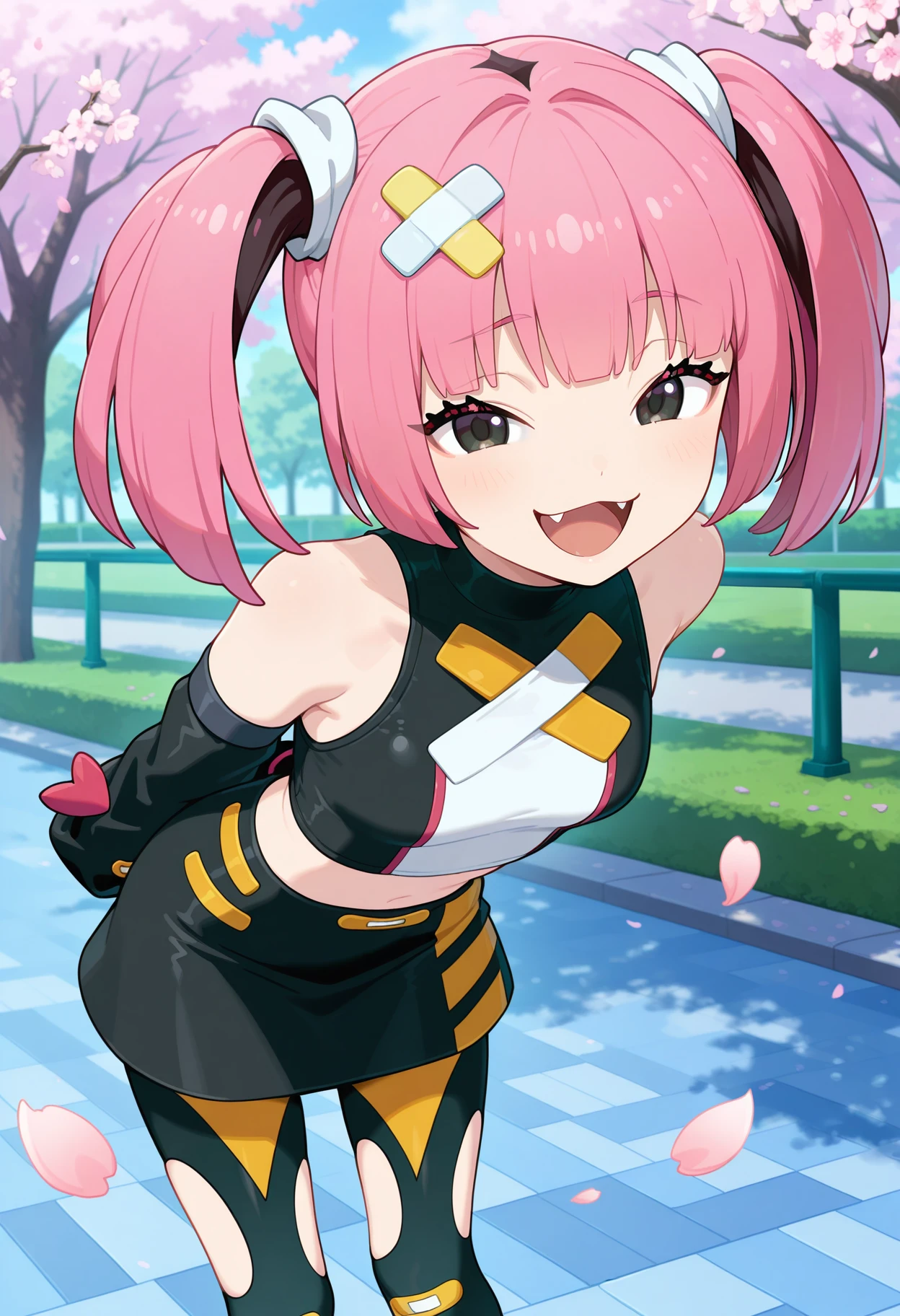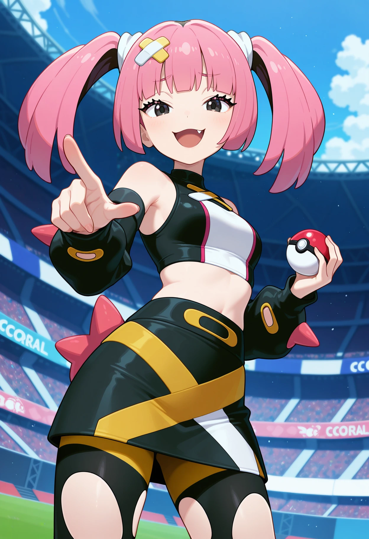 outfit3cccoral, pink hair, twintails, hair ornament, black eyes, fang, ???? shoulders, sleeveless shirt, detached sleeves, black sleeves, midriff, black skirt, thigh cutout, black pantyhose