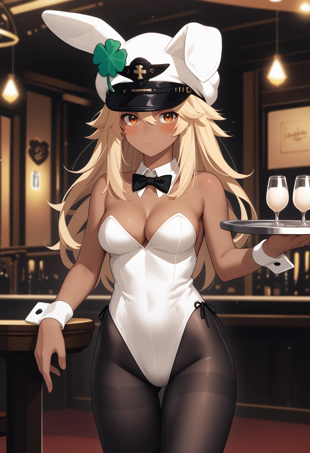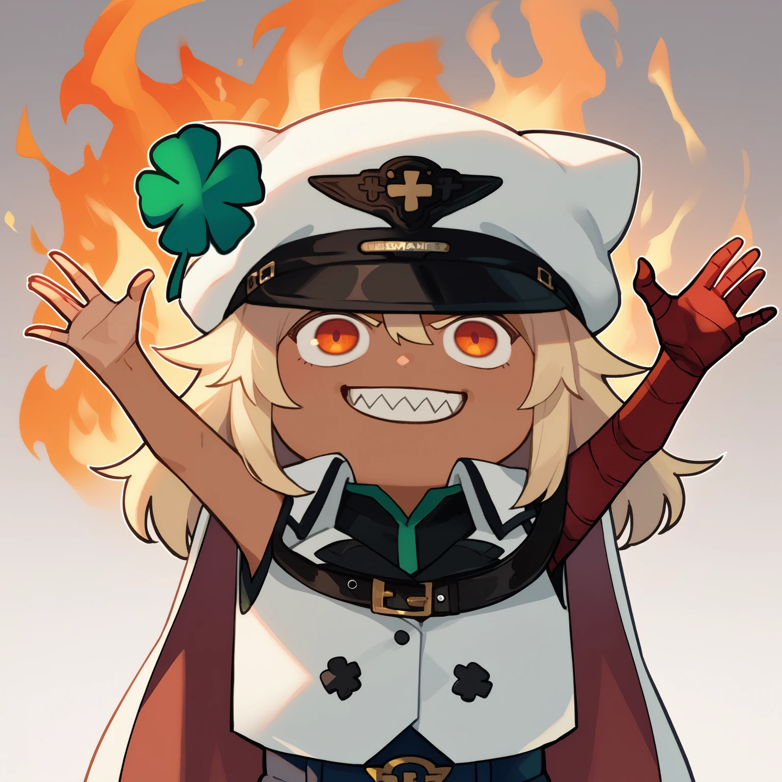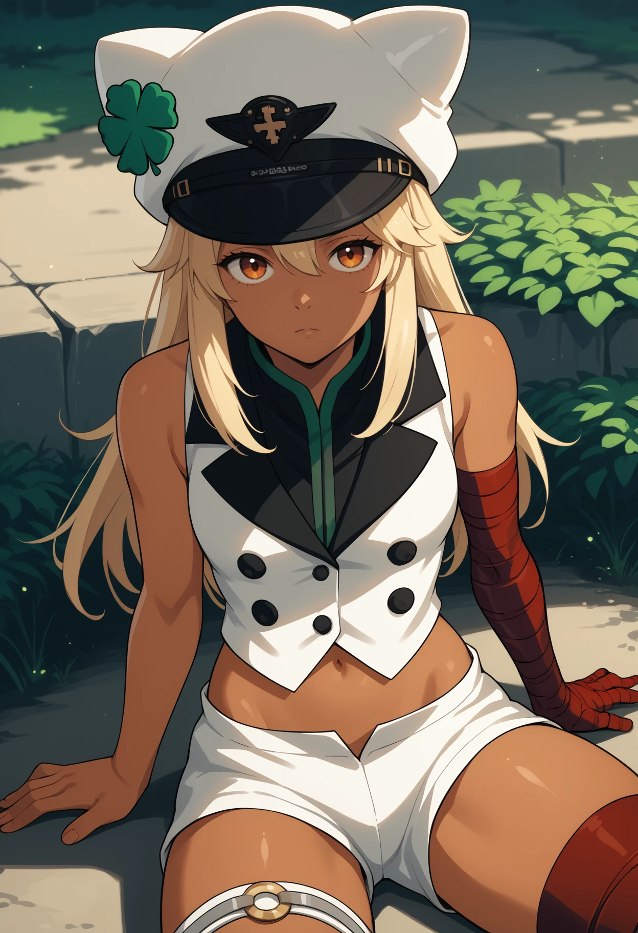 Default Outfit: white headwear, hat, four-leaf clover, white cape, collared cape, black belt, white vest, buttons, double-breasted, white gloves, fingerless gloves, white shorts, short shorts, thigh strap, bandages, bandaged arm, bandaged leg, midriff, navel