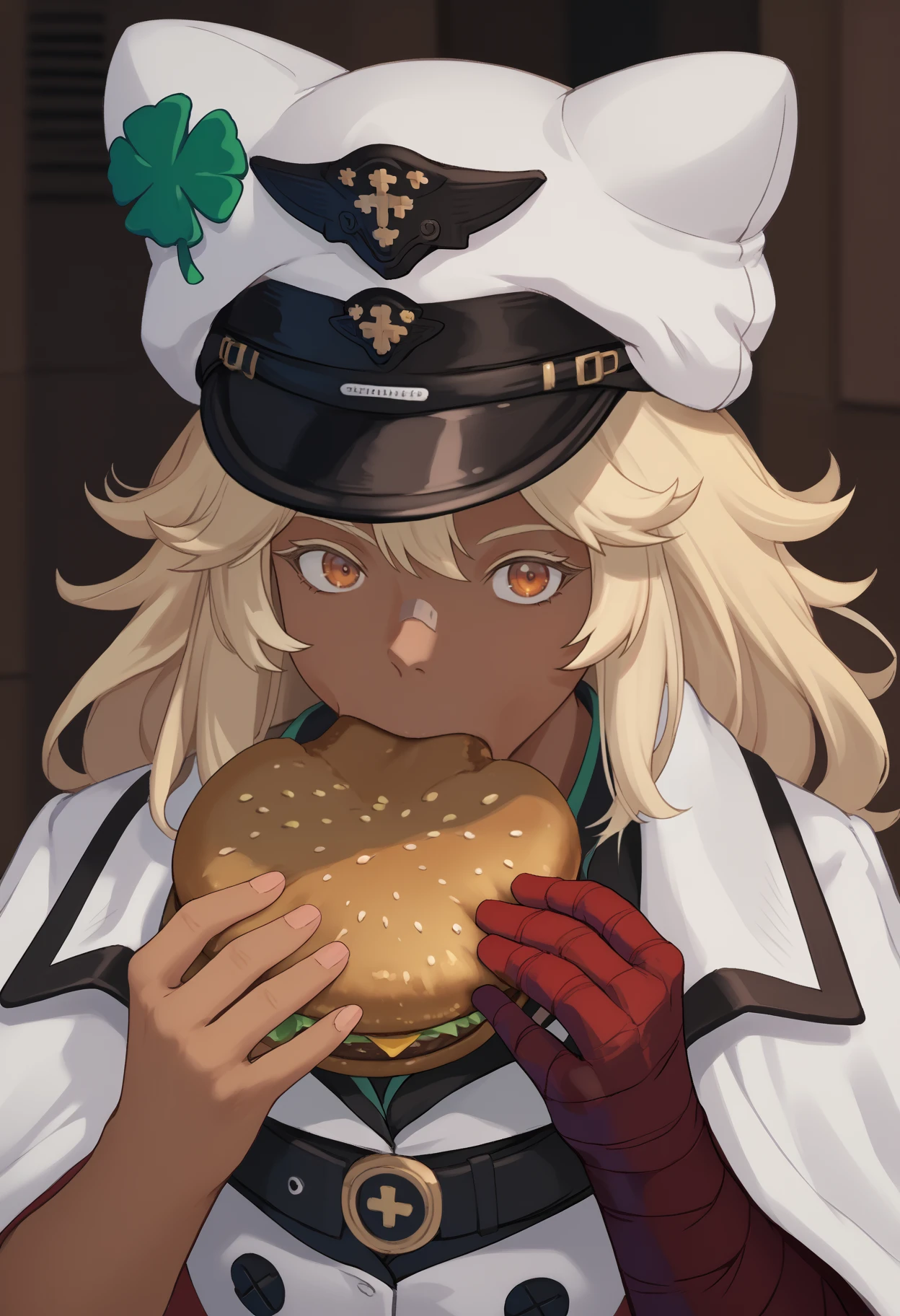 white headwear, hat, four-leaf clover, white cape, collared cape, black belt, white vest, buttons, double-breasted, white gloves, fingerless gloves, white shorts, short shorts, thigh strap, bandages, bandaged arm, bandaged leg, midriff, navel