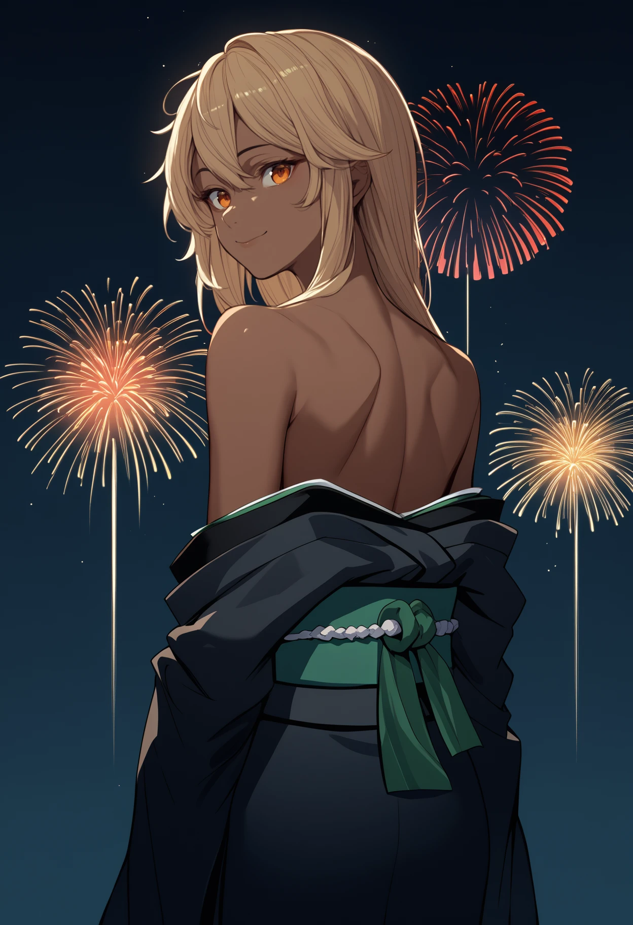 Trigger + Appearance: rmlthlvltne, dark-skinned female, long hair, blonde hair, orange eyes