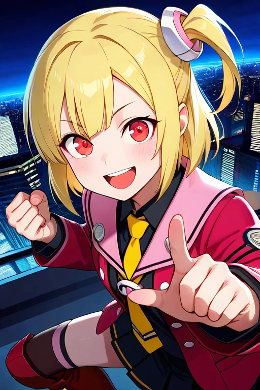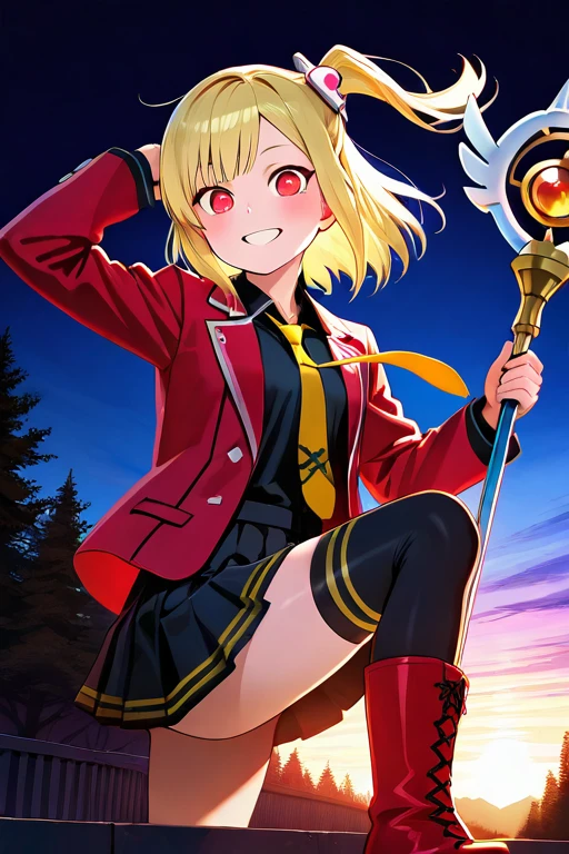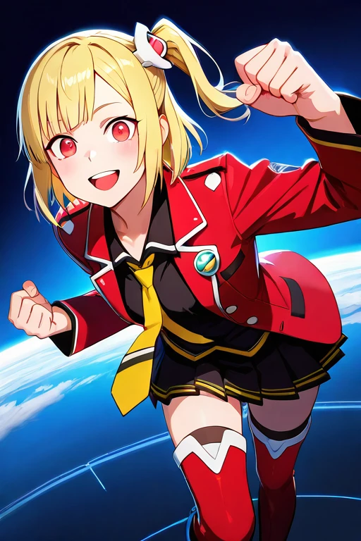 blonde hair, thighhighs,black skirt, boots, red eyes,yellow necktie,side tail,black shirt,red suit,