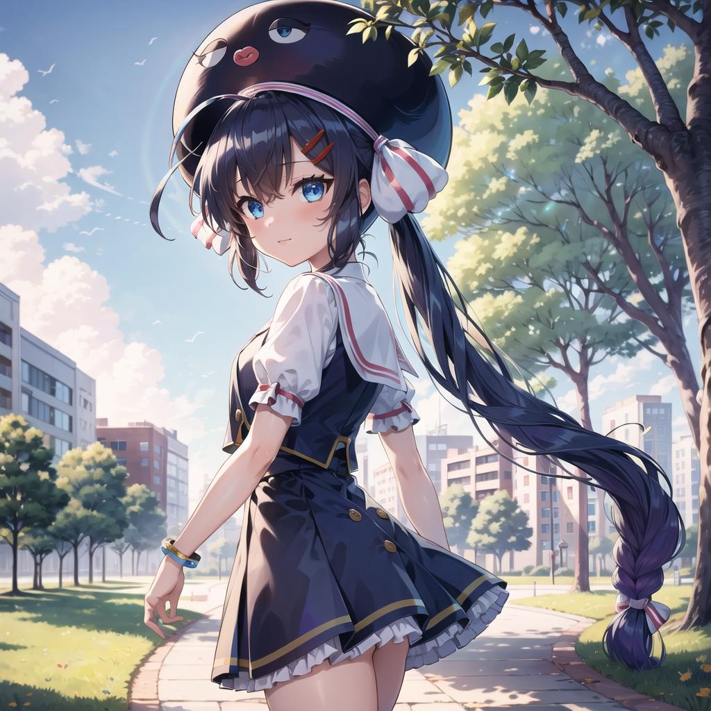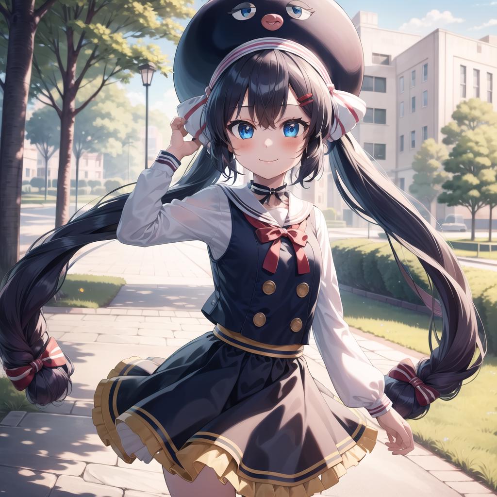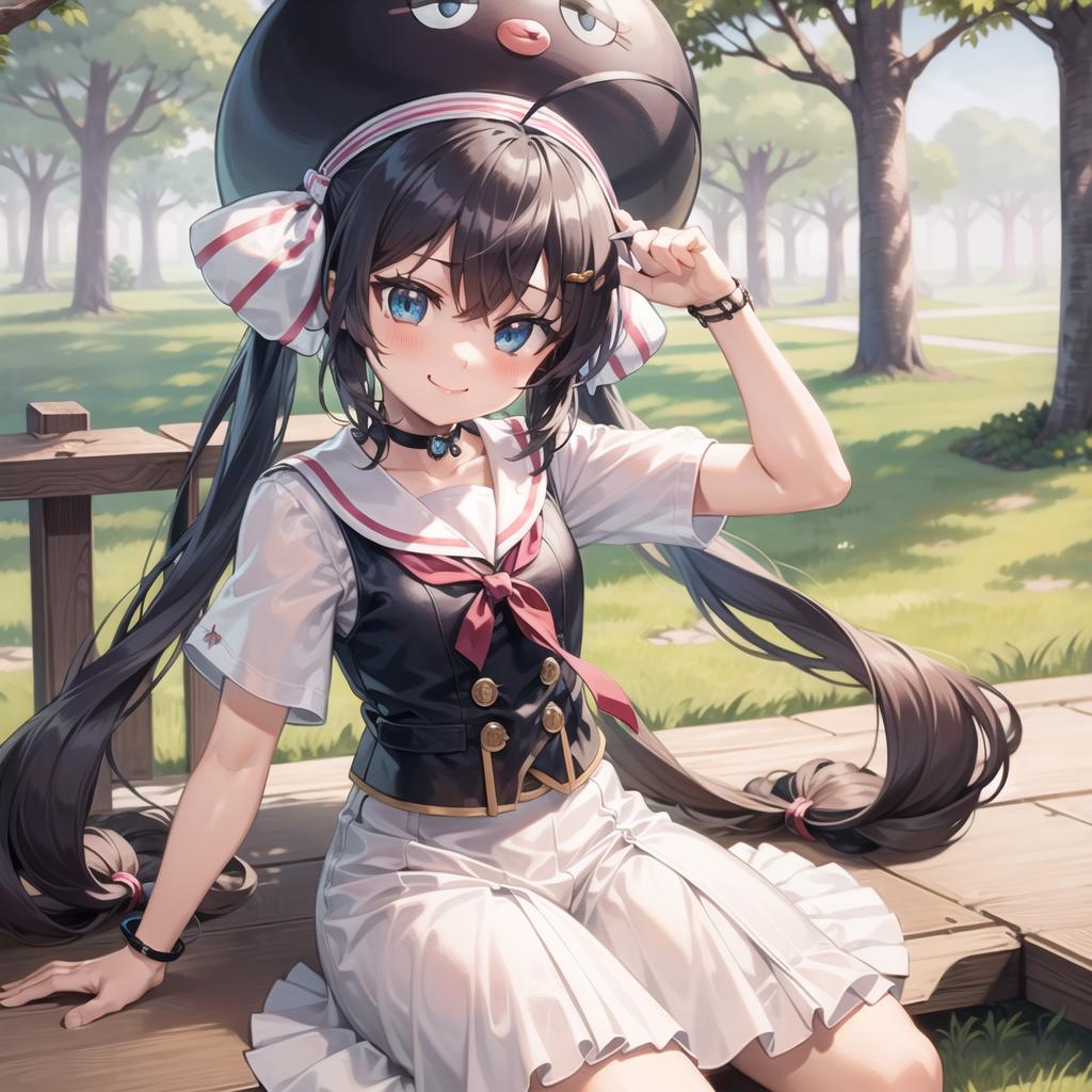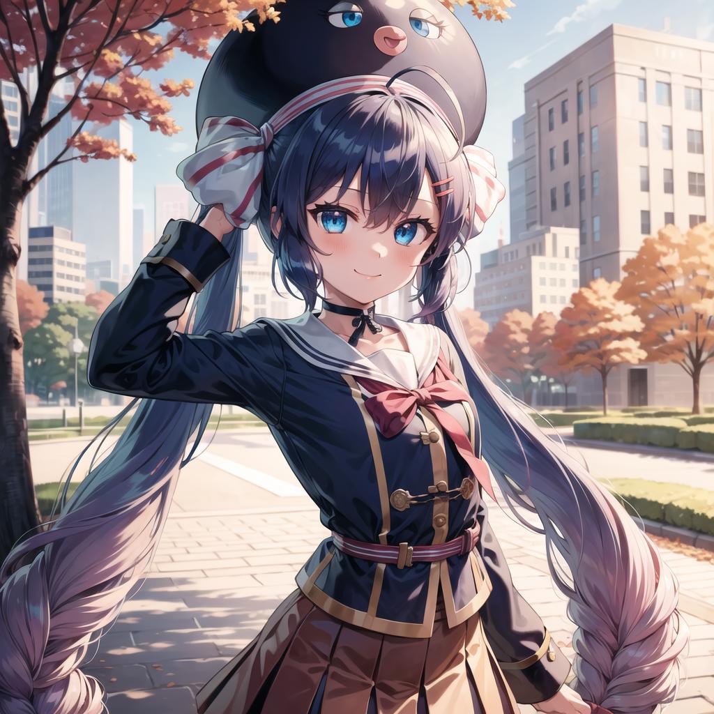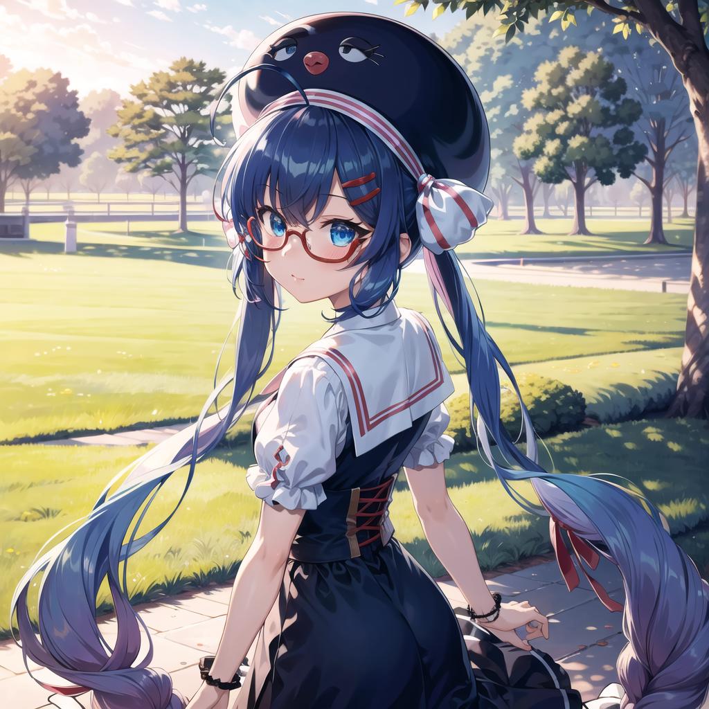 Otomachi Una, 1girl, long hair, twintails, blue eyes, ahoge, hair ornament, sailor collar, glasses, hairclip, red-framed eyewear, skirt, fang, hat, braid, gradient hair, bow