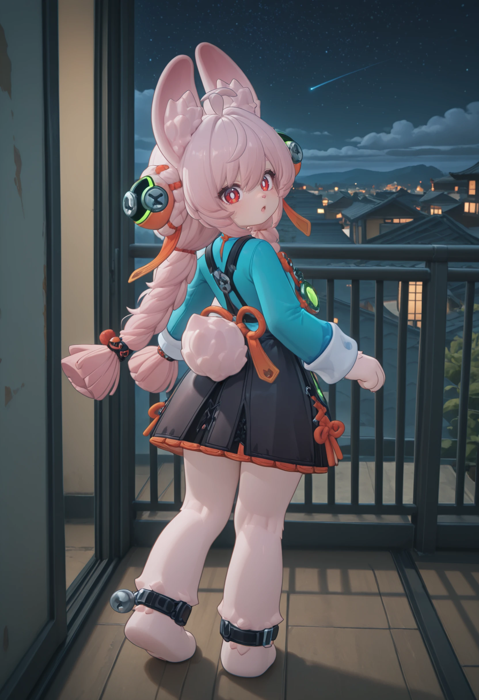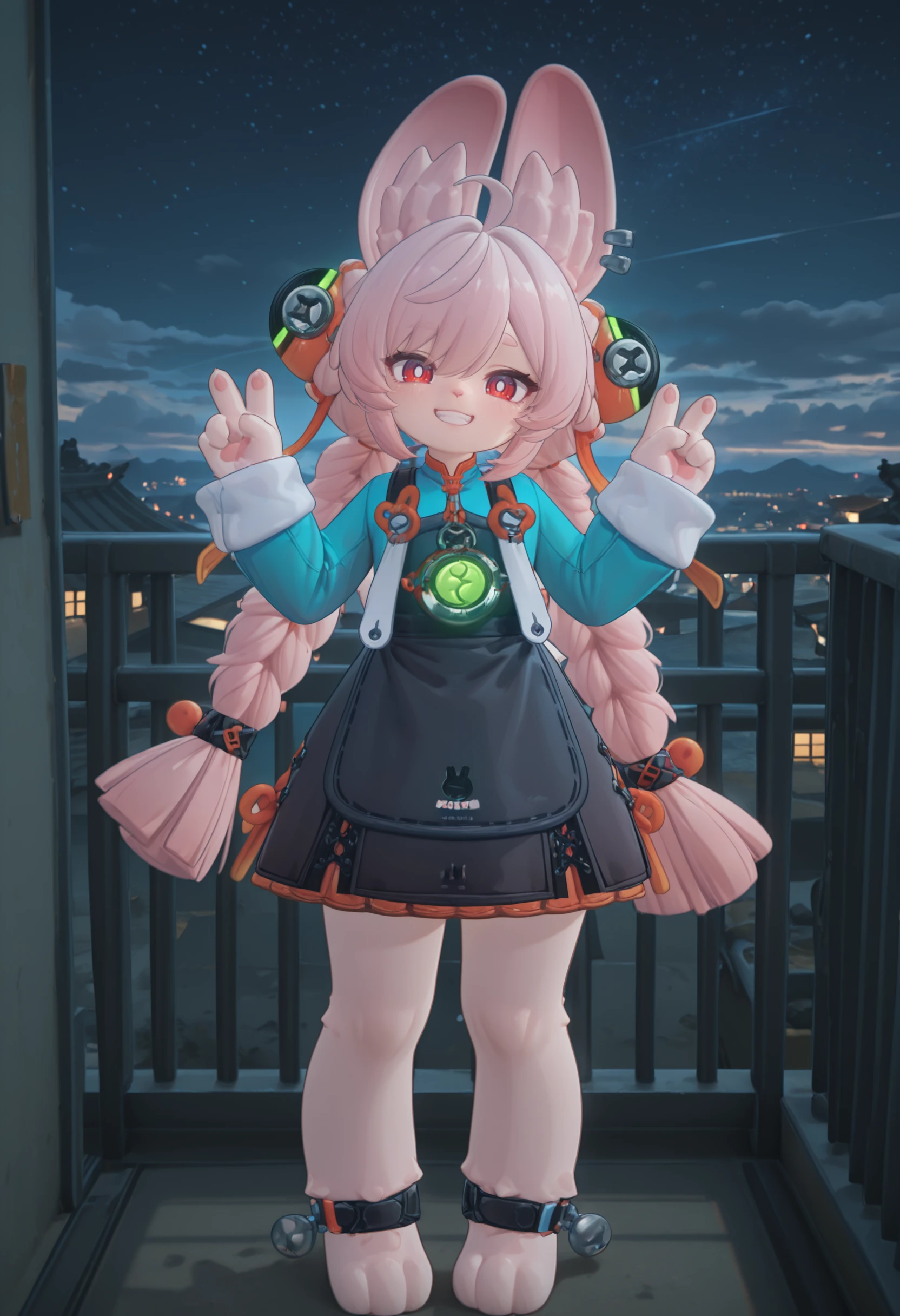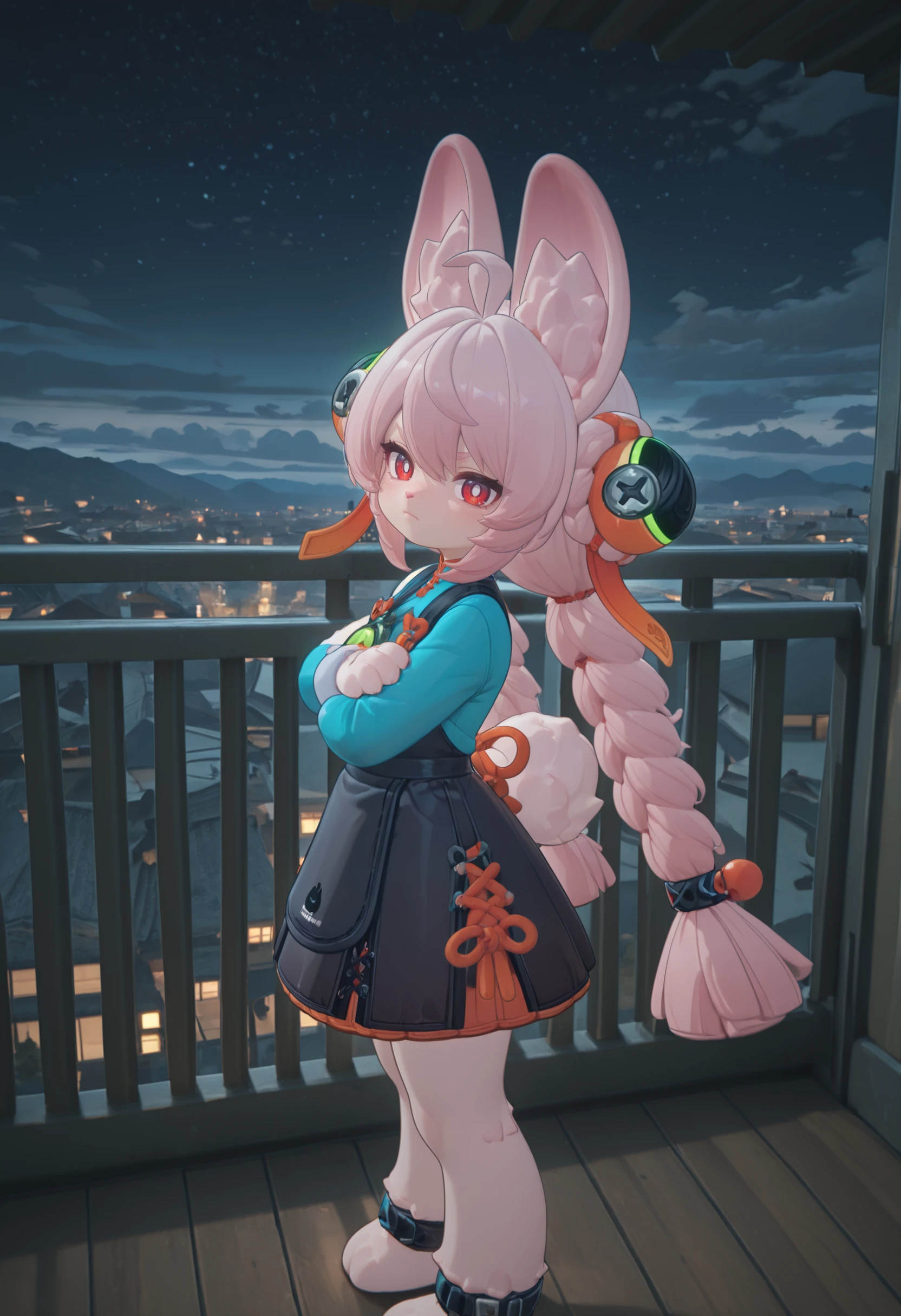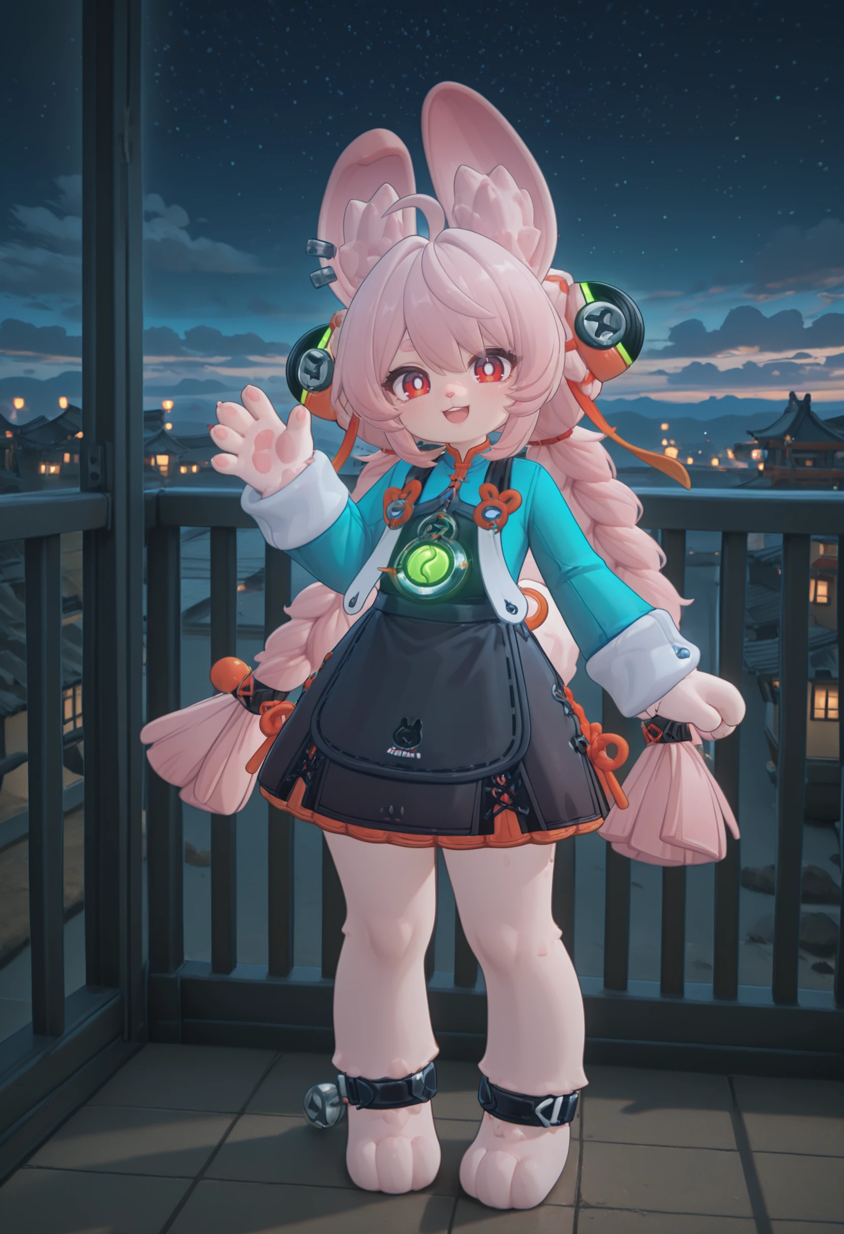 1girl, Zhao, child, bunny furry, pink hair, ahoge, twin braids, orange and green hair ornaments, hair between eyes, sideburns, rabbit ears, red eyes, white pupils, rabbit nose, pale skin, short, tiny, cute,