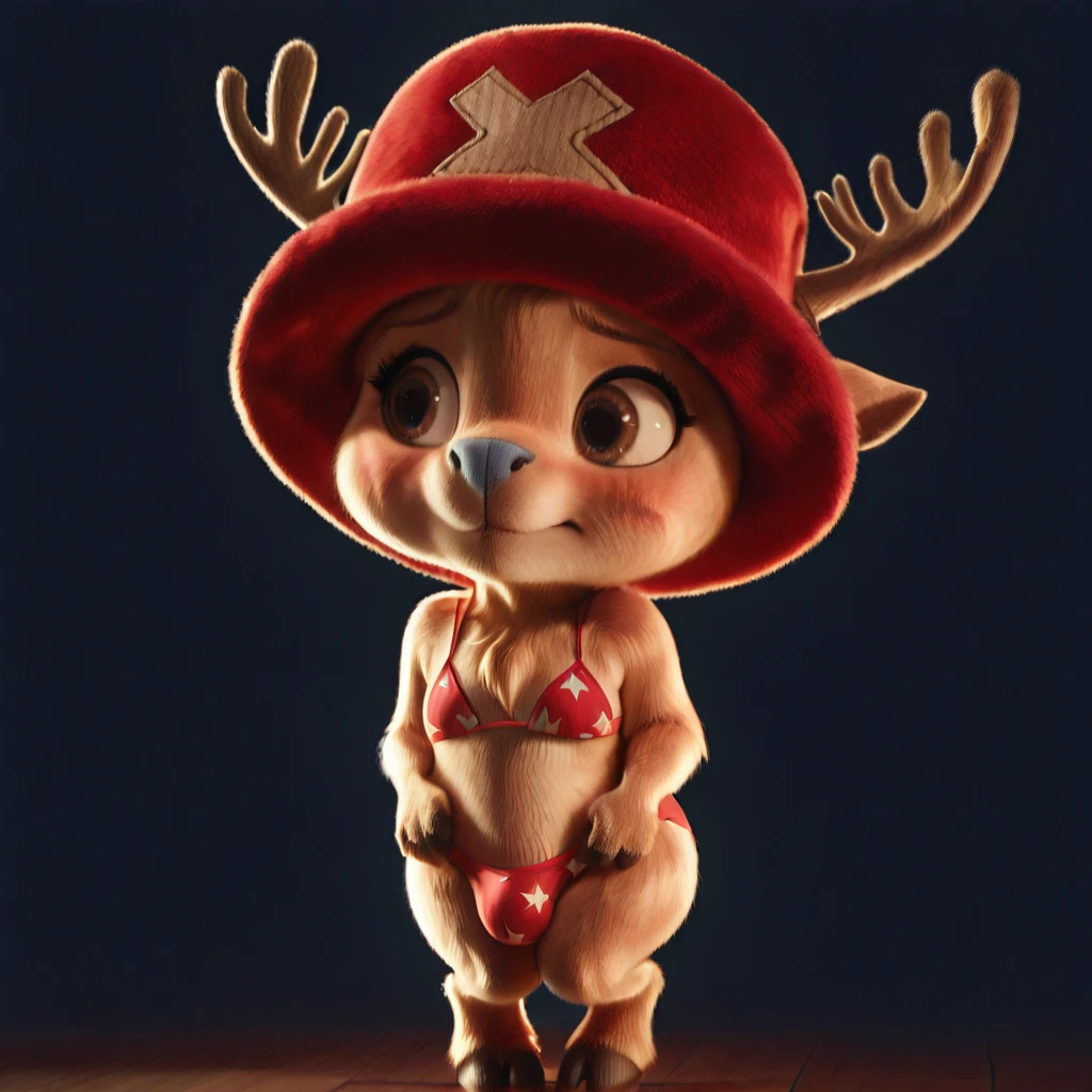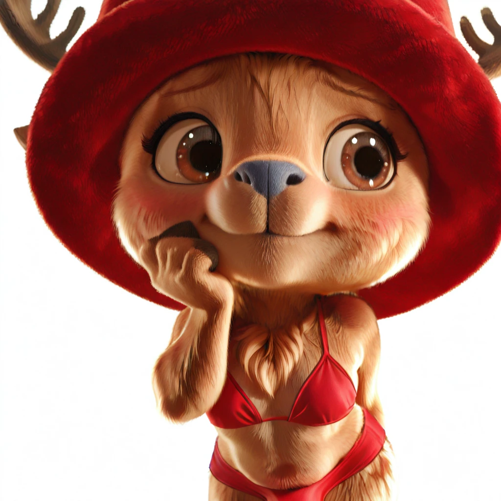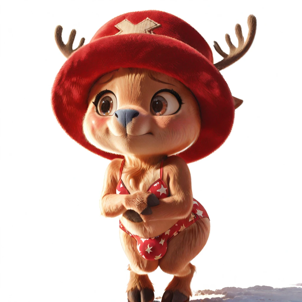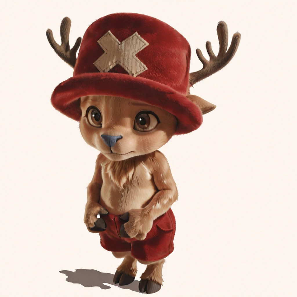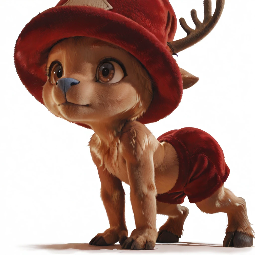 chopperopla_il, reindeer, furry male, brown fur, short stack, antlers, red hat, blue nose, brown eyes, red shorts, hooves,